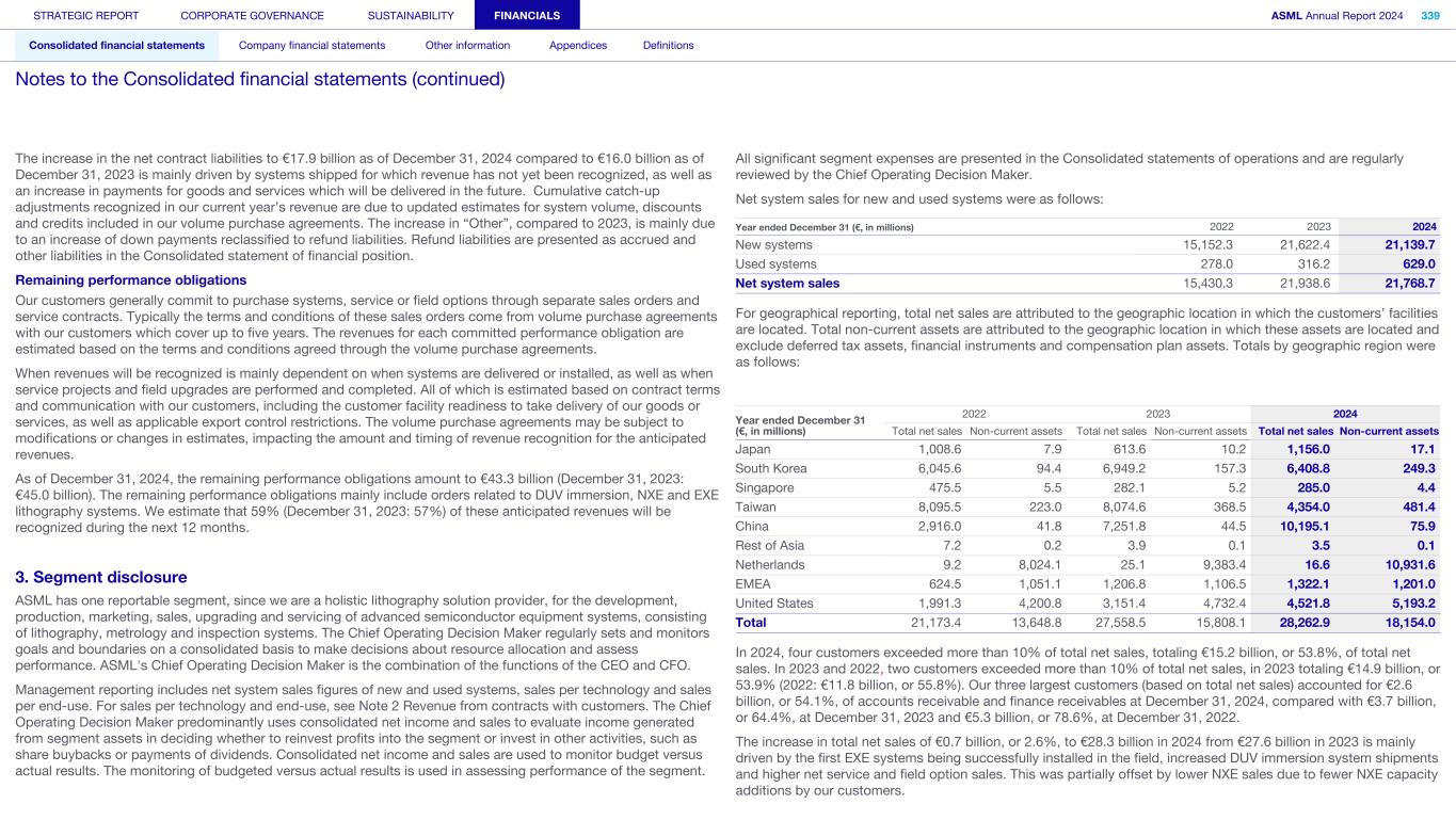 The increase in the net contract liabilities to €17.9 billion as of December 31, 2024 compared to €16.0 billion as of December 31, 2023 is mainly driven by systems shipped for which revenue has not yet been recognized, as well as an increase in payments for goods and services which will be delivered in the future. Cumulative catch-up adjustments recognized in our current year’s revenue are due to updated estimates for system volume, discounts and credits included in our volume purchase agreements. The increase in “Other”, compared to 2023, is mainly due to an increase of down payments reclassified to refund liabilities. Refund liabilities are presented as accrued and other liabilities in the Consolidated statement of financial position. Remaining performance obligations Our customers generally commit to purchase systems, service or field options through separate sales orders and service contracts. Typically the terms and conditions of these sales orders come from volume purchase agreements with our customers which cover up to five years. The revenues for each committed performance obligation are estimated based on the terms and conditions agreed through the volume purchase agreements. When revenues will be recognized is mainly dependent on when systems are delivered or installed, as well as when service projects and field upgrades are performed and completed. All of which is estimated based on contract terms and communication with our customers, including the customer facility readiness to take delivery of our goods or services, as well as applicable export control restrictions. The volume purchase agreements may be subject to modifications or changes in estimates, impacting the amount and timing of revenue recognition for the anticipated revenues. As of December 31, 2024, the remaining performance obligations amount to €43.3 billion (December 31, 2023: €45.0 billion). The remaining performance obligations mainly include orders related to DUV immersion, NXE and EXE lithography systems. We estimate that 59% (December 31, 2023: 57%) of these anticipated revenues will be recognized during the next 12 months. 3. Segment disclosure ASML has one reportable segment, since we are a holistic lithography solution provider, for the development, production, marketing, sales, upgrading and servicing of advanced semiconductor equipment systems, consisting of lithography, metrology and inspection systems. The Chief Operating Decision Maker regularly sets and monitors goals and boundaries on a consolidated basis to make decisions about resource allocation and assess performance. ASML's Chief Operating Decision Maker is the combination of the functions of the CEO and CFO. Management reporting includes net system sales figures of new and used systems, sales per technology and sales per end-use. For sales per technology and end-use, see Note 2 Revenue from contracts with customers. The Chief Operating Decision Maker predominantly uses consolidated net income and sales to evaluate income generated from segment assets in deciding whether to reinvest profits into the segment or invest in other activities, such as share buybacks or payments of dividends. Consolidated net income and sales are used to monitor budget versus actual results. The monitoring of budgeted versus actual results is used in assessing performance of the segment. All significant segment expenses are presented in the Consolidated statements of operations and are regularly reviewed by the Chief Operating Decision Maker. Net system sales for new and used systems were as follows: Year ended December 31 (€, in millions) 2022 2023 2024 New systems 15,152.3 21,622.4 21,139.7 Used systems 278.0 316.2 629.0 Net system sales 15,430.3 21,938.6 21,768.7 For geographical reporting, total net sales are attributed to the geographic location in which the customers’ facilities are located. Total non-current assets are attributed to the geographic location in which these assets are located and exclude deferred tax assets, financial instruments and compensation plan assets. Totals by geographic region were as follows: Total net sales Non-current assets Total net sales Non-current assets Total net sales Non-current assets Japan 1,008.6 7.9 613.6 10.2 1,156.0 17.1 South Korea 6,045.6 94.4 6,949.2 157.3 6,408.8 249.3 Singapore 475.5 5.5 282.1 5.2 285.0 4.4 Taiwan 8,095.5 223.0 8,074.6 368.5 4,354.0 481.4 China 2,916.0 41.8 7,251.8 44.5 10,195.1 75.9 Rest of Asia 7.2 0.2 3.9 0.1 3.5 0.1 Netherlands 9.2 8,024.1 25.1 9,383.4 16.6 10,931.6 EMEA 624.5 1,051.1 1,206.8 1,106.5 1,322.1 1,201.0 United States 1,991.3 4,200.8 3,151.4 4,732.4 4,521.8 5,193.2 Total 21,173.4 13,648.8 27,558.5 15,808.1 28,262.9 18,154.0 Year ended December 31 (€, in millions) 2022 2023 2024 In 2024, four customers exceeded more than 10% of total net sales, totaling €15.2 billion, or 53.8%, of total net sales. In 2023 and 2022, two customers exceeded more than 10% of total net sales, in 2023 totaling €14.9 billion, or 53.9% (2022: €11.8 billion, or 55.8%). Our three largest customers (based on total net sales) accounted for €2.6 billion, or 54.1%, of accounts receivable and finance receivables at December 31, 2024, compared with €3.7 billion, or 64.4%, at December 31, 2023 and €5.3 billion, or 78.6%, at December 31, 2022. The increase in total net sales of €0.7 billion, or 2.6%, to €28.3 billion in 2024 from €27.6 billion in 2023 is mainly driven by the first EXE systems being successfully installed in the field, increased DUV immersion system shipments and higher net service and field option sales. This was partially offset by lower NXE sales due to fewer NXE capacity additions by our customers. STRATEGIC REPORT CORPORATE GOVERNANCE SUSTAINABILITY FINANCIALS ASML Annual Report 2024 339 Consolidated financial statements Company financial statements Other information Appendices Definitions Notes to the Consolidated financial statements (continued)