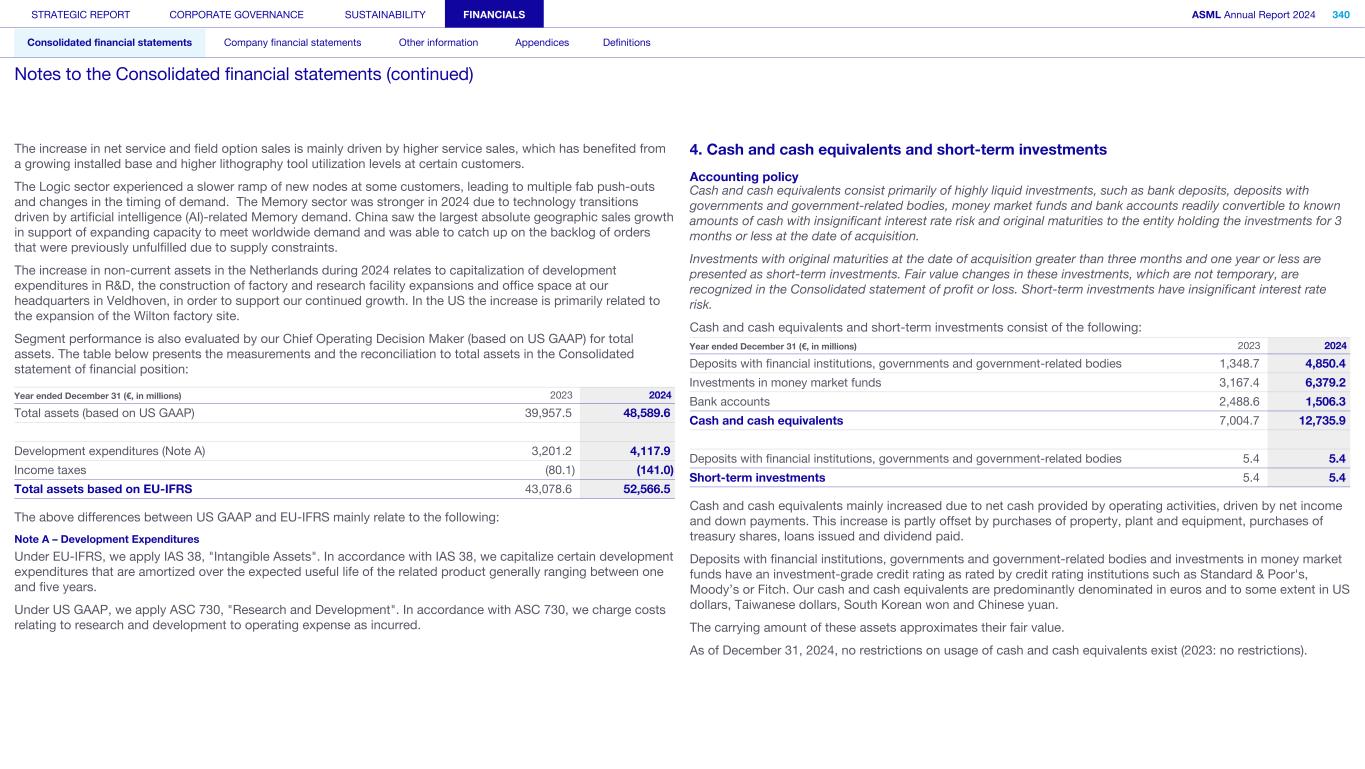 The increase in net service and field option sales is mainly driven by higher service sales, which has benefited from a growing installed base and higher lithography tool utilization levels at certain customers. The Logic sector experienced a slower ramp of new nodes at some customers, leading to multiple fab push-outs and changes in the timing of demand. The Memory sector was stronger in 2024 due to technology transitions driven by artificial intelligence (AI)-related Memory demand. China saw the largest absolute geographic sales growth in support of expanding capacity to meet worldwide demand and was able to catch up on the backlog of orders that were previously unfulfilled due to supply constraints. The increase in non-current assets in the Netherlands during 2024 relates to capitalization of development expenditures in R&D, the construction of factory and research facility expansions and office space at our headquarters in Veldhoven, in order to support our continued growth. In the US the increase is primarily related to the expansion of the Wilton factory site. Segment performance is also evaluated by our Chief Operating Decision Maker (based on US GAAP) for total assets. The table below presents the measurements and the reconciliation to total assets in the Consolidated statement of financial position: Year ended December 31 (€, in millions) 2023 2024 Total assets (based on US GAAP) 39,957.5 48,589.6 Development expenditures (Note A) 3,201.2 4,117.9 Income taxes (80.1) (141.0) Total assets based on EU-IFRS 43,078.6 52,566.5 The above differences between US GAAP and EU-IFRS mainly relate to the following: Note A – Development Expenditures Under EU-IFRS, we apply IAS 38, "Intangible Assets". In accordance with IAS 38, we capitalize certain development expenditures that are amortized over the expected useful life of the related product generally ranging between one and five years. Under US GAAP, we apply ASC 730, "Research and Development". In accordance with ASC 730, we charge costs relating to research and development to operating expense as incurred. 4. Cash and cash equivalents and short-term investments Accounting policy Cash and cash equivalents consist primarily of highly liquid investments, such as bank deposits, deposits with governments and government-related bodies, money market funds and bank accounts readily convertible to known amounts of cash with insignificant interest rate risk and original maturities to the entity holding the investments for 3 months or less at the date of acquisition. Investments with original maturities at the date of acquisition greater than three months and one year or less are presented as short-term investments. Fair value changes in these investments, which are not temporary, are recognized in the Consolidated statement of profit or loss. Short-term investments have insignificant interest rate risk. Cash and cash equivalents and short-term investments consist of the following: Year ended December 31 (€, in millions) 2023 2024 Deposits with financial institutions, governments and government-related bodies 1,348.7 4,850.4 Investments in money market funds 3,167.4 6,379.2 Bank accounts 2,488.6 1,506.3 Cash and cash equivalents 7,004.7 12,735.9 Deposits with financial institutions, governments and government-related bodies 5.4 5.4 Short-term investments 5.4 5.4 Cash and cash equivalents mainly increased due to net cash provided by operating activities, driven by net income and down payments. This increase is partly offset by purchases of property, plant and equipment, purchases of treasury shares, loans issued and dividend paid. Deposits with financial institutions, governments and government-related bodies and investments in money market funds have an investment-grade credit rating as rated by credit rating institutions such as Standard & Poor's, Moody’s or Fitch. Our cash and cash equivalents are predominantly denominated in euros and to some extent in US dollars, Taiwanese dollars, South Korean won and Chinese yuan. The carrying amount of these assets approximates their fair value. As of December 31, 2024, no restrictions on usage of cash and cash equivalents exist (2023: no restrictions). STRATEGIC REPORT CORPORATE GOVERNANCE SUSTAINABILITY FINANCIALS ASML Annual Report 2024 340 Consolidated financial statements Company financial statements Other information Appendices Definitions Notes to the Consolidated financial statements (continued)