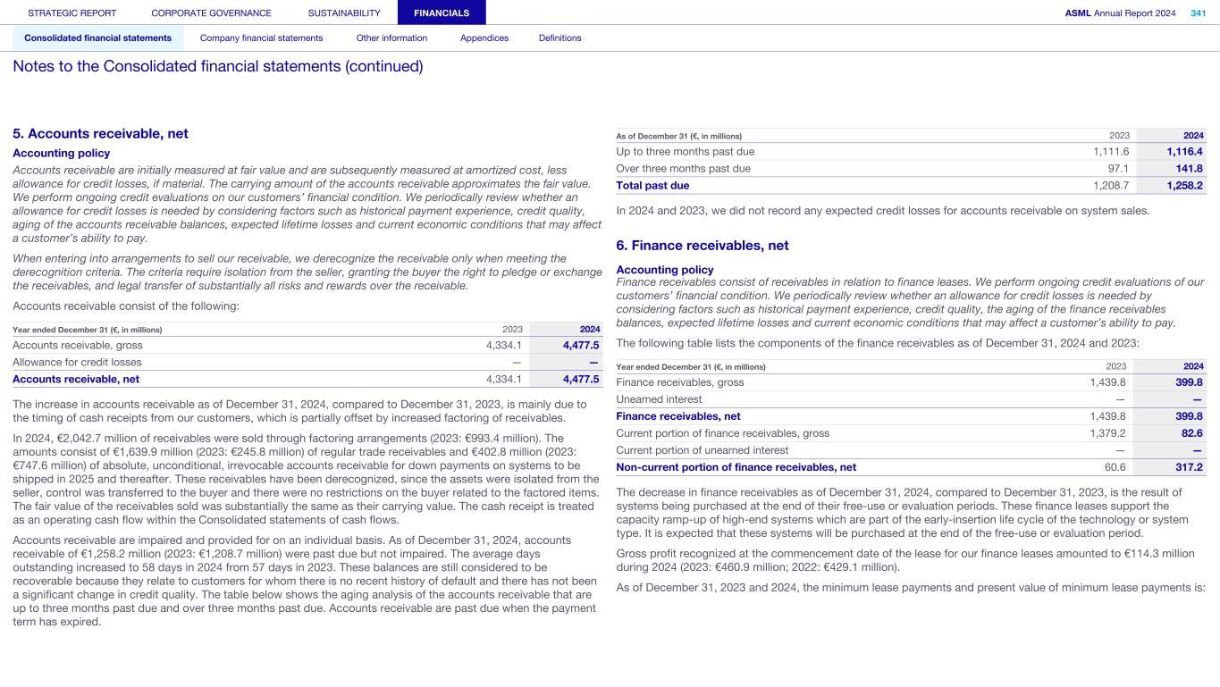 5. Accounts receivable, net Accounting policy Accounts receivable are initially measured at fair value and are subsequently measured at amortized cost, less allowance for credit losses, if material. The carrying amount of the accounts receivable approximates the fair value. We perform ongoing credit evaluations on our customers’ financial condition. We periodically review whether an allowance for credit losses is needed by considering factors such as historical payment experience, credit quality, aging of the accounts receivable balances, expected lifetime losses and current economic conditions that may affect a customer’s ability to pay. When entering into arrangements to sell our receivable, we derecognize the receivable only when meeting the derecognition criteria. The criteria require isolation from the seller, granting the buyer the right to pledge or exchange the receivables, and legal transfer of substantially all risks and rewards over the receivable. Accounts receivable consist of the following: Year ended December 31 (€, in millions) 2023 2024 Accounts receivable, gross 4,334.1 4,477.5 Allowance for credit losses — — Accounts receivable, net 4,334.1 4,477.5 The increase in accounts receivable as of December 31, 2024, compared to December 31, 2023, is mainly due to the timing of cash receipts from our customers, which is partially offset by increased factoring of receivables. In 2024, €2,042.7 million of receivables were sold through factoring arrangements (2023: €993.4 million). The amounts consist of €1,639.9 million (2023: €245.8 million) of regular trade receivables and €402.8 million (2023: €747.6 million) of absolute, unconditional, irrevocable accounts receivable for down payments on systems to be shipped in 2025 and thereafter. These receivables have been derecognized, since the assets were isolated from the seller, control was transferred to the buyer and there were no restrictions on the buyer related to the factored items. The fair value of the receivables sold was substantially the same as their carrying value. The cash receipt is treated as an operating cash flow within the Consolidated statements of cash flows. Accounts receivable are impaired and provided for on an individual basis. As of December 31, 2024, accounts receivable of €1,258.2 million (2023: €1,208.7 million) were past due but not impaired. The average days outstanding increased to 58 days in 2024 from 57 days in 2023. These balances are still considered to be recoverable because they relate to customers for whom there is no recent history of default and there has not been a significant change in credit quality. The table below shows the aging analysis of the accounts receivable that are up to three months past due and over three months past due. Accounts receivable are past due when the payment term has expired. As of December 31 (€, in millions) 2023 2024 Up to three months past due 1,111.6 1,116.4 Over three months past due 97.1 141.8 Total past due 1,208.7 1,258.2 In 2024 and 2023, we did not record any expected credit losses for accounts receivable on system sales. 6. Finance receivables, net Accounting policy Finance receivables consist of receivables in relation to finance leases. We perform ongoing credit evaluations of our customers’ financial condition. We periodically review whether an allowance for credit losses is needed by considering factors such as historical payment experience, credit quality, the aging of the finance receivables balances, expected lifetime losses and current economic conditions that may affect a customer’s ability to pay. The following table lists the components of the finance receivables as of December 31, 2024 and 2023: Year ended December 31 (€, in millions) 2023 2024 Finance receivables, gross 1,439.8 399.8 Unearned interest — — Finance receivables, net 1,439.8 399.8 Current portion of finance receivables, gross 1,379.2 82.6 Current portion of unearned interest — — Non-current portion of finance receivables, net 60.6 317.2 The decrease in finance receivables as of December 31, 2024, compared to December 31, 2023, is the result of systems being purchased at the end of their free-use or evaluation periods. These finance leases support the capacity ramp-up of high-end systems which are part of the early-insertion life cycle of the technology or system type. It is expected that these systems will be purchased at the end of the free-use or evaluation period. Gross profit recognized at the commencement date of the lease for our finance leases amounted to €114.3 million during 2024 (2023: €460.9 million; 2022: €429.1 million). As of December 31, 2023 and 2024, the minimum lease payments and present value of minimum lease payments is: STRATEGIC REPORT CORPORATE GOVERNANCE SUSTAINABILITY FINANCIALS ASML Annual Report 2024 341 Consolidated financial statements Company financial statements Other information Appendices Definitions Notes to the Consolidated financial statements (continued)