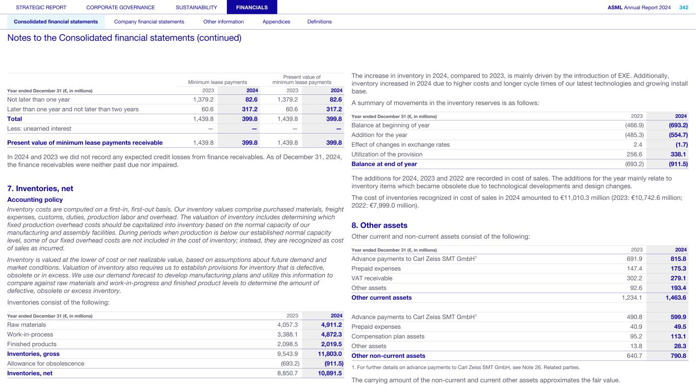 Minimum lease payments Present value of minimum lease payments Year ended December 31 (€, in millions) 2023 2024 2023 2024 Not later than one year 1,379.2 82.6 1,379.2 82.6 Later than one year and not later than two years 60.6 317.2 60.6 317.2 Total 1,439.8 399.8 1,439.8 399.8 Less: unearned interest — — — — Present value of minimum lease payments receivable 1,439.8 399.8 1,439.8 399.8 In 2024 and 2023 we did not record any expected credit losses from finance receivables. As of December 31, 2024, the finance receivables were neither past due nor impaired. 7. Inventories, net Accounting policy Inventory costs are computed on a first-in, first-out basis. Our inventory values comprise purchased materials, freight expenses, customs, duties, production labor and overhead. The valuation of inventory includes determining which fixed production overhead costs should be capitalized into inventory based on the normal capacity of our manufacturing and assembly facilities. During periods when production is below our established normal capacity level, some of our fixed overhead costs are not included in the cost of inventory; instead, they are recognized as cost of sales as incurred. Inventory is valued at the lower of cost or net realizable value, based on assumptions about future demand and market conditions. Valuation of inventory also requires us to establish provisions for inventory that is defective, obsolete or in excess. We use our demand forecast to develop manufacturing plans and utilize this information to compare against raw materials and work-in-progress and finished product levels to determine the amount of defective, obsolete or excess inventory. Inventories consist of the following: Year ended December 31 (€, in millions) 2023 2024 Raw materials 4,057.3 4,911.2 Work-in-process 3,388.1 4,872.3 Finished products 2,098.5 2,019.5 Inventories, gross 9,543.9 11,803.0 Allowance for obsolescence (693.2) (911.5) Inventories, net 8,850.7 10,891.5 The increase in inventory in 2024, compared to 2023, is mainly driven by the introduction of EXE. Additionally, inventory increased in 2024 due to higher costs and longer cycle times of our latest technologies and growing install base. A summary of movements in the inventory reserves is as follows: Year ended December 31 (€, in millions) 2023 2024 Balance at beginning of year (466.9) (693.2) Addition for the year (485.3) (554.7) Effect of changes in exchange rates 2.4 (1.7) Utilization of the provision 256.6 338.1 Balance at end of year (693.2) (911.5) The additions for 2024, 2023 and 2022 are recorded in cost of sales. The additions for the year mainly relate to inventory items which became obsolete due to technological developments and design changes. The cost of inventories recognized in cost of sales in 2024 amounted to €11,010.3 million (2023: €10,742.6 million; 2022: €7,999.0 million). 8. Other assets Other current and non-current assets consist of the following: Year ended December 31 (€, in millions) 2023 2024 Advance payments to Carl Zeiss SMT GmbH1 691.9 815.8 Prepaid expenses 147.4 175.3 VAT receivable 302.2 279.1 Other assets 92.6 193.4 Other current assets 1,234.1 1,463.6 Advance payments to Carl Zeiss SMT GmbH1 490.8 599.9 Prepaid expenses 40.9 49.5 Compensation plan assets 95.2 113.1 Other assets 13.8 28.3 Other non-current assets 640.7 790.8 1. For further details on advance payments to Carl Zeiss SMT GmbH, see Note 26. Related parties. The carrying amount of the non-current and current other assets approximates the fair value. STRATEGIC REPORT CORPORATE GOVERNANCE SUSTAINABILITY FINANCIALS ASML Annual Report 2024 342 Consolidated financial statements Company financial statements Other information Appendices Definitions Notes to the Consolidated financial statements (continued)