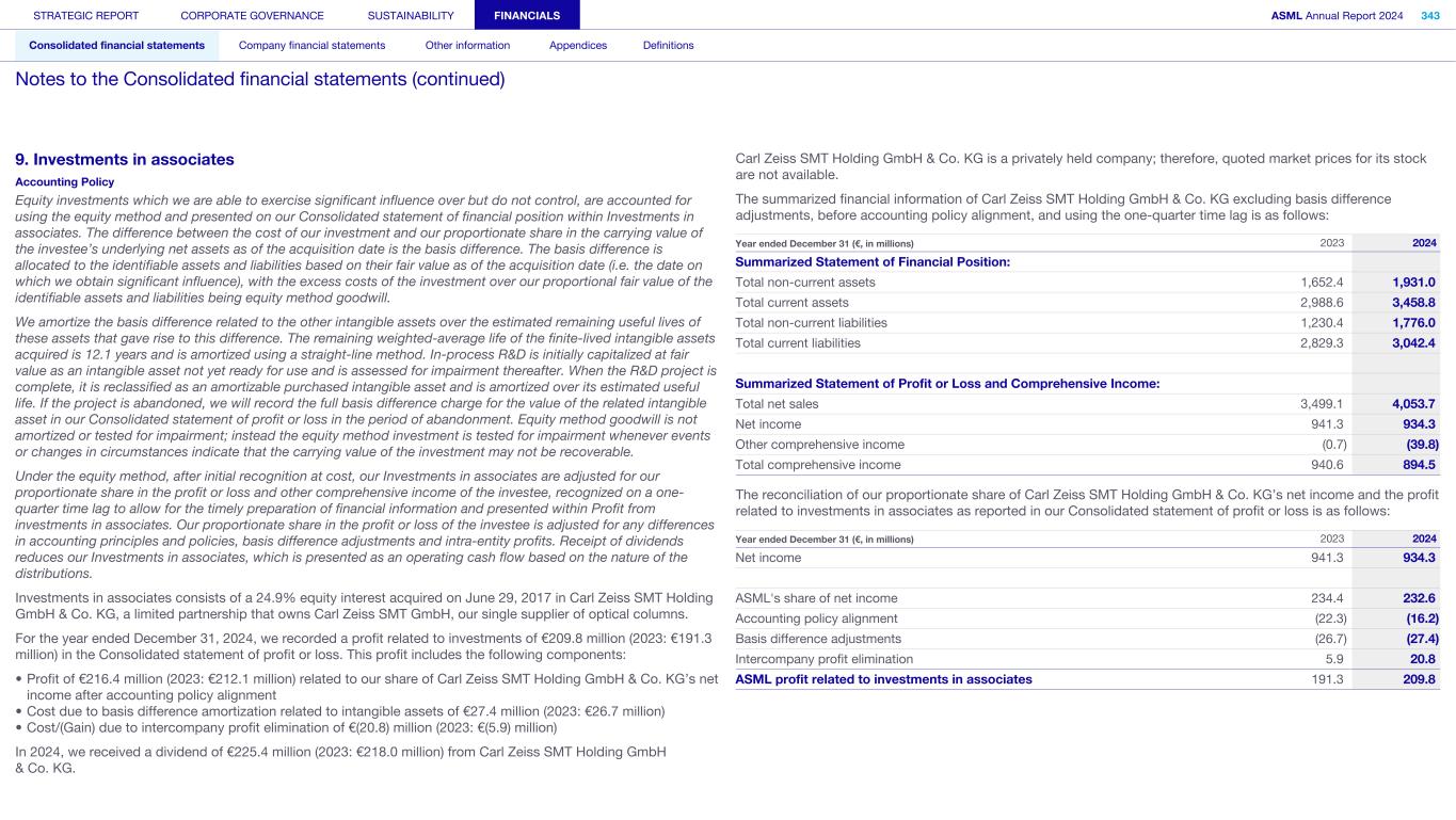 9. Investments in associates Accounting Policy Equity investments which we are able to exercise significant influence over but do not control, are accounted for using the equity method and presented on our Consolidated statement of financial position within Investments in associates. The difference between the cost of our investment and our proportionate share in the carrying value of the investee’s underlying net assets as of the acquisition date is the basis difference. The basis difference is allocated to the identifiable assets and liabilities based on their fair value as of the acquisition date (i.e. the date on which we obtain significant influence), with the excess costs of the investment over our proportional fair value of the identifiable assets and liabilities being equity method goodwill. We amortize the basis difference related to the other intangible assets over the estimated remaining useful lives of these assets that gave rise to this difference. The remaining weighted-average life of the finite-lived intangible assets acquired is 12.1 years and is amortized using a straight-line method. In-process R&D is initially capitalized at fair value as an intangible asset not yet ready for use and is assessed for impairment thereafter. When the R&D project is complete, it is reclassified as an amortizable purchased intangible asset and is amortized over its estimated useful life. If the project is abandoned, we will record the full basis difference charge for the value of the related intangible asset in our Consolidated statement of profit or loss in the period of abandonment. Equity method goodwill is not amortized or tested for impairment; instead the equity method investment is tested for impairment whenever events or changes in circumstances indicate that the carrying value of the investment may not be recoverable. Under the equity method, after initial recognition at cost, our Investments in associates are adjusted for our proportionate share in the profit or loss and other comprehensive income of the investee, recognized on a one- quarter time lag to allow for the timely preparation of financial information and presented within Profit from investments in associates. Our proportionate share in the profit or loss of the investee is adjusted for any differences in accounting principles and policies, basis difference adjustments and intra-entity profits. Receipt of dividends reduces our Investments in associates, which is presented as an operating cash flow based on the nature of the distributions. Investments in associates consists of a 24.9% equity interest acquired on June 29, 2017 in Carl Zeiss SMT Holding GmbH & Co. KG, a limited partnership that owns Carl Zeiss SMT GmbH, our single supplier of optical columns. For the year ended December 31, 2024, we recorded a profit related to investments of €209.8 million (2023: €191.3 million) in the Consolidated statement of profit or loss. This profit includes the following components: • Profit of €216.4 million (2023: €212.1 million) related to our share of Carl Zeiss SMT Holding GmbH & Co. KG’s net income after accounting policy alignment • Cost due to basis difference amortization related to intangible assets of €27.4 million (2023: €26.7 million) • Cost/(Gain) due to intercompany profit elimination of €(20.8) million (2023: €(5.9) million) In 2024, we received a dividend of €225.4 million (2023: €218.0 million) from Carl Zeiss SMT Holding GmbH & Co. KG. Carl Zeiss SMT Holding GmbH & Co. KG is a privately held company; therefore, quoted market prices for its stock are not available. The summarized financial information of Carl Zeiss SMT Holding GmbH & Co. KG excluding basis difference adjustments, before accounting policy alignment, and using the one-quarter time lag is as follows: Year ended December 31 (€, in millions) 2023 2024 Summarized Statement of Financial Position: Total non-current assets 1,652.4 1,931.0 Total current assets 2,988.6 3,458.8 Total non-current liabilities 1,230.4 1,776.0 Total current liabilities 2,829.3 3,042.4 Summarized Statement of Profit or Loss and Comprehensive Income: Total net sales 3,499.1 4,053.7 Net income 941.3 934.3 Other comprehensive income (0.7) (39.8) Total comprehensive income 940.6 894.5 The reconciliation of our proportionate share of Carl Zeiss SMT Holding GmbH & Co. KG’s net income and the profit related to investments in associates as reported in our Consolidated statement of profit or loss is as follows: Year ended December 31 (€, in millions) 2023 2024 Net income 941.3 934.3 ASML's share of net income 234.4 232.6 Accounting policy alignment (22.3) (16.2) Basis difference adjustments (26.7) (27.4) Intercompany profit elimination 5.9 20.8 ASML profit related to investments in associates 191.3 209.8 STRATEGIC REPORT CORPORATE GOVERNANCE SUSTAINABILITY FINANCIALS ASML Annual Report 2024 343 Consolidated financial statements Company financial statements Other information Appendices Definitions Notes to the Consolidated financial statements (continued)