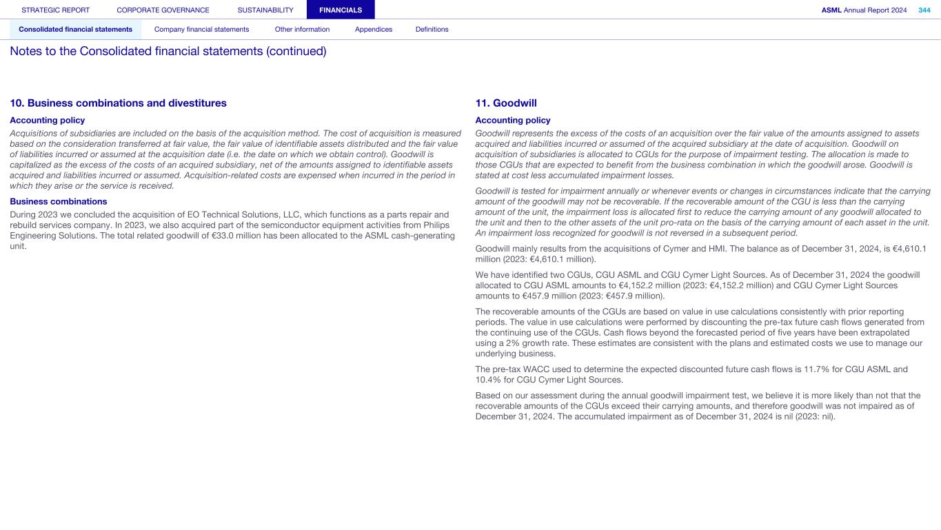 10. Business combinations and divestitures Accounting policy Acquisitions of subsidiaries are included on the basis of the acquisition method. The cost of acquisition is measured based on the consideration transferred at fair value, the fair value of identifiable assets distributed and the fair value of liabilities incurred or assumed at the acquisition date (i.e. the date on which we obtain control). Goodwill is capitalized as the excess of the costs of an acquired subsidiary, net of the amounts assigned to identifiable assets acquired and liabilities incurred or assumed. Acquisition-related costs are expensed when incurred in the period in which they arise or the service is received. Business combinations During 2023 we concluded the acquisition of EO Technical Solutions, LLC, which functions as a parts repair and rebuild services company. In 2023, we also acquired part of the semiconductor equipment activities from Philips Engineering Solutions. The total related goodwill of €33.0 million has been allocated to the ASML cash-generating unit. 11. Goodwill Accounting policy Goodwill represents the excess of the costs of an acquisition over the fair value of the amounts assigned to assets acquired and liabilities incurred or assumed of the acquired subsidiary at the date of acquisition. Goodwill on acquisition of subsidiaries is allocated to CGUs for the purpose of impairment testing. The allocation is made to those CGUs that are expected to benefit from the business combination in which the goodwill arose. Goodwill is stated at cost less accumulated impairment losses. Goodwill is tested for impairment annually or whenever events or changes in circumstances indicate that the carrying amount of the goodwill may not be recoverable. If the recoverable amount of the CGU is less than the carrying amount of the unit, the impairment loss is allocated first to reduce the carrying amount of any goodwill allocated to the unit and then to the other assets of the unit pro-rata on the basis of the carrying amount of each asset in the unit. An impairment loss recognized for goodwill is not reversed in a subsequent period. Goodwill mainly results from the acquisitions of Cymer and HMI. The balance as of December 31, 2024, is €4,610.1 million (2023: €4,610.1 million). We have identified two CGUs, CGU ASML and CGU Cymer Light Sources. As of December 31, 2024 the goodwill allocated to CGU ASML amounts to €4,152.2 million (2023: €4,152.2 million) and CGU Cymer Light Sources amounts to €457.9 million (2023: €457.9 million). The recoverable amounts of the CGUs are based on value in use calculations consistently with prior reporting periods. The value in use calculations were performed by discounting the pre-tax future cash flows generated from the continuing use of the CGUs. Cash flows beyond the forecasted period of five years have been extrapolated using a 2% growth rate. These estimates are consistent with the plans and estimated costs we use to manage our underlying business. The pre-tax WACC used to determine the expected discounted future cash flows is 11.7% for CGU ASML and 10.4% for CGU Cymer Light Sources. Based on our assessment during the annual goodwill impairment test, we believe it is more likely than not that the recoverable amounts of the CGUs exceed their carrying amounts, and therefore goodwill was not impaired as of December 31, 2024. The accumulated impairment as of December 31, 2024 is nil (2023: nil). STRATEGIC REPORT CORPORATE GOVERNANCE SUSTAINABILITY FINANCIALS ASML Annual Report 2024 344 Consolidated financial statements Company financial statements Other information Appendices Definitions Notes to the Consolidated financial statements (continued)