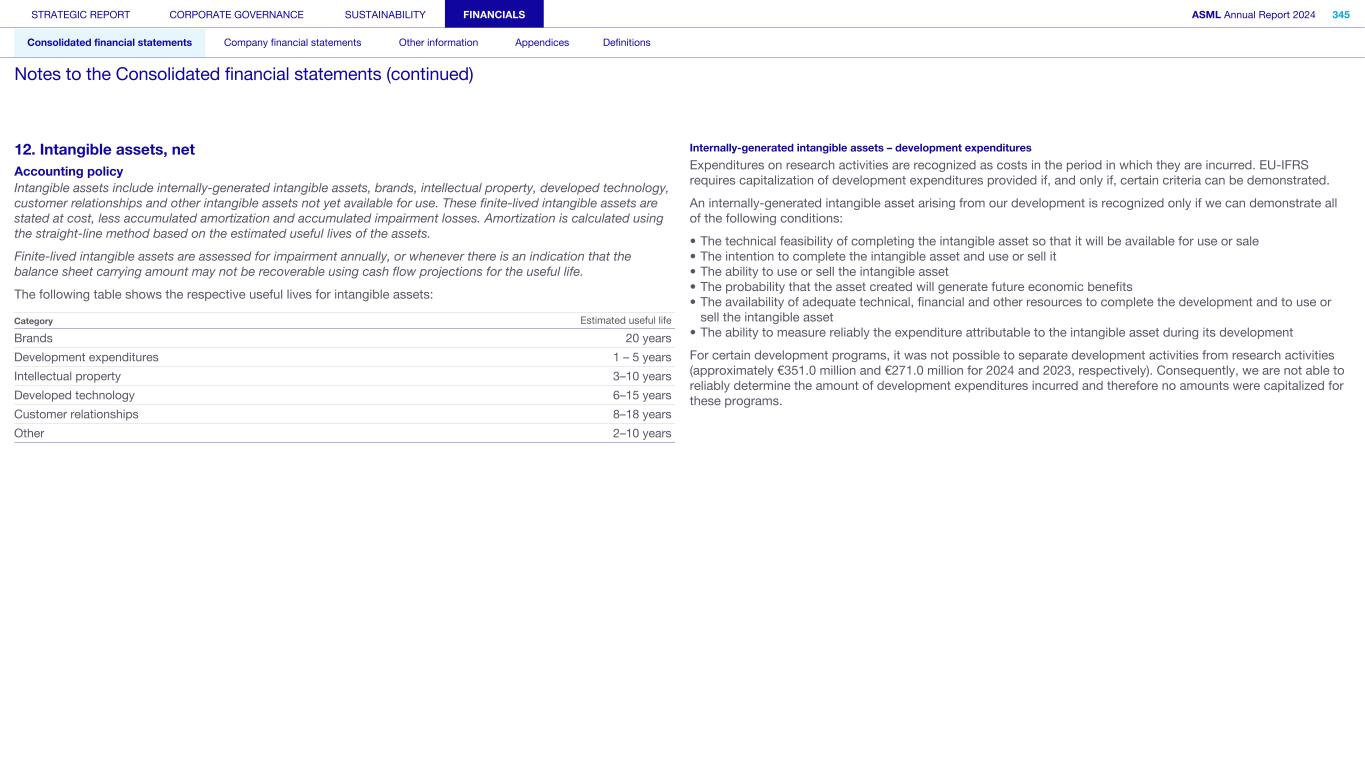 12. Intangible assets, net Accounting policy Intangible assets include internally-generated intangible assets, brands, intellectual property, developed technology, customer relationships and other intangible assets not yet available for use. These finite-lived intangible assets are stated at cost, less accumulated amortization and accumulated impairment losses. Amortization is calculated using the straight-line method based on the estimated useful lives of the assets. Finite-lived intangible assets are assessed for impairment annually, or whenever there is an indication that the balance sheet carrying amount may not be recoverable using cash flow projections for the useful life. The following table shows the respective useful lives for intangible assets: Category Estimated useful life Brands 20 years Development expenditures 1 – 5 years Intellectual property 3–10 years Developed technology 6–15 years Customer relationships 8–18 years Other 2–10 years Internally-generated intangible assets – development expenditures Expenditures on research activities are recognized as costs in the period in which they are incurred. EU-IFRS requires capitalization of development expenditures provided if, and only if, certain criteria can be demonstrated. An internally-generated intangible asset arising from our development is recognized only if we can demonstrate all of the following conditions: • The technical feasibility of completing the intangible asset so that it will be available for use or sale • The intention to complete the intangible asset and use or sell it • The ability to use or sell the intangible asset • The probability that the asset created will generate future economic benefits • The availability of adequate technical, financial and other resources to complete the development and to use or sell the intangible asset • The ability to measure reliably the expenditure attributable to the intangible asset during its development For certain development programs, it was not possible to separate development activities from research activities (approximately €351.0 million and €271.0 million for 2024 and 2023, respectively). Consequently, we are not able to reliably determine the amount of development expenditures incurred and therefore no amounts were capitalized for these programs. STRATEGIC REPORT CORPORATE GOVERNANCE SUSTAINABILITY FINANCIALS ASML Annual Report 2024 345 Consolidated financial statements Company financial statements Other information Appendices Definitions Notes to the Consolidated financial statements (continued)