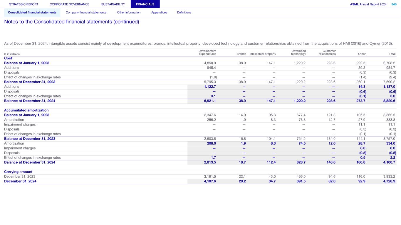 As of December 31, 2024, intangible assets consist mainly of development expenditures, brands, intellectual property, developed technology and customer relationships obtained from the acquisitions of HMI (2016) and Cymer (2013): €, in millions Development expenditures Brands Intellectual property Developed technology Customer relationships Other Total Cost Balance at January 1, 2023 4,850.9 38.9 147.1 1,220.2 228.6 222.5 6,708.2 Additions 945.4 — — — — 39.3 984.7 Disposals — — — — — (0.3) (0.3) Effect of changes in exchange rates (1.0) — — — — (1.4) (2.4) Balance at December 31, 2023 5,795.3 38.9 147.1 1,220.2 228.6 260.1 7,690.2 Additions 1,122.7 — — — — 14.3 1,137.0 Disposals — — — — — (0.6) (0.6) Effect of changes in exchange rates 3.1 — — — — (0.1) 3.0 Balance at December 31, 2024 6,921.1 38.9 147.1 1,220.2 228.6 273.7 8,829.6 Accumulated amortization Balance at January 1, 2023 2,347.6 14.9 95.8 677.4 121.3 105.5 3,362.5 Amortization 256.2 1.9 8.3 76.8 12.7 27.9 383.8 Impairment charges — — — — — 11.1 11.1 Disposals — — — — — (0.3) (0.3) Effect of changes in exchange rates — — — — — (0.1) (0.1) Balance at December 31, 2023 2,603.8 16.8 104.1 754.2 134.0 144.1 3,757.0 Amortization 208.0 1.9 8.3 74.5 12.6 28.7 334.0 Impairment charges — — — — — 8.0 8.0 Disposals — — — — — (0.5) (0.5) Effect of changes in exchange rates 1.7 — — — — 0.5 2.2 Balance at December 31, 2024 2,813.5 18.7 112.4 828.7 146.6 180.8 4,100.7 Carrying amount December 31, 2023 3,191.5 22.1 43.0 466.0 94.6 116.0 3,933.2 December 31, 2024 4,107.6 20.2 34.7 391.5 82.0 92.9 4,728.9 STRATEGIC REPORT CORPORATE GOVERNANCE SUSTAINABILITY FINANCIALS ASML Annual Report 2024 346 Consolidated financial statements Company financial statements Other information Appendices Definitions Notes to the Consolidated financial statements (continued)