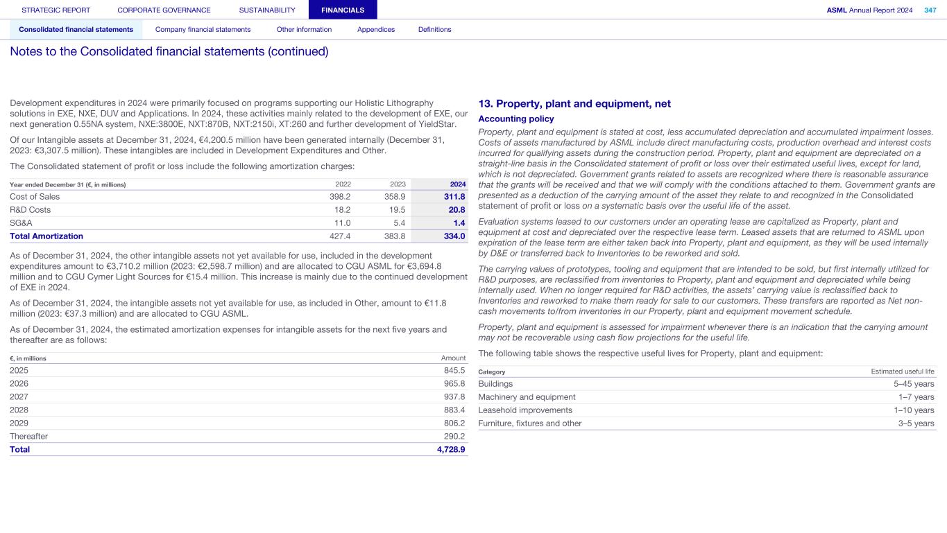 Development expenditures in 2024 were primarily focused on programs supporting our Holistic Lithography solutions in EXE, NXE, DUV and Applications. In 2024, these activities mainly related to the development of EXE, our next generation 0.55NA system, NXE:3800E, NXT:870B, NXT:2150i, XT:260 and further development of YieldStar. Of our Intangible assets at December 31, 2024, €4,200.5 million have been generated internally (December 31, 2023: €3,307.5 million). These intangibles are included in Development Expenditures and Other. The Consolidated statement of profit or loss include the following amortization charges: Year ended December 31 (€, in millions) 2022 2023 2024 Cost of Sales 398.2 358.9 311.8 R&D Costs 18.2 19.5 20.8 SG&A 11.0 5.4 1.4 Total Amortization 427.4 383.8 334.0 As of December 31, 2024, the other intangible assets not yet available for use, included in the development expenditures amount to €3,710.2 million (2023: €2,598.7 million) and are allocated to CGU ASML for €3,694.8 million and to CGU Cymer Light Sources for €15.4 million. This increase is mainly due to the continued development of EXE in 2024. As of December 31, 2024, the intangible assets not yet available for use, as included in Other, amount to €11.8 million (2023: €37.3 million) and are allocated to CGU ASML. As of December 31, 2024, the estimated amortization expenses for intangible assets for the next five years and thereafter are as follows: €, in millions Amount 2025 845.5 2026 965.8 2027 937.8 2028 883.4 2029 806.2 Thereafter 290.2 Total 4,728.9 13. Property, plant and equipment, net Accounting policy Property, plant and equipment is stated at cost, less accumulated depreciation and accumulated impairment losses. Costs of assets manufactured by ASML include direct manufacturing costs, production overhead and interest costs incurred for qualifying assets during the construction period. Property, plant and equipment are depreciated on a straight-line basis in the Consolidated statement of profit or loss over their estimated useful lives, except for land, which is not depreciated. Government grants related to assets are recognized where there is reasonable assurance that the grants will be received and that we will comply with the conditions attached to them. Government grants are presented as a deduction of the carrying amount of the asset they relate to and recognized in the Consolidated statement of profit or loss on a systematic basis over the useful life of the asset. Evaluation systems leased to our customers under an operating lease are capitalized as Property, plant and equipment at cost and depreciated over the respective lease term. Leased assets that are returned to ASML upon expiration of the lease term are either taken back into Property, plant and equipment, as they will be used internally by D&E or transferred back to Inventories to be reworked and sold. The carrying values of prototypes, tooling and equipment that are intended to be sold, but first internally utilized for R&D purposes, are reclassified from inventories to Property, plant and equipment and depreciated while being internally used. When no longer required for R&D activities, the assets’ carrying value is reclassified back to Inventories and reworked to make them ready for sale to our customers. These transfers are reported as Net non- cash movements to/from inventories in our Property, plant and equipment movement schedule. Property, plant and equipment is assessed for impairment whenever there is an indication that the carrying amount may not be recoverable using cash flow projections for the useful life. The following table shows the respective useful lives for Property, plant and equipment: Category Estimated useful life Buildings 5–45 years Machinery and equipment 1–7 years Leasehold improvements 1–10 years Furniture, fixtures and other 3–5 years STRATEGIC REPORT CORPORATE GOVERNANCE SUSTAINABILITY FINANCIALS ASML Annual Report 2024 347 Consolidated financial statements Company financial statements Other information Appendices Definitions Notes to the Consolidated financial statements (continued)
