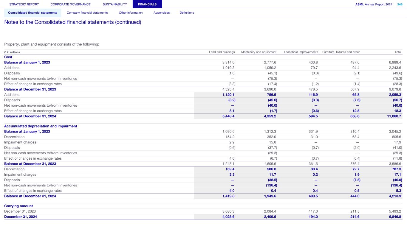 Property, plant and equipment consists of the following: Cost Balance at January 1, 2023 3,314.0 2,777.6 400.8 497.0 6,989.4 Additions 1,019.3 1,050.2 79.7 94.4 2,243.6 Disposals (1.6) (45.1) (0.8) (2.1) (49.6) Net non-cash movements to/from Inventories — (75.3) — — (75.3) Effect of changes in exchange rates (8.3) (17.4) (1.2) (1.4) (28.3) Balance at December 31, 2023 4,323.4 3,690.0 478.5 587.9 9,079.8 Additions 1,120.1 756.5 116.9 65.8 2,059.3 Disposals (3.2) (45.6) (0.3) (7.6) (56.7) Net non-cash movements to/from Inventories — (40.0) — — (40.0) Effect of changes in exchange rates 8.1 (1.7) (0.6) 12.5 18.3 Balance at December 31, 2024 5,448.4 4,359.2 594.5 658.6 11,060.7 Accumulated depreciation and impairment Balance at January 1, 2023 1,090.6 1,312.3 331.9 310.4 3,045.2 Depreciation 154.2 352.0 31.0 68.4 605.6 Impairment charges 2.9 15.0 — — 17.9 Disposals (0.6) (37.7) (0.7) (2.0) (41.0) Net non-cash movements to/from Inventories — (29.3) — — (29.3) Effect of changes in exchange rates (4.0) (6.7) (0.7) (0.4) (11.8) Balance at December 31, 2023 1,243.1 1,605.6 361.5 376.4 3,586.6 Depreciation 169.4 506.8 38.4 72.7 787.3 Impairment charges 3.3 11.7 0.2 1.9 17.1 Disposals — (38.5) — (7.5) (46.0) Net non-cash movements to/from Inventories — (136.4) — — (136.4) Effect of changes in exchange rates 4.0 0.4 0.4 0.5 5.3 Balance at December 31, 2024 1,419.8 1,949.6 400.5 444.0 4,213.9 Carrying amount December 31, 2023 3,080.3 2,084.4 117.0 211.5 5,493.2 December 31, 2024 4,028.6 2,409.6 194.0 214.6 6,846.8 €, in millions Land and buildings Machinery and equipment Leasehold improvements Furniture, fixtures and other Total STRATEGIC REPORT CORPORATE GOVERNANCE SUSTAINABILITY FINANCIALS ASML Annual Report 2024 348 Consolidated financial statements Company financial statements Other information Appendices Definitions Notes to the Consolidated financial statements (continued)