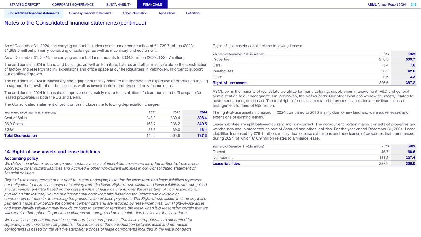 As of December 31, 2024, the carrying amount includes assets under construction of €1,729.7 million (2023: €1,658.0 million) primarily consisting of buildings, as well as machinery and equipment. As of December 31, 2024, the carrying amount of land amounts to €304.3 million (2023: €229.7 million). The additions in 2024 in Land and buildings, as well as Furniture, fixtures and other mainly relate to the construction of factory and research facility expansions and office space at our headquarters in Veldhoven, in order to support our continued growth. The additions in 2024 in Machinery and equipment mainly relate to the upgrade and expansion of production tooling to support the growth of our business, as well as investments in prototypes of new technologies. The additions in 2024 in Leasehold improvements mainly relate to installation of cleanrooms and office space for leased properties in both the US and Berlin. The Consolidated statement of profit or loss includes the following depreciation charges: Year ended December 31 (€, in millions) 2022 2023 2024 Cost of Sales 248.2 330.4 398.4 R&D Costs 163.7 236.2 340.5 SG&A 33.3 39.0 48.4 Total Depreciation 445.2 605.6 787.3 14. Right-of-use assets and lease liabilities Accounting policy We determine whether an arrangement contains a lease at inception. Leases are included in Right-of-use assets, Accrued & other current liabilities and Accrued & other non-current liabilities in our Consolidated statement of financial position. Right-of-use assets represent our right to use an underlying asset for the lease term and lease liabilities represent our obligation to make lease payments arising from the lease. Right-of-use assets and lease liabilities are recognized at commencement date based on the present value of lease payments over the lease term. As our leases do not provide an implicit rate, we use our incremental borrowing rate based on the information available at commencement date in determining the present value of lease payments. The Right-of-use assets include any lease payments made at or before the commencement date and are reduced by lease incentives. Our Right-of-use asset and lease liability valuation may include options to extend or terminate the lease when it is reasonably certain that we will exercise that option. Depreciation charges are recognized on a straight-line basis over the lease term. We have lease agreements with lease and non-lease components. The lease components are accounted for separately from non-lease components. The allocation of the consideration between lease and non-lease components is based on the relative standalone prices of lease components included in the lease contracts. Right-of-use assets consist of the following leases: Year ended December 31 (€, in millions) 2023 2024 Properties 270.3 333.7 Cars 5.4 7.6 Warehouses 30.3 42.6 Other 0.6 3.3 Right-of-use assets 306.6 387.2 ASML owns the majority of real estate we utilize for manufacturing, supply chain management, R&D and general administration at our headquarters in Veldhoven, the Netherlands. Our other locations worldwide, mostly related to customer support, are leased. The total right-of-use assets related to properties includes a new finance lease arrangement for land of €32 million. The right-of-use assets increased in 2024 compared to 2023 mainly due to new land and warehouse leases and extensions of existing leases. Lease liabilities are split between current and non-current. The non-current portion mainly consists of properties and warehouses and is presented as part of Accrued and other liabilities. For the year ended December 31, 2024, Lease Liabilities increased by €78.1 million, mainly due to lease extensions and new leases of properties that commenced during 2024, of which €16.9 million relates to a finance lease. Year ended December 31 (€, in millions) 2023 2024 Current 46.7 68.6 Non-current 181.2 237.4 Lease liabilities 227.9 306.0 STRATEGIC REPORT CORPORATE GOVERNANCE SUSTAINABILITY FINANCIALS ASML Annual Report 2024 349 Consolidated financial statements Company financial statements Other information Appendices Definitions Notes to the Consolidated financial statements (continued)