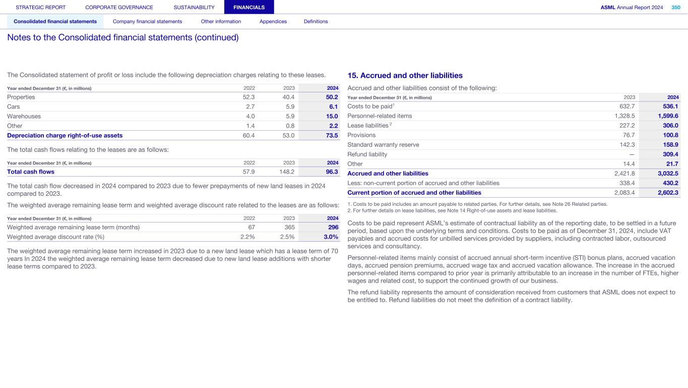 The Consolidated statement of profit or loss include the following depreciation charges relating to these leases. Year ended December 31 (€, in millions) 2022 2023 2024 Properties 52.3 40.4 50.2 Cars 2.7 5.9 6.1 Warehouses 4.0 5.9 15.0 Other 1.4 0.8 2.2 Depreciation charge right-of-use assets 60.4 53.0 73.5 The total cash flows relating to the leases are as follows: Year ended December 31 (€, in millions) 2022 2023 2024 Total cash flows 57.9 148.2 96.3 The total cash flow decreased in 2024 compared to 2023 due to fewer prepayments of new land leases in 2024 compared to 2023. The weighted average remaining lease term and weighted average discount rate related to the leases are as follows: Year ended December 31 (€, in millions) 2022 2023 2024 Weighted average remaining lease term (months) 67 365 296 Weighted average discount rate (%) 2.2% 2.5% 3.0% The weighted average remaining lease term increased in 2023 due to a new land lease which has a lease term of 70 years In 2024 the weighted average remaining lease term decreased due to new land lease additions with shorter lease terms compared to 2023. 15. Accrued and other liabilities Accrued and other liabilities consist of the following: Year ended December 31 (€, in millions) 2023 2024 Costs to be paid1 632.7 536.1 Personnel-related items 1,328.5 1,599.6 Lease liabilities 2 227.2 306.0 Provisions 76.7 100.8 Standard warranty reserve 142.3 158.9 Refund liability — 309.4 Other 14.4 21.7 Accrued and other liabilities 2,421.8 3,032.5 Less: non-current portion of accrued and other liabilities 338.4 430.2 Current portion of accrued and other liabilities 2,083.4 2,602.3 1. Costs to be paid includes an amount payable to related parties. For further details, see Note 26 Related parties. 2. For further details on lease liabilities, see Note 14 Right-of-use assets and lease liabilities. Costs to be paid represent ASML’s estimate of contractual liability as of the reporting date, to be settled in a future period, based upon the underlying terms and conditions. Costs to be paid as of December 31, 2024, include VAT payables and accrued costs for unbilled services provided by suppliers, including contracted labor, outsourced services and consultancy. Personnel-related items mainly consist of accrued annual short-term incentive (STI) bonus plans, accrued vacation days, accrued pension premiums, accrued wage tax and accrued vacation allowance. The increase in the accrued personnel-related items compared to prior year is primarily attributable to an increase in the number of FTEs, higher wages and related cost, to support the continued growth of our business. The refund liability represents the amount of consideration received from customers that ASML does not expect to be entitled to. Refund liabilities do not meet the definition of a contract liability. STRATEGIC REPORT CORPORATE GOVERNANCE SUSTAINABILITY FINANCIALS ASML Annual Report 2024 350 Consolidated financial statements Company financial statements Other information Appendices Definitions Notes to the Consolidated financial statements (continued)