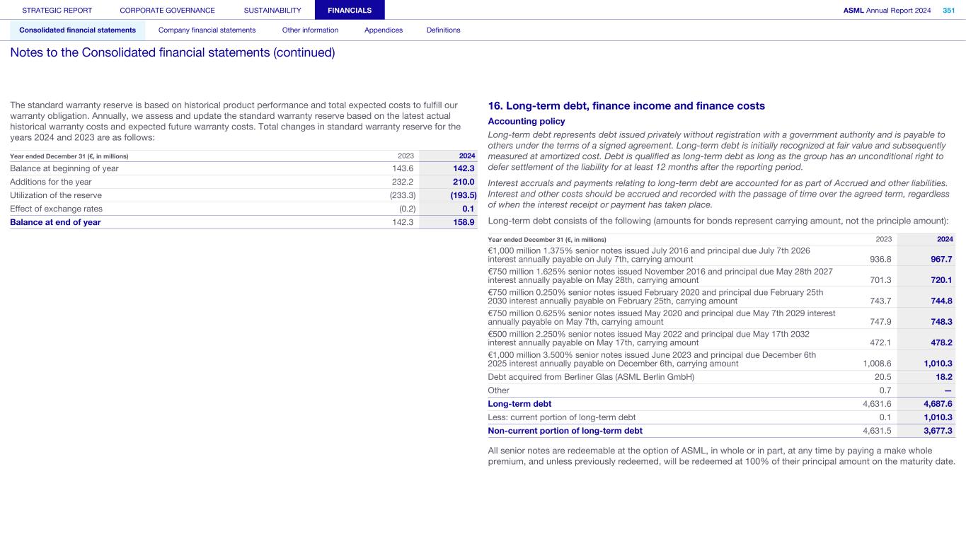 The standard warranty reserve is based on historical product performance and total expected costs to fulfill our warranty obligation. Annually, we assess and update the standard warranty reserve based on the latest actual historical warranty costs and expected future warranty costs. Total changes in standard warranty reserve for the years 2024 and 2023 are as follows: Year ended December 31 (€, in millions) 2023 2024 Balance at beginning of year 143.6 142.3 Additions for the year 232.2 210.0 Utilization of the reserve (233.3) (193.5) Effect of exchange rates (0.2) 0.1 Balance at end of year 142.3 158.9 16. Long-term debt, finance income and finance costs Accounting policy Long-term debt represents debt issued privately without registration with a government authority and is payable to others under the terms of a signed agreement. Long-term debt is initially recognized at fair value and subsequently measured at amortized cost. Debt is qualified as long-term debt as long as the group has an unconditional right to defer settlement of the liability for at least 12 months after the reporting period. Interest accruals and payments relating to long-term debt are accounted for as part of Accrued and other liabilities. Interest and other costs should be accrued and recorded with the passage of time over the agreed term, regardless of when the interest receipt or payment has taken place. Long-term debt consists of the following (amounts for bonds represent carrying amount, not the principle amount): Year ended December 31 (€, in millions) 2023 2024 €1,000 million 1.375% senior notes issued July 2016 and principal due July 7th 2026 interest annually payable on July 7th, carrying amount 936.8 967.7 €750 million 1.625% senior notes issued November 2016 and principal due May 28th 2027 interest annually payable on May 28th, carrying amount 701.3 720.1 €750 million 0.250% senior notes issued February 2020 and principal due February 25th 2030 interest annually payable on February 25th, carrying amount 743.7 744.8 €750 million 0.625% senior notes issued May 2020 and principal due May 7th 2029 interest annually payable on May 7th, carrying amount 747.9 748.3 €500 million 2.250% senior notes issued May 2022 and principal due May 17th 2032 interest annually payable on May 17th, carrying amount 472.1 478.2 €1,000 million 3.500% senior notes issued June 2023 and principal due December 6th 2025 interest annually payable on December 6th, carrying amount 1,008.6 1,010.3 Debt acquired from Berliner Glas (ASML Berlin GmbH) 20.5 18.2 Other 0.7 — Long-term debt 4,631.6 4,687.6 Less: current portion of long-term debt 0.1 1,010.3 Non-current portion of long-term debt 4,631.5 3,677.3 All senior notes are redeemable at the option of ASML, in whole or in part, at any time by paying a make whole premium, and unless previously redeemed, will be redeemed at 100% of their principal amount on the maturity date. STRATEGIC REPORT CORPORATE GOVERNANCE SUSTAINABILITY FINANCIALS ASML Annual Report 2024 351 Consolidated financial statements Company financial statements Other information Appendices Definitions Notes to the Consolidated financial statements (continued)