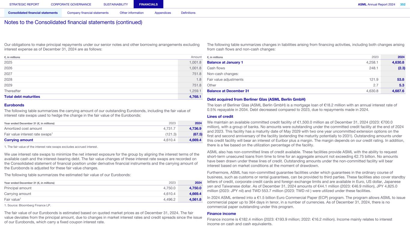 Our obligations to make principal repayments under our senior notes and other borrowing arrangements excluding interest expense as of December 31, 2024 are as follows: €, in millions Amount 2025 1,001.8 2026 1,001.8 2027 751.8 2028 1.8 2029 751.8 Thereafter 1,259.1 Total debt maturities 4,768.1 Eurobonds The following table summarizes the carrying amount of our outstanding Eurobonds, including the fair value of interest rate swaps used to hedge the change in the fair value of the Eurobonds: Year ended December 31 (€, in millions) 2023 2024 Amortized cost amount 4,731.7 4,736.9 Fair value interest rate swaps1 (121.3) (67.5) Carrying amount 4,610.4 4,669.4 1. The fair value of the interest rate swaps excludes accrued interest. We use interest rate swaps to minimize the net interest exposure for the group by aligning the interest terms of the available cash and the interest-bearing debt. The fair value changes of these interest rate swaps are recorded on the Consolidated statement of financial position under derivative financial instruments and the carrying amount of the Eurobonds is adjusted for these fair value changes. The following table summarizes the estimated fair value of our Eurobonds: Year ended December 31 (€, in millions) 2023 2024 Principal amount 4,750.0 4,750.0 Carrying amount 4,610.4 4,669.4 Fair value1 4,496.2 4,561.8 1. Source: Bloomberg Finance LP. The fair value of our Eurobonds is estimated based on quoted market prices as of December 31, 2024. The fair value deviates from the principal amount, due to changes in market interest rates and credit spreads since the issue of our Eurobonds, which carry a fixed coupon interest rate. The following table summarizes changes in liabilities arising from financing activities, including both changes arising from cash flows and non-cash changes: €, in millions 2023 2024 Balance at January 1 4,258.1 4,630.8 Cash flows 248.1 (2.3) Non-cash changes: Fair value adjustments 121.9 53.8 Other 2.7 5.3 Balance at December 31 4,630.8 4,687.6 Debt acquired from Berliner Glas (ASML Berlin GmbH) The loan of Berliner Glas (ASML Berlin GmbH) is a mortgage loan of €18.2 million with an annual interest rate of 0.5% repayable in 2034. Debt decreased compared to 2023, due to repayments made in 2024. Lines of credit We maintain an available committed credit facility of €1,500.0 million as of December 31, 2024 (2023: €700.0 million), with a group of banks. No amounts were outstanding under the committed credit facility at the end of 2024 and 2023. This facility has a maturity date of May 2029 with two one year uncommitted extension options on the first and second anniversary of the facility (extending the maturity potentially to 2031). Outstanding amounts under this credit facility will bear an interest of Euribor plus a margin. The margin depends on our credit rating. In addition, there is a fee based on the utilization percentage of the facility. ASML also has non-committed lines of credit available. These facilities provide ASML with the ability to request short-term unsecured loans from time to time for an aggregate amount not exceeding €2.75 billion. No amounts have been drawn under these lines of credit. Outstanding amounts under the non-committed facility will bear interest based on market conditions at the moment of drawdown. Furthermore, ASML has non-committed guarantee facilities under which guarantees in the ordinary course of business, such as customs or rental guarantees, can be provided to third parties. These facilities also cover standby letters of credit, corporate credit cards and foreign exchange limits and are available in Euro, US dollar, Japanese yen and Taiwanese dollar. As of December 31, 2024 amounts of €44.1 million (2023: €46.9 million), JPY 4,825.0 million (2023: JPY nil) and TWD 553.7 million (2023: TWD nil ) were utilized under these facilities. In 2024 ASML entered into a €1.5 billion Euro Commercial Paper (ECP) program. The program allows ASML to issue commercial paper up to 364 days in tenor, in a number of currencies. As of December 31, 2024, there is no commercial paper outstanding under this program. Finance income Finance income is €182.4 million (2023: €193.9 million; 2022: €16.2 million). Income mainly relates to interest income on cash and cash equivalents. STRATEGIC REPORT CORPORATE GOVERNANCE SUSTAINABILITY FINANCIALS ASML Annual Report 2024 352 Consolidated financial statements Company financial statements Other information Appendices Definitions Notes to the Consolidated financial statements (continued)