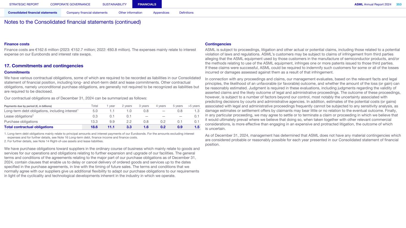 Finance costs Finance costs are €162.6 million (2023: €152.7 million; 2022: €60.8 million). The expenses mainly relate to interest expense on our Eurobonds and interest rate swaps. 17. Commitments and contingencies Commitments We have various contractual obligations, some of which are required to be recorded as liabilities in our Consolidated statement of financial position, including long- and short-term debt and lease commitments. Other contractual obligations, namely unconditional purchase obligations, are generally not required to be recognized as liabilities but are required to be disclosed. Our contractual obligations as of December 31, 2024 can be summarized as follows: Payments due by period (€, in billions) Total 1 year 2 years 3 years 4 years 5 years >5 years Long-term debt obligations, including interest1 5.0 1.1 1.0 0.8 — 0.8 1.3 Lease obligations2 0.3 0.1 0.1 — — — 0.1 Purchase obligations 13.3 9.9 2.2 0.8 0.2 0.1 0.1 Total contractual obligations 18.6 11.1 3.3 1.6 0.2 0.9 1.5 1. Long-term debt obligations mainly relate to principal amounts and interest payments of our Eurobonds. For the amounts excluding interest expenses and for further details, see Note 16 Long-term debt, finance income and finance costs. 2. For further details, see Note 14 Right-of-use assets and lease liabilities. We have purchase obligations toward suppliers in the ordinary course of business which mainly relate to goods and services for our operations and obligations relating to further expansion and upgrade of our facilities. The general terms and conditions of the agreements relating to the major part of our purchase obligations as of December 31, 2024, contain clauses that enable us to delay or cancel delivery of ordered goods and services up to the dates specified in the purchase agreements, in line with the timing of future sales. The terms and conditions that we normally agree with our suppliers give us additional flexibility to adapt our purchase obligations to our requirements in light of the cyclicality and technological developments inherent in the industry in which we operate. Contingencies ASML is subject to proceedings, litigation and other actual or potential claims, including those related to a potential violation of laws and regulations. ASML’s customers may be subject to claims of infringement from third parties alleging that the ASML equipment used by those customers in the manufacture of semiconductor products, and/or the methods relating to use of the ASML equipment, infringes one or more patents issued to those third parties. If these claims were successful, ASML could be required to indemnify such customers for some or all of the losses incurred or damages assessed against them as a result of that infringement. In connection with any proceedings and claims, our management evaluates, based on the relevant facts and legal principles, the likelihood of an unfavorable (or favorable) outcome, and whether the amount of the loss (or gain) can be reasonably estimated. Judgment is required in these evaluations, including judgments regarding the validity of asserted claims and the likely outcome of legal and administrative proceedings. The outcome of these proceedings, however, is subject to a number of factors beyond our control, most notably the uncertainty associated with predicting decisions by courts and administrative agencies. In addition, estimates of the potential costs (or gains) associated with legal and administrative proceedings frequently cannot be subjected to any sensitivity analysis, as damage estimates or settlement offers by claimants may bear little or no relation to the eventual outcome. Finally, in any particular proceeding, we may agree to settle or to terminate a claim or proceeding in which we believe that it would ultimately prevail where we believe that doing so, when taken together with other relevant commercial considerations, is more effective than engaging in an expensive and protracted litigation, the outcome of which is uncertain. As of December 31, 2024, management has determined that ASML does not have any material contingencies which are considered probable or reasonably possible for each year presented in our Consolidated statement of financial position. STRATEGIC REPORT CORPORATE GOVERNANCE SUSTAINABILITY FINANCIALS ASML Annual Report 2024 353 Consolidated financial statements Company financial statements Other information Appendices Definitions Notes to the Consolidated financial statements (continued)