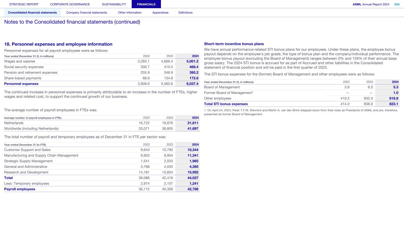 18. Personnel expenses and employee information Personnel expenses for all payroll employees were as follows: Year ended December 31 (€, in millions) 2022 2023 2024 Wages and salaries 3,283.1 4,666.4 5,001.2 Social security expenses 300.7 410.5 468.4 Pension and retirement expenses 255.9 348.9 395.2 Share-based payments 68.9 134.8 172.6 Personnel expenses 3,908.6 5,560.6 6,037.4 The continued increase in personnel expenses is primarily attributable to an increase in the number of FTEs, higher wages and related cost, to support the continued growth of our business. The average number of payroll employees in FTEs was: Average number of payroll employees in FTEs 2022 2023 2024 Netherlands 16,722 19,876 21,811 Worldwide (including Netherlands) 33,071 38,805 41,697 The total number of payroll and temporary employees as of December 31 in FTE per sector was: Year ended December 31 (in FTE) 2022 2023 2024 Customer Support and Sales 9,643 10,790 10,344 Manufacturing and Supply Chain Management 9,953 9,954 11,341 Strategic Supply Management 1,541 2,033 1,965 General and Administrative 3,768 4,035 4,385 Research and Development 14,181 15,604 15,992 Total 39,086 42,416 44,027 Less: Temporary employees 2,974 2,107 1,241 Payroll employees 36,112 40,309 42,786 Short-term incentive bonus plans We have annual performance-related STI bonus plans for our employees. Under these plans, the employee bonus payout depends on the employee’s job grade, the type of bonus plan and the company/individual performance. The employee bonus payout (excluding the Board of Management) ranges between 0% and 126% of their annual base gross salary. The 2024 STI bonus is accrued for as part of Accrued and other liabilities in the Consolidated statement of financial position and will be paid in the first quarter of 2025. The STI bonus expenses for the (former) Board of Management and other employees were as follows: Year ended December 31 (€, in millions) 2022 2023 2024 Board of Management 3.8 6.0 5.3 Former Board of Management1 — — 1.0 Other employees 410.2 932.0 816.8 Total STI bonus expenses 414.0 938.0 823.1 1. On April 24, 2024, Peter T.F.M. Wennink and Martin A. van den Brink stepped down from their roles as Presidents of ASML and are, therefore, presented as former Board of Management. STRATEGIC REPORT CORPORATE GOVERNANCE SUSTAINABILITY FINANCIALS ASML Annual Report 2024 354 Consolidated financial statements Company financial statements Other information Appendices Definitions Notes to the Consolidated financial statements (continued)