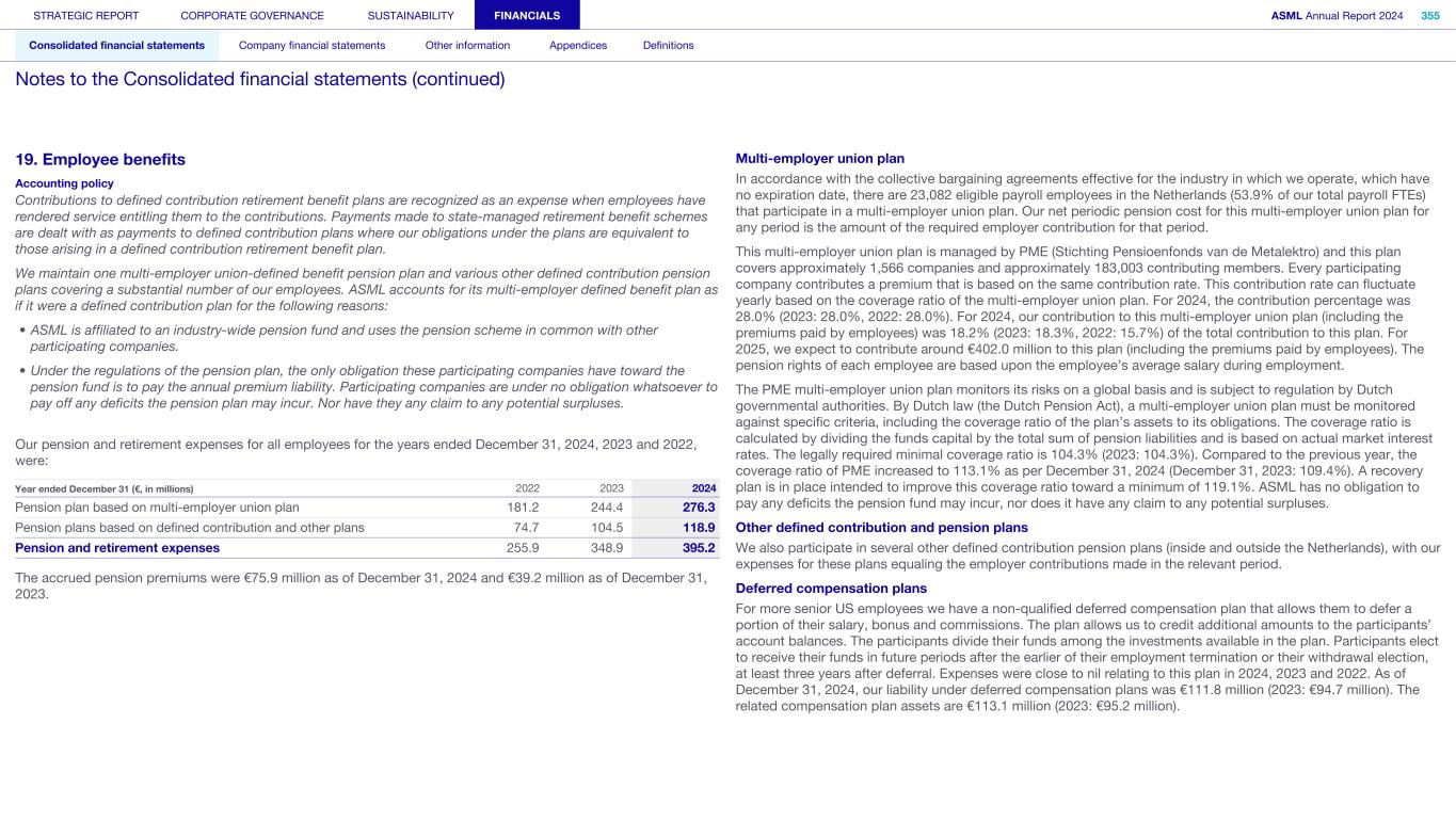 19. Employee benefits Accounting policy Contributions to defined contribution retirement benefit plans are recognized as an expense when employees have rendered service entitling them to the contributions. Payments made to state-managed retirement benefit schemes are dealt with as payments to defined contribution plans where our obligations under the plans are equivalent to those arising in a defined contribution retirement benefit plan. We maintain one multi-employer union-defined benefit pension plan and various other defined contribution pension plans covering a substantial number of our employees. ASML accounts for its multi-employer defined benefit plan as if it were a defined contribution plan for the following reasons: • ASML is affiliated to an industry-wide pension fund and uses the pension scheme in common with other participating companies. • Under the regulations of the pension plan, the only obligation these participating companies have toward the pension fund is to pay the annual premium liability. Participating companies are under no obligation whatsoever to pay off any deficits the pension plan may incur. Nor have they any claim to any potential surpluses. Our pension and retirement expenses for all employees for the years ended December 31, 2024, 2023 and 2022, were: Year ended December 31 (€, in millions) 2022 2023 2024 Pension plan based on multi-employer union plan 181.2 244.4 276.3 Pension plans based on defined contribution and other plans 74.7 104.5 118.9 Pension and retirement expenses 255.9 348.9 395.2 The accrued pension premiums were €75.9 million as of December 31, 2024 and €39.2 million as of December 31, 2023. Multi-employer union plan In accordance with the collective bargaining agreements effective for the industry in which we operate, which have no expiration date, there are 23,082 eligible payroll employees in the Netherlands (53.9% of our total payroll FTEs) that participate in a multi-employer union plan. Our net periodic pension cost for this multi-employer union plan for any period is the amount of the required employer contribution for that period. This multi-employer union plan is managed by PME (Stichting Pensioenfonds van de Metalektro) and this plan covers approximately 1,566 companies and approximately 183,003 contributing members. Every participating company contributes a premium that is based on the same contribution rate. This contribution rate can fluctuate yearly based on the coverage ratio of the multi-employer union plan. For 2024, the contribution percentage was 28.0% (2023: 28.0%, 2022: 28.0%). For 2024, our contribution to this multi-employer union plan (including the premiums paid by employees) was 18.2% (2023: 18.3%, 2022: 15.7%) of the total contribution to this plan. For 2025, we expect to contribute around €402.0 million to this plan (including the premiums paid by employees). The pension rights of each employee are based upon the employee’s average salary during employment. The PME multi-employer union plan monitors its risks on a global basis and is subject to regulation by Dutch governmental authorities. By Dutch law (the Dutch Pension Act), a multi-employer union plan must be monitored against specific criteria, including the coverage ratio of the plan’s assets to its obligations. The coverage ratio is calculated by dividing the funds capital by the total sum of pension liabilities and is based on actual market interest rates. The legally required minimal coverage ratio is 104.3% (2023: 104.3%). Compared to the previous year, the coverage ratio of PME increased to 113.1% as per December 31, 2024 (December 31, 2023: 109.4%). A recovery plan is in place intended to improve this coverage ratio toward a minimum of 119.1%. ASML has no obligation to pay any deficits the pension fund may incur, nor does it have any claim to any potential surpluses. Other defined contribution and pension plans We also participate in several other defined contribution pension plans (inside and outside the Netherlands), with our expenses for these plans equaling the employer contributions made in the relevant period. Deferred compensation plans For more senior US employees we have a non-qualified deferred compensation plan that allows them to defer a portion of their salary, bonus and commissions. The plan allows us to credit additional amounts to the participants’ account balances. The participants divide their funds among the investments available in the plan. Participants elect to receive their funds in future periods after the earlier of their employment termination or their withdrawal election, at least three years after deferral. Expenses were close to nil relating to this plan in 2024, 2023 and 2022. As of December 31, 2024, our liability under deferred compensation plans was €111.8 million (2023: €94.7 million). The related compensation plan assets are €113.1 million (2023: €95.2 million). STRATEGIC REPORT CORPORATE GOVERNANCE SUSTAINABILITY FINANCIALS ASML Annual Report 2024 355 Consolidated financial statements Company financial statements Other information Appendices Definitions Notes to the Consolidated financial statements (continued)