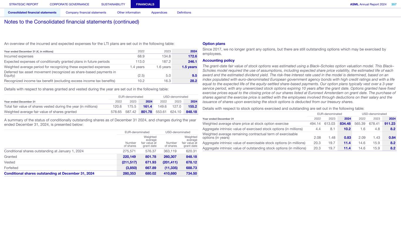 An overview of the incurred and expected expenses for the LTI plans are set out in the following table: Year ended December 31 (€, in millions) 2022 2023 2024 Incurred expenses 68.9 134.8 172.6 Expected expenses of conditionally granted plans in future periods 113.0 187.2 246.1 Weighted average period for recognizing these expected expenses 1.4 years 1.6 years 1.5 years Deferred tax asset movement (recognized as share-based payments in Equity) (2.5) 5.0 9.5 Recognized income tax benefit (excluding excess income tax benefits) 10.2 16.3 28.2 Details with respect to shares granted and vested during the year are set out in the following table: Total fair value of shares vested during the year (in millions) 120.6 175.5 161.4 149.6 127.0 155.2 Weighted average fair value of shares granted 578.65 587.42 801.78 553.61 624.10 848.18 EUR-denominated USD-denominated Year ended December 31 2022 2023 2024 2022 2023 2024 A summary of the status of conditionally outstanding shares as of December 31 2024, and changes during the year ended December 31, 2024, is presented below: Forfeited (3,850) 667.89 (11,335) 688.73 Conditional shares outstanding at December 31, 2024 280,353 680.02 410,680 734.50 EUR-denominated USD-denominated Number of shares Weighted average fair value at grant date Number of shares Weighted average fair value at grant date Conditional shares outstanding at January 1, 2024 275,571 576.37 363,119 620.31 Granted 220,149 801.78 260,307 848.18 Vested (211,517) 671.93 (201,411) 678.12 Option plans Since 2017, we no longer grant any options, but there are still outstanding options which may be exercised by employees. Accounting policy The grant-date fair value of stock options was estimated using a Black–Scholes option valuation model. This Black– Scholes model required the use of assumptions, including expected share price volatility, the estimated life of each award and the estimated dividend yield. The risk-free interest rate used in the model is determined, based on an index populated with euro-denominated European government agency bonds with high credit ratings and with a life equal to the expected life of the equity-settled share-based payments. Our option plans typically vest over a 3-year service period, with any unexercised stock options expiring 10 years after the grant date. Options granted have fixed exercise prices equal to the closing price of our shares listed at Euronext Amsterdam on grant date. The purchase of shares against the exercise price is settled with the employees involved through deductions on their salary and the issuance of shares upon exercising the stock options is deducted from our treasury shares. Details with respect to stock options exercised and outstanding are set out in the following table: EUR-denominated USD-denominated Year ended December 31 2022 2023 2024 2022 2023 2024 Weighted average share price at stock option exercise 494.14 613.03 834.48 565.39 678.41 911.23 Aggregate intrinsic value of exercised stock options (in millions) 4.4 8.1 10.2 1.6 4.8 8.2 Weighted average remaining contractual term of exercisable options (in years) 2.08 1.48 0.83 2.09 1.43 0.84 Aggregate intrinsic value of exercisable stock options (in millions) 20.3 19.7 11.4 14.6 15.9 8.2 Aggregate intrinsic value of outstanding stock options (in millions) 20.3 19.7 11.4 14.6 15.9 8.2 STRATEGIC REPORT CORPORATE GOVERNANCE SUSTAINABILITY FINANCIALS ASML Annual Report 2024 357 Consolidated financial statements Company financial statements Other information Appendices Definitions Notes to the Consolidated financial statements (continued)