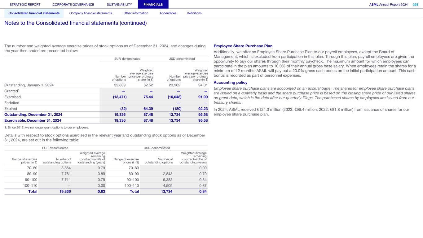 The number and weighted average exercise prices of stock options as of December 31, 2024, and changes during the year then ended are presented below: EUR-denominated USD-denominated Number of options Weighted average exercise price per ordinary share (in €) Number of options Weighted average exercise price per ordinary share (in $) Outstanding, January 1, 2024 32,839 82.52 23,962 94.01 Granted1 — — — — Exercised (13,471) 75.44 (10,048) 91.90 Forfeited — — — — Expired (32) 64.39 (180) 92.23 Outstanding, December 31, 2024 19,336 87.48 13,734 95.58 Exercisable, December 31, 2024 19,336 87.48 13,734 95.58 1. Since 2017, we no longer grant options to our employees. Details with respect to stock options exercised in the relevant year and outstanding stock options as of December 31, 2024, are set out in the following table: EUR-denominated USD-denominated Range of exercise prices (in €) Number of outstanding options Weighted average remaining contractual life of outstanding (years) Range of exercise prices (in $) Number of outstanding options Weighted average remaining contractual life of outstanding (years) 70–80 3,864 0.79 70–80 — 0.00 80–90 7,761 0.89 80–90 2,843 0.79 90–100 7,711 0.79 90–100 6,382 0.84 100–110 — 0.00 100–110 4,509 0.87 Total 19,336 0.83 Total 13,734 0.84 Employee Share Purchase Plan Additionally, we offer an Employee Share Purchase Plan to our payroll employees, except the Board of Management, which is excluded from participation in this plan. Through this plan, payroll employees are given the opportunity to buy our shares through their monthly paycheck. The maximum amount for which employees can participate in the plan amounts to 10.0% of their annual gross base salary. When employees retain the shares for a minimum of 12 months, ASML will pay out a 20.0% gross cash bonus on the initial participation amount. This cash bonus is recorded as part of personnel expenses. Accounting policy Employee share purchase plans are accounted on an accrual basis. The shares for employee share purchase plans are issued on a quarterly basis and the share purchase price is based on the closing share price of our listed shares on grant date, which is the date after our quarterly filings. The purchased shares by employees are issued from our treasury shares. In 2024, ASML received €124.0 million (2023: €99.4 million; 2022: €81.8 million) from issuance of shares for our employee share purchase plan. STRATEGIC REPORT CORPORATE GOVERNANCE SUSTAINABILITY FINANCIALS ASML Annual Report 2024 358 Consolidated financial statements Company financial statements Other information Appendices Definitions Notes to the Consolidated financial statements (continued)