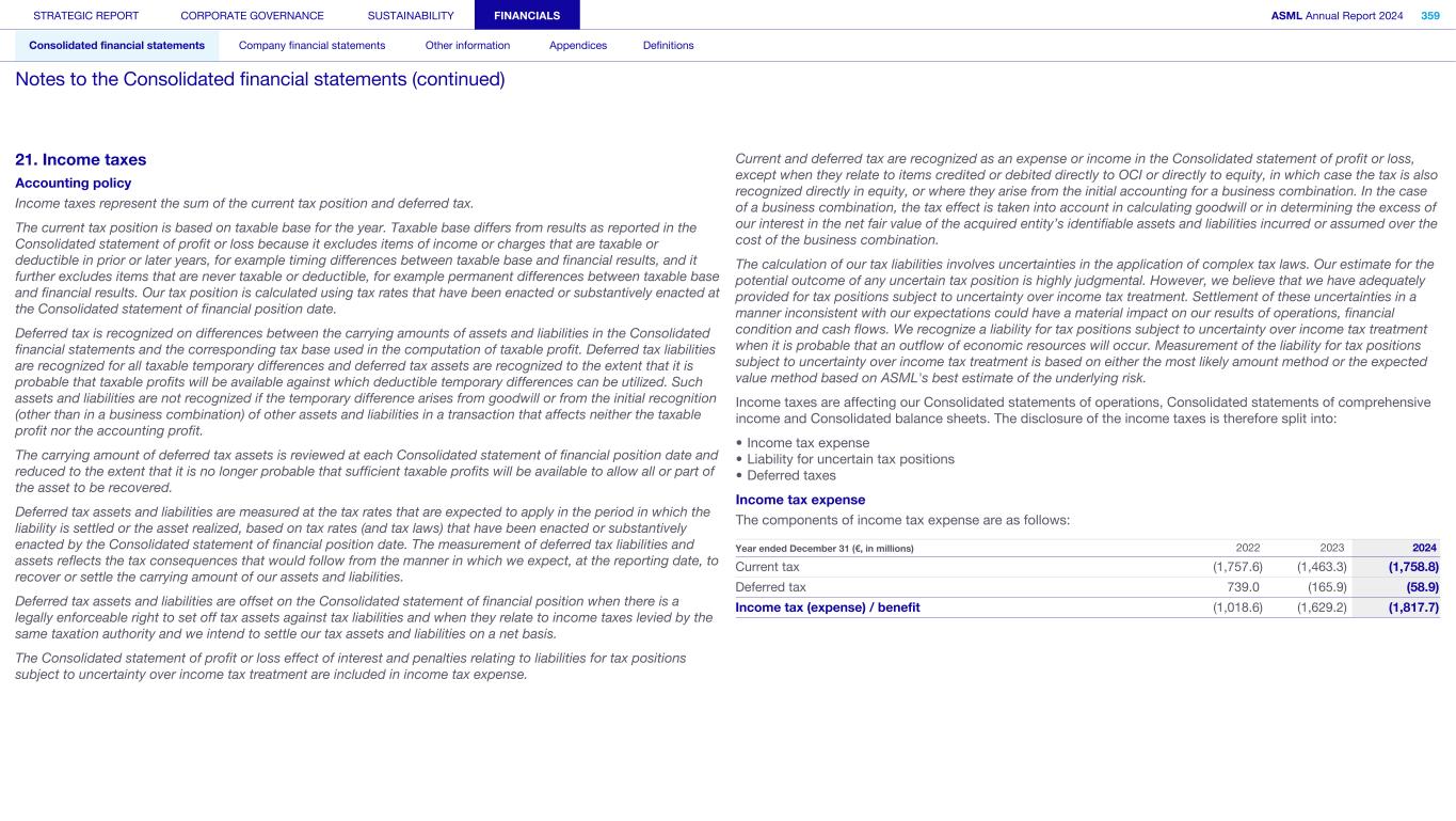 21. Income taxes Accounting policy Income taxes represent the sum of the current tax position and deferred tax. The current tax position is based on taxable base for the year. Taxable base differs from results as reported in the Consolidated statement of profit or loss because it excludes items of income or charges that are taxable or deductible in prior or later years, for example timing differences between taxable base and financial results, and it further excludes items that are never taxable or deductible, for example permanent differences between taxable base and financial results. Our tax position is calculated using tax rates that have been enacted or substantively enacted at the Consolidated statement of financial position date. Deferred tax is recognized on differences between the carrying amounts of assets and liabilities in the Consolidated financial statements and the corresponding tax base used in the computation of taxable profit. Deferred tax liabilities are recognized for all taxable temporary differences and deferred tax assets are recognized to the extent that it is probable that taxable profits will be available against which deductible temporary differences can be utilized. Such assets and liabilities are not recognized if the temporary difference arises from goodwill or from the initial recognition (other than in a business combination) of other assets and liabilities in a transaction that affects neither the taxable profit nor the accounting profit. The carrying amount of deferred tax assets is reviewed at each Consolidated statement of financial position date and reduced to the extent that it is no longer probable that sufficient taxable profits will be available to allow all or part of the asset to be recovered. Deferred tax assets and liabilities are measured at the tax rates that are expected to apply in the period in which the liability is settled or the asset realized, based on tax rates (and tax laws) that have been enacted or substantively enacted by the Consolidated statement of financial position date. The measurement of deferred tax liabilities and assets reflects the tax consequences that would follow from the manner in which we expect, at the reporting date, to recover or settle the carrying amount of our assets and liabilities. Deferred tax assets and liabilities are offset on the Consolidated statement of financial position when there is a legally enforceable right to set off tax assets against tax liabilities and when they relate to income taxes levied by the same taxation authority and we intend to settle our tax assets and liabilities on a net basis. The Consolidated statement of profit or loss effect of interest and penalties relating to liabilities for tax positions subject to uncertainty over income tax treatment are included in income tax expense. Current and deferred tax are recognized as an expense or income in the Consolidated statement of profit or loss, except when they relate to items credited or debited directly to OCI or directly to equity, in which case the tax is also recognized directly in equity, or where they arise from the initial accounting for a business combination. In the case of a business combination, the tax effect is taken into account in calculating goodwill or in determining the excess of our interest in the net fair value of the acquired entity’s identifiable assets and liabilities incurred or assumed over the cost of the business combination. The calculation of our tax liabilities involves uncertainties in the application of complex tax laws. Our estimate for the potential outcome of any uncertain tax position is highly judgmental. However, we believe that we have adequately provided for tax positions subject to uncertainty over income tax treatment. Settlement of these uncertainties in a manner inconsistent with our expectations could have a material impact on our results of operations, financial condition and cash flows. We recognize a liability for tax positions subject to uncertainty over income tax treatment when it is probable that an outflow of economic resources will occur. Measurement of the liability for tax positions subject to uncertainty over income tax treatment is based on either the most likely amount method or the expected value method based on ASML's best estimate of the underlying risk. Income taxes are affecting our Consolidated statements of operations, Consolidated statements of comprehensive income and Consolidated balance sheets. The disclosure of the income taxes is therefore split into: • Income tax expense • Liability for uncertain tax positions • Deferred taxes Income tax expense The components of income tax expense are as follows: Year ended December 31 (€, in millions) 2022 2023 2024 Current tax (1,757.6) (1,463.3) (1,758.8) Deferred tax 739.0 (165.9) (58.9) Income tax (expense) / benefit (1,018.6) (1,629.2) (1,817.7) STRATEGIC REPORT CORPORATE GOVERNANCE SUSTAINABILITY FINANCIALS ASML Annual Report 2024 359 Consolidated financial statements Company financial statements Other information Appendices Definitions Notes to the Consolidated financial statements (continued)