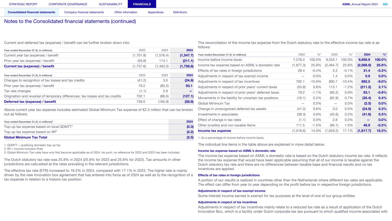 Current and deferred tax (expense) / benefit can be further broken down into: Year ended December 31 (€, in millions) 2022 2023 2024 Current year tax (expense) / benefit (1,701.8) (1,576.4) (1,547.7) Prior year tax (expense) / benefit (55.8) 113.1 (211.1) Current tax (expense) / benefit (1,757.6) (1,463.3) (1,758.8) Year ended December 31 (€, in millions) 2022 2023 2024 Changes to recognition of tax losses and tax credits (41.2) 3.0 (24.9) Prior year tax (expense) / benefit 79.2 (85.2) 93.1 Tax rate changes (1.1) 2.8 — Origination and reversal of temporary differences, tax losses and tax credits 702.1 (86.5) (127.1) Deferred tax (expense) / benefit 739.0 (165.9) (58.9) Above current year tax expense includes estimated Global Minimum Tax expense of €2.5 million that can be broken out as follows: Year ended December 31 (€, in millions)3 2024 Top-up tax expense based on local QDMTT1 (0.3) Top-up tax expense based on IIR2 (2.2) Global Minimum Tax Total (2.5) 1. QDMTT = qualifying domestic top-up tax 2. IIR = Income Inclusion Rule 3. Global Minimum Tax rules have only first become applicable as of 2024. As such, no reference for 2022 and 2023 has been included. The Dutch statutory tax rate was 25.8% in 2024 (25.8% for 2023 and 25.8% for 2022). Tax amounts in other jurisdictions are calculated at the rates prevailing in the relevant jurisdictions. The effective tax rate (ETR) increased to 18.3% in 2024, compared with 17.1% in 2023. The higher rate is mainly driven by the new Innovation box agreement that has entered into force as of 2024 as well as to the recognition of a tax expense in relation to a historic tax position. The reconciliation of the income tax expense from the Dutch statutory rate to the effective income tax rate is as follows: Year ended December 31 (€, in millions) 2022 %1 2023 %1 2024 %1 Income before income taxes 7,276.4 100.0% 9,553.1 100.0% 9,956.9 100.0% Income tax expense based on ASML’s domestic rate (1,877.3) 25.8% (2,464.7) 25.8% (2,568.9) 25.8% Effects of tax rates in foreign jurisdictions 28.4 -0.4% 5.3 -0.1% 31.4 -0.3% Adjustments in respect of tax exempt income — 0.0% 1.4 0.0% 0.9 0.0% Adjustments in respect of tax incentives 792.1 -10.9% 995.7 -10.4% 892.5 -9.0% Adjustments in respect of prior years’ current taxes (55.8) 0.8% 113.1 -1.2% (211.2) 2.1% Adjustments in respect of prior years’ deferred taxes 79.2 -1.1% (85.2) 0.9% 93.1 -0.9% Movements in the liability for uncertain tax positions (16.1) 0.2% (62.9) 0.7% (35.4) 0.4% Global Minimum Tax — 0.0% — 0.0% (2.5) 0.0% Change in unrecognized deferred tax assets (41.2) 0.6% 3.0 0.0% (24.9) 0.3% Investments in associates (38.3) 0.6% (42.6) 0.5% (41.6) 0.5% Effect of change in tax rates (1.1) 0.0% 2.8 0.0% — 0.0% Other (credits) and non-taxable items 111.5 -1.5% (95.1) 1.0% 48.9 -0.5% Income tax expense (1,018.6) 14.0% (1,629.2) 17.1% (1,817.7) 18.3% 1. As a percentage of income before income taxes. The individual line items in the table above are explained in more detail below. Income tax expense based on ASML’s domestic rate The income tax expense based on ASML’s domestic rate is based on the Dutch statutory income tax rate. It reflects the income tax expense that would have been applicable assuming that all of our income is taxable against the Dutch statutory tax rate and there are no differences between taxable base and financial results and no tax incentives are applied. Effects of tax rates in foreign jurisdictions A portion of our results is realized in countries other than the Netherlands where different tax rates are applicable. The effect can differ from year to year depending on the profit before tax in respective foreign jurisdictions. Adjustments in respect of tax-exempt income Some interest income earned is exempt for tax purposes at the level of one of our group entities. Adjustments in respect of tax incentives Adjustments in respect of tax incentives mainly relate to a reduced tax rate as a result of application of the Dutch Innovation Box, which is a facility under Dutch corporate tax law pursuant to which qualified income associated with STRATEGIC REPORT CORPORATE GOVERNANCE SUSTAINABILITY FINANCIALS ASML Annual Report 2024 360 Consolidated financial statements Company financial statements Other information Appendices Definitions Notes to the Consolidated financial statements (continued)