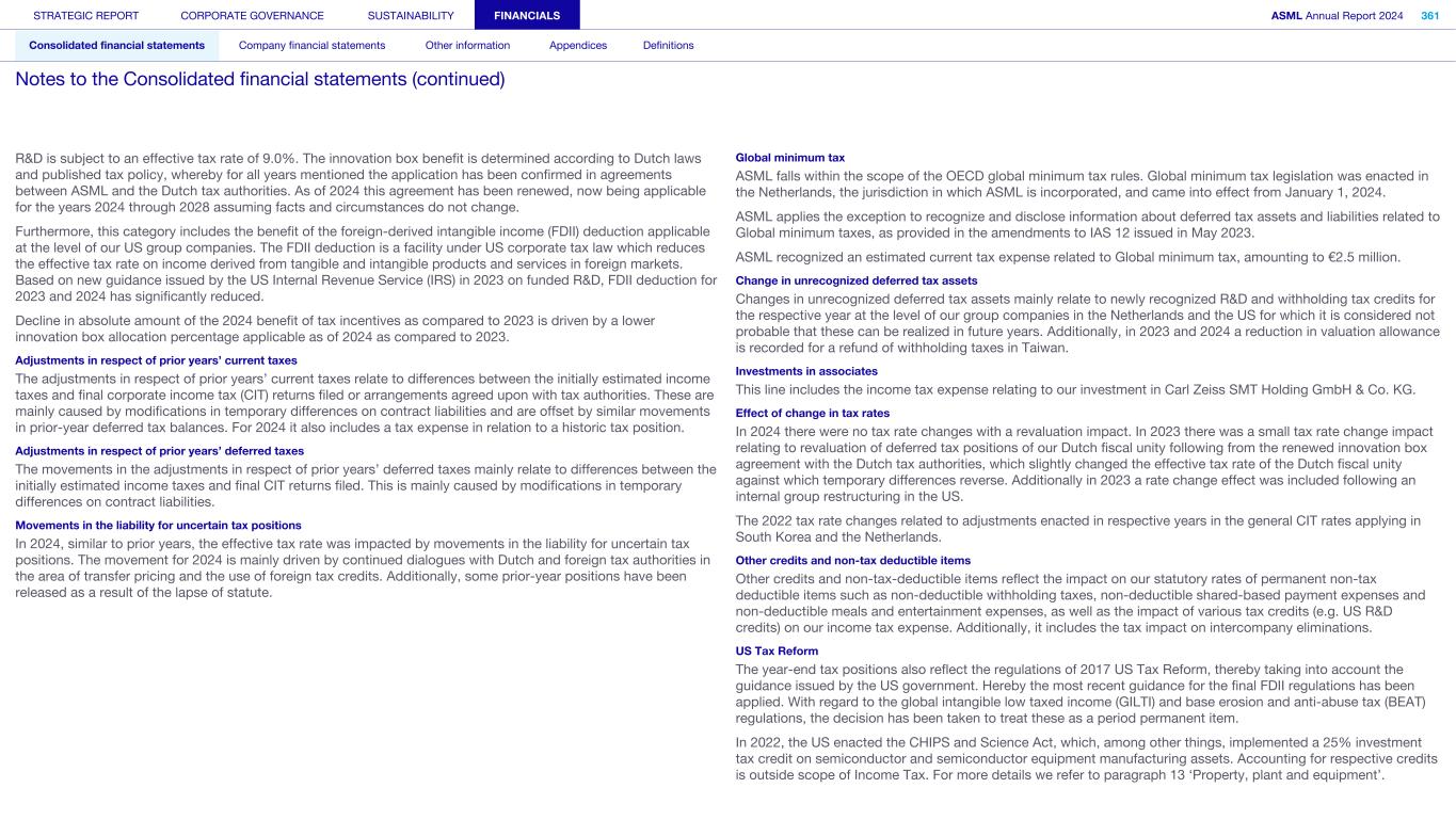 R&D is subject to an effective tax rate of 9.0%. The innovation box benefit is determined according to Dutch laws and published tax policy, whereby for all years mentioned the application has been confirmed in agreements between ASML and the Dutch tax authorities. As of 2024 this agreement has been renewed, now being applicable for the years 2024 through 2028 assuming facts and circumstances do not change. Furthermore, this category includes the benefit of the foreign-derived intangible income (FDII) deduction applicable at the level of our US group companies. The FDII deduction is a facility under US corporate tax law which reduces the effective tax rate on income derived from tangible and intangible products and services in foreign markets. Based on new guidance issued by the US Internal Revenue Service (IRS) in 2023 on funded R&D, FDII deduction for 2023 and 2024 has significantly reduced. Decline in absolute amount of the 2024 benefit of tax incentives as compared to 2023 is driven by a lower innovation box allocation percentage applicable as of 2024 as compared to 2023. Adjustments in respect of prior years’ current taxes The adjustments in respect of prior years’ current taxes relate to differences between the initially estimated income taxes and final corporate income tax (CIT) returns filed or arrangements agreed upon with tax authorities. These are mainly caused by modifications in temporary differences on contract liabilities and are offset by similar movements in prior-year deferred tax balances. For 2024 it also includes a tax expense in relation to a historic tax position. Adjustments in respect of prior years’ deferred taxes The movements in the adjustments in respect of prior years’ deferred taxes mainly relate to differences between the initially estimated income taxes and final CIT returns filed. This is mainly caused by modifications in temporary differences on contract liabilities. Movements in the liability for uncertain tax positions In 2024, similar to prior years, the effective tax rate was impacted by movements in the liability for uncertain tax positions. The movement for 2024 is mainly driven by continued dialogues with Dutch and foreign tax authorities in the area of transfer pricing and the use of foreign tax credits. Additionally, some prior-year positions have been released as a result of the lapse of statute. Global minimum tax ASML falls within the scope of the OECD global minimum tax rules. Global minimum tax legislation was enacted in the Netherlands, the jurisdiction in which ASML is incorporated, and came into effect from January 1, 2024. ASML applies the exception to recognize and disclose information about deferred tax assets and liabilities related to Global minimum taxes, as provided in the amendments to IAS 12 issued in May 2023. ASML recognized an estimated current tax expense related to Global minimum tax, amounting to €2.5 million. Change in unrecognized deferred tax assets Changes in unrecognized deferred tax assets mainly relate to newly recognized R&D and withholding tax credits for the respective year at the level of our group companies in the Netherlands and the US for which it is considered not probable that these can be realized in future years. Additionally, in 2023 and 2024 a reduction in valuation allowance is recorded for a refund of withholding taxes in Taiwan. Investments in associates This line includes the income tax expense relating to our investment in Carl Zeiss SMT Holding GmbH & Co. KG. Effect of change in tax rates In 2024 there were no tax rate changes with a revaluation impact. In 2023 there was a small tax rate change impact relating to revaluation of deferred tax positions of our Dutch fiscal unity following from the renewed innovation box agreement with the Dutch tax authorities, which slightly changed the effective tax rate of the Dutch fiscal unity against which temporary differences reverse. Additionally in 2023 a rate change effect was included following an internal group restructuring in the US. The 2022 tax rate changes related to adjustments enacted in respective years in the general CIT rates applying in South Korea and the Netherlands. Other credits and non-tax deductible items Other credits and non-tax-deductible items reflect the impact on our statutory rates of permanent non-tax deductible items such as non-deductible withholding taxes, non-deductible shared-based payment expenses and non-deductible meals and entertainment expenses, as well as the impact of various tax credits (e.g. US R&D credits) on our income tax expense. Additionally, it includes the tax impact on intercompany eliminations. US Tax Reform The year-end tax positions also reflect the regulations of 2017 US Tax Reform, thereby taking into account the guidance issued by the US government. Hereby the most recent guidance for the final FDII regulations has been applied. With regard to the global intangible low taxed income (GILTI) and base erosion and anti-abuse tax (BEAT) regulations, the decision has been taken to treat these as a period permanent item. In 2022, the US enacted the CHIPS and Science Act, which, among other things, implemented a 25% investment tax credit on semiconductor and semiconductor equipment manufacturing assets. Accounting for respective credits is outside scope of Income Tax. For more details we refer to paragraph 13 ‘Property, plant and equipment’. STRATEGIC REPORT CORPORATE GOVERNANCE SUSTAINABILITY FINANCIALS ASML Annual Report 2024 361 Consolidated financial statements Company financial statements Other information Appendices Definitions Notes to the Consolidated financial statements (continued)