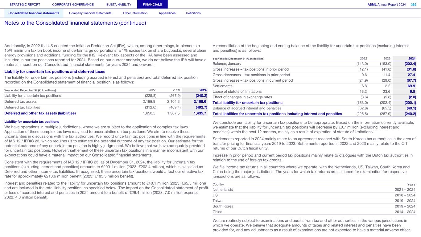 Additionally, in 2022 the US enacted the Inflation Reduction Act (IRA), which, among other things, implements a 15% minimum tax on book income of certain large corporations, a 1% excise tax on share buybacks, several clean energy provisions and additional funding for the IRS. Relevant tax aspects of the IRA have been assessed and included in our tax positions reported for 2024. Based on our current analysis, we do not believe the IRA will have a material impact on our Consolidated financial statements for years 2024 and onward. Liability for uncertain tax positions and deferred taxes The liability for uncertain tax positions (including accrued interest and penalties) and total deferred tax position recorded on the Consolidated statement of financial position is as follows: Year ended December 31 (€, in millions) 2022 2023 2024 Liability for uncertain tax positions (225.8) (267.9) (240.2) Deferred tax assets 2,188.9 2,104.8 2,168.6 Deferred tax liabilities (312.6) (469.4) (492.7) Deferred and other tax assets (liabilities) 1,650.5 1,367.5 1,435.7 Liability for uncertain tax positions We have operations in multiple jurisdictions, where we are subject to the application of complex tax laws. Application of these complex tax laws may lead to uncertainties on tax positions. We aim to resolve these uncertainties in discussions with the tax authorities. We record uncertain tax positions in line with the requirements of IAS 12 / IFRIC 23, which requires us to estimate the potential outcome of any tax position. Our estimate for the potential outcome of any uncertain tax position is highly judgmental. We believe that we have adequately provided for uncertain tax positions. However, settlement of these uncertain tax positions in a manner inconsistent with our expectations could have a material impact on our Consolidated financial statements. Consistent with the requirements of IAS 12 / IFRIC 23, as of December 31, 2024, the liability for uncertain tax positions (excluding interest and penalties) amounts to €200.1 million (2023: €202.4 million), which is classified as Deferred and other income tax liabilities. If recognized, these uncertain tax positions would affect our effective tax rate for approximately €213.6 million benefit (2023: €185.5 million benefit). Interest and penalties related to the liability for uncertain tax positions amount to €40.1 million (2023: €65.5 million)) and are included in the total liability position, as specified below. The impact on the Consolidated statement of profit or loss of accrued interest and penalties in 2024 amount to a benefit of €26.4 million (2023: 7.0 million expense; 2022: 4.3 million benefit). A reconciliation of the beginning and ending balance of the liability for uncertain tax positions (excluding interest and penalties) is as follows: Year ended December 31 (€, in millions) 2022 2023 2024 Balance, January (143.0) (163.0) (202.4) Gross increases – tax positions in prior period (12.1) (41.8) (31.8) Gross decreases – tax positions in prior period 0.6 11.4 27.4 Gross increases – tax positions in current period (24.9) (29.0) (67.7) Settlements 6.8 2.2 69.9 Lapse of statute of limitations 13.2 23.6 6.5 Effect of changes in exchange rates (3.6) (5.8) (2.0) Total liability for uncertain tax positions (163.0) (202.4) (200.1) Balance of accrued interest and penalties (62.8) (65.5) (40.1) Total liabilities for uncertain tax positions including interest and penalties (225.8) (267.9) (240.2) We conclude our liability for uncertain tax positions to be appropriate. Based on the information currently available, we estimate that the liability for uncertain tax positions will decrease by €0.7 million (excluding interest and penalties) within the next 12 months, mainly as a result of expiration of statute of limitations. Settlements reported in 2024 mainly relate to an agreement reached with South Korean tax authorities in the area of transfer pricing for financial years 2019 to 2023. Settlements reported in 2022 and 2023 mainly relate to the CIT returns of our Dutch fiscal unity. Increase in prior period and current period tax positions mainly relate to dialogues with the Dutch tax authorities in relation to the use of foreign tax credits. We file income tax returns in all countries where we operate, with the Netherlands, US, Taiwan, South Korea and China being the major jurisdictions. The years for which tax returns are still open for examination for respective jurisdictions are as follows: Country Years Netherlands 2021 – 2024 US 2018 – 2024 Taiwan 2019 – 2024 South Korea 2019 – 2024 China 2014 – 2024 We are routinely subject to examinations and audits from tax and other authorities in the various jurisdictions in which we operate. We believe that adequate amounts of taxes and related interest and penalties have been provided for, and any adjustments as a result of examinations are not expected to have a material adverse effect. STRATEGIC REPORT CORPORATE GOVERNANCE SUSTAINABILITY FINANCIALS ASML Annual Report 2024 362 Consolidated financial statements Company financial statements Other information Appendices Definitions Notes to the Consolidated financial statements (continued)