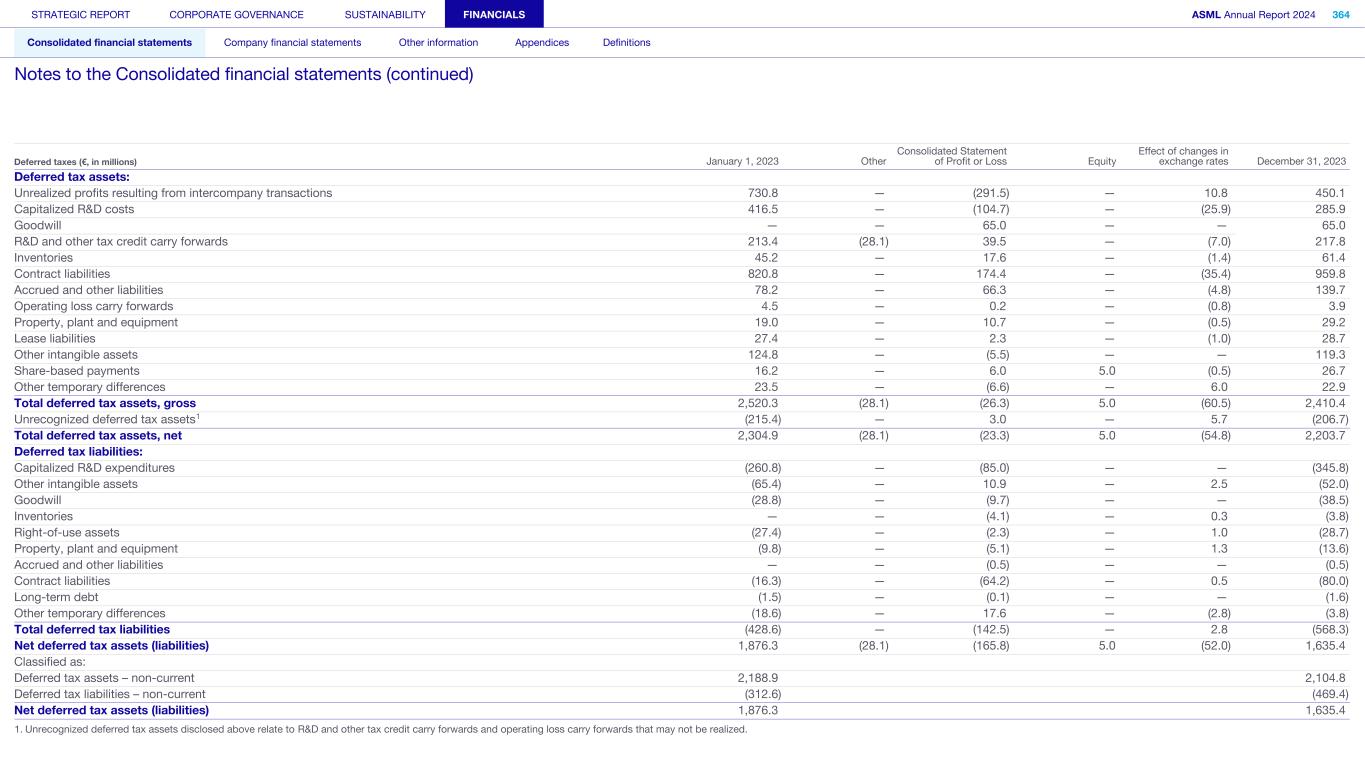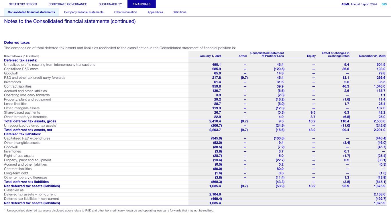 Deferred taxes The composition of total deferred tax assets and liabilities reconciled to the classification in the Consolidated statement of financial position is: Deferred taxes (€, in millions) January 1, 2024 Other Consolidated Statement of Profit or Loss Equity Effect of changes in exchange rates December 31, 2024 Deferred tax assets: Unrealized profits resulting from intercompany transactions 450.1 — 45.4 — 9.4 504.9 Capitalized R&D costs 285.9 — (129.5) — 36.6 193.0 Goodwill 65.0 — 14.8 — — 79.8 R&D and other tax credit carry forwards 217.8 (9.7) 45.4 — 13.1 266.6 Inventories 61.4 — 31.6 — 2.5 95.5 Contract liabilities 959.8 — 39.9 — 46.3 1,046.0 Accrued and other liabilities 139.7 — (6.6) — 2.6 135.7 Operating loss carry forwards 3.9 — (2.8) — — 1.1 Property, plant and equipment 29.2 — (16.2) — (1.6) 11.4 Lease liabilities 28.7 — (5.0) — 1.7 25.4 Other intangible assets 119.3 — (12.3) — — 107.0 Share-based payments 26.7 — (0.3) 9.5 6.3 42.2 Other temporary differences 22.9 — 4.9 3.7 (6.5) 25.0 Total deferred tax assets, gross 2,410.4 (9.7) 9.3 13.2 110.4 2,533.6 Unrecognized deferred tax assets1 (206.7) — (24.9) — (11.0) (242.6) Total deferred tax assets, net 2,203.7 (9.7) (15.6) 13.2 99.4 2,291.0 Deferred tax liabilities: Capitalized R&D expenditures (345.8) — (100.6) — — (446.4) Other intangible assets (52.0) — 9.4 — (3.4) (46.0) Goodwill (38.5) — (7.2) — — (45.7) Inventories (3.8) — 3.7 — 0.1 — Right-of-use assets (28.7) — 5.0 — (1.7) (25.4) Property, plant and equipment (13.6) — (22.7) — 0.2 (36.1) Accrued and other liabilities (0.5) — 0.2 — — (0.3) Contract liabilities (80.0) — 80.0 — — — Long-term debt (1.6) — 0.3 — — (1.3) Other temporary differences (3.8) — (11.4) — 1.3 (13.9) Total deferred tax liabilities (568.3) — (43.3) — (3.5) (615.1) Net deferred tax assets (liabilities) 1,635.4 (9.7) (58.9) 13.2 95.9 1,675.9 Classified as: Deferred tax assets – non-current 2,104.8 2,168.6 Deferred tax liabilities – non-current (469.4) (492.7) Net deferred tax assets (liabilities) 1,635.4 1,675.9 1. Unrecognized deferred tax assets disclosed above relate to R&D and other tax credit carry forwards and operating loss carry forwards that may not be realized. STRATEGIC REPORT CORPORATE GOVERNANCE SUSTAINABILITY FINANCIALS ASML Annual Report 2024 363 Consolidated financial statements Company financial statements Other information Appendices Definitions Notes to the Consolidated financial statements (continued)