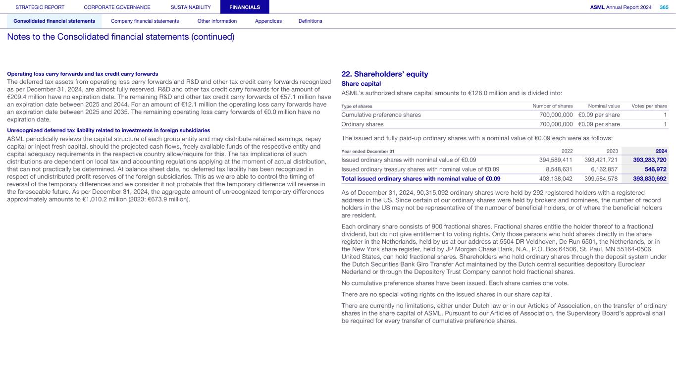 Operating loss carry forwards and tax credit carry forwards The deferred tax assets from operating loss carry forwards and R&D and other tax credit carry forwards recognized as per December 31, 2024, are almost fully reserved. R&D and other tax credit carry forwards for the amount of €209.4 million have no expiration date. The remaining R&D and other tax credit carry forwards of €57.1 million have an expiration date between 2025 and 2044. For an amount of €12.1 million the operating loss carry forwards have an expiration date between 2025 and 2035. The remaining operating loss carry forwards of €0.0 million have no expiration date. Unrecognized deferred tax liability related to investments in foreign subsidiaries ASML periodically reviews the capital structure of each group entity and may distribute retained earnings, repay capital or inject fresh capital, should the projected cash flows, freely available funds of the respective entity and capital adequacy requirements in the respective country allow/require for this. The tax implications of such distributions are dependent on local tax and accounting regulations applying at the moment of actual distribution, that can not practically be determined. At balance sheet date, no deferred tax liability has been recognized in respect of undistributed profit reserves of the foreign subsidiaries. This as we are able to control the timing of reversal of the temporary differences and we consider it not probable that the temporary difference will reverse in the foreseeable future. As per December 31, 2024, the aggregate amount of unrecognized temporary differences approximately amounts to €1,010.2 million (2023: €673.9 million). 22. Shareholders’ equity Share capital ASML’s authorized share capital amounts to €126.0 million and is divided into: Type of shares Number of shares Nominal value Votes per share Cumulative preference shares 700,000,000 €0.09 per share 1 Ordinary shares 700,000,000 €0.09 per share 1 The issued and fully paid-up ordinary shares with a nominal value of €0.09 each were as follows: Year ended December 31 2022 2023 2024 Issued ordinary shares with nominal value of €0.09 394,589,411 393,421,721 393,283,720 Issued ordinary treasury shares with nominal value of €0.09 8,548,631 6,162,857 546,972 Total issued ordinary shares with nominal value of €0.09 403,138,042 399,584,578 393,830,692 As of December 31, 2024, 90,315,092 ordinary shares were held by 292 registered holders with a registered address in the US. Since certain of our ordinary shares were held by brokers and nominees, the number of record holders in the US may not be representative of the number of beneficial holders, or of where the beneficial holders are resident. Each ordinary share consists of 900 fractional shares. Fractional shares entitle the holder thereof to a fractional dividend, but do not give entitlement to voting rights. Only those persons who hold shares directly in the share register in the Netherlands, held by us at our address at 5504 DR Veldhoven, De Run 6501, the Netherlands, or in the New York share register, held by JP Morgan Chase Bank, N.A., P.O. Box 64506, St. Paul, MN 55164-0506, United States, can hold fractional shares. Shareholders who hold ordinary shares through the deposit system under the Dutch Securities Bank Giro Transfer Act maintained by the Dutch central securities depository Euroclear Nederland or through the Depository Trust Company cannot hold fractional shares. No cumulative preference shares have been issued. Each share carries one vote. There are no special voting rights on the issued shares in our share capital. There are currently no limitations, either under Dutch law or in our Articles of Association, on the transfer of ordinary shares in the share capital of ASML. Pursuant to our Articles of Association, the Supervisory Board’s approval shall be required for every transfer of cumulative preference shares. STRATEGIC REPORT CORPORATE GOVERNANCE SUSTAINABILITY FINANCIALS ASML Annual Report 2024 365 Consolidated financial statements Company financial statements Other information Appendices Definitions Notes to the Consolidated financial statements (continued)