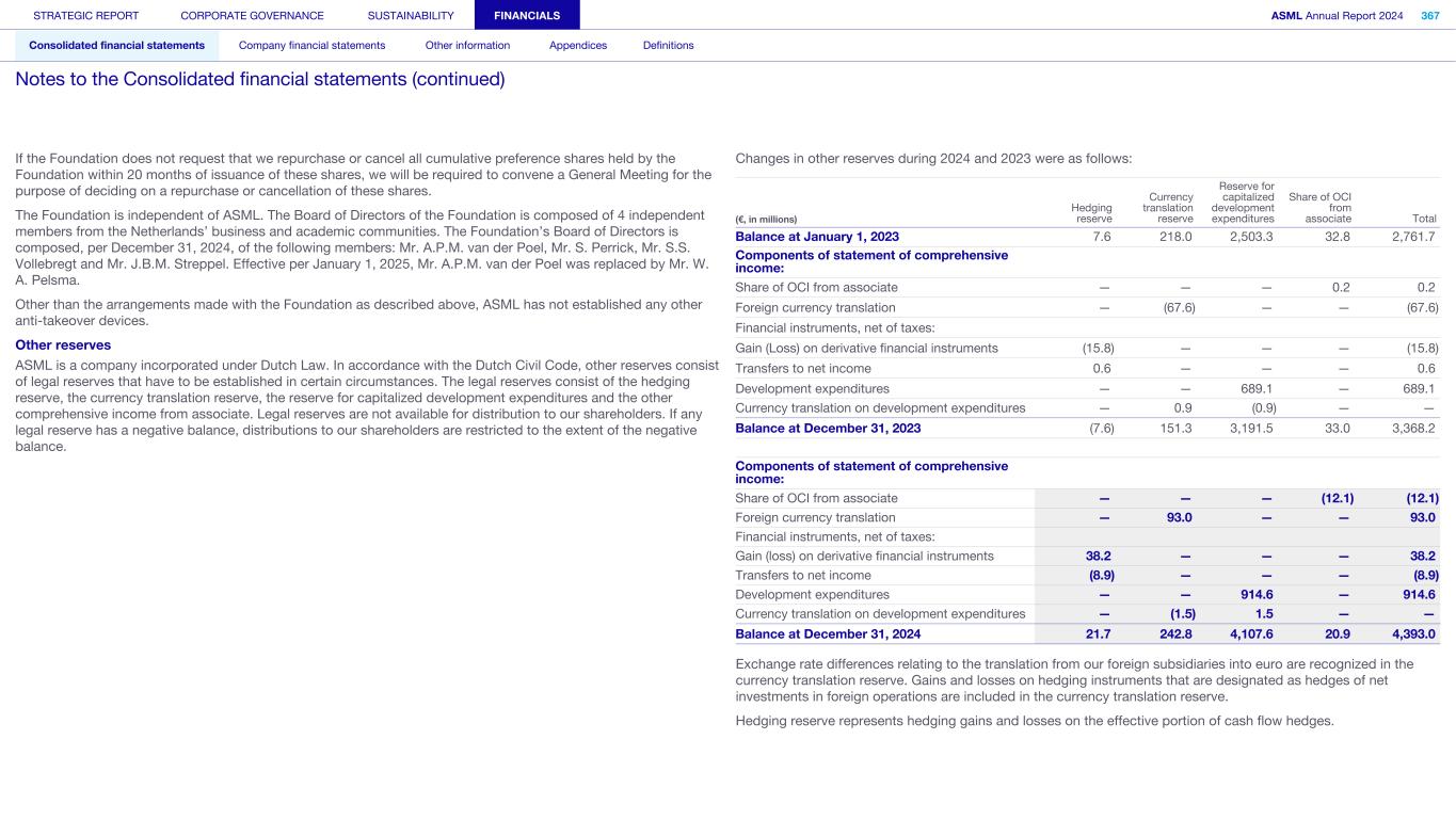 If the Foundation does not request that we repurchase or cancel all cumulative preference shares held by the Foundation within 20 months of issuance of these shares, we will be required to convene a General Meeting for the purpose of deciding on a repurchase or cancellation of these shares. The Foundation is independent of ASML. The Board of Directors of the Foundation is composed of 4 independent members from the Netherlands’ business and academic communities. The Foundation’s Board of Directors is composed, per December 31, 2024, of the following members: Mr. A.P.M. van der Poel, Mr. S. Perrick, Mr. S.S. Vollebregt and Mr. J.B.M. Streppel. Effective per January 1, 2025, Mr. A.P.M. van der Poel was replaced by Mr. W. A. Pelsma. Other than the arrangements made with the Foundation as described above, ASML has not established any other anti-takeover devices. Other reserves ASML is a company incorporated under Dutch Law. In accordance with the Dutch Civil Code, other reserves consist of legal reserves that have to be established in certain circumstances. The legal reserves consist of the hedging reserve, the currency translation reserve, the reserve for capitalized development expenditures and the other comprehensive income from associate. Legal reserves are not available for distribution to our shareholders. If any legal reserve has a negative balance, distributions to our shareholders are restricted to the extent of the negative balance. Changes in other reserves during 2024 and 2023 were as follows: (€, in millions) Hedging reserve Currency translation reserve Reserve for capitalized development expenditures Share of OCI from associate Total Balance at January 1, 2023 7.6 218.0 2,503.3 32.8 2,761.7 Components of statement of comprehensive income: Share of OCI from associate — — — 0.2 0.2 Foreign currency translation — (67.6) — — (67.6) Financial instruments, net of taxes: Gain (Loss) on derivative financial instruments (15.8) — — — (15.8) Transfers to net income 0.6 — — — 0.6 Development expenditures — — 689.1 — 689.1 Currency translation on development expenditures — 0.9 (0.9) — — Balance at December 31, 2023 (7.6) 151.3 3,191.5 33.0 3,368.2 Components of statement of comprehensive income: Share of OCI from associate — — — (12.1) (12.1) Foreign currency translation — 93.0 — — 93.0 Financial instruments, net of taxes: Gain (loss) on derivative financial instruments 38.2 — — — 38.2 Transfers to net income (8.9) — — — (8.9) Development expenditures — — 914.6 — 914.6 Currency translation on development expenditures — (1.5) 1.5 — — Balance at December 31, 2024 21.7 242.8 4,107.6 20.9 4,393.0 Exchange rate differences relating to the translation from our foreign subsidiaries into euro are recognized in the currency translation reserve. Gains and losses on hedging instruments that are designated as hedges of net investments in foreign operations are included in the currency translation reserve. Hedging reserve represents hedging gains and losses on the effective portion of cash flow hedges. STRATEGIC REPORT CORPORATE GOVERNANCE SUSTAINABILITY FINANCIALS ASML Annual Report 2024 367 Consolidated financial statements Company financial statements Other information Appendices Definitions Notes to the Consolidated financial statements (continued)