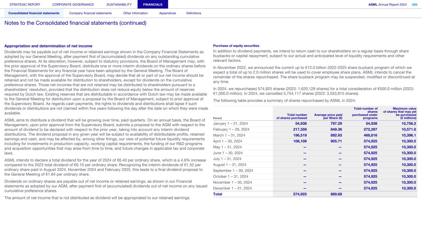 Appropriation and determination of net income Dividends may be payable out of net income or retained earnings shown in the Company Financial Statements as adopted by our General Meeting, after payment first of (accumulated) dividends on any outstanding cumulative preference shares. At its discretion, however, subject to statutory provisions, the Board of Management may, with the prior approval of the Supervisory Board, distribute one or more interim dividends on the ordinary shares before the Financial Statements for any financial year have been adopted by the General Meeting. The Board of Management, with the approval of the Supervisory Board, may decide that all or part of our net income should be retained and not be made available for distribution to shareholders, except for dividends on the cumulative preference shares. Those net incomes that are not retained may be distributed to shareholders pursuant to a shareholders’ resolution, provided that the distribution does not reduce equity below the amount of reserves required by Dutch law. Existing reserves that are distributable in accordance with Dutch law may be made available to the General Meeting for distribution upon a proposal by the Board of Management, subject to prior approval of the Supervisory Board. As regards cash payments, the rights to dividends and distributions shall lapse if such dividends or distributions are not claimed within five years following the day after the date on which they were made available. ASML aims to distribute a dividend that will be growing over time, paid quarterly. On an annual basis, the Board of Management, upon prior approval from the Supervisory Board, submits a proposal to the AGM with respect to the amount of dividend to be declared with respect to the prior year, taking into account any interim dividend distributions. The dividend proposal in any given year will be subject to availability of distributable profits, retained earnings and cash, and may be affected by, among other things, our view of potential future liquidity requirements including for investments in production capacity, working capital requirements, the funding of our R&D programs and acquisition opportunities that may arise from time to time, and future changes in applicable tax and corporate laws. ASML intends to declare a total dividend for the year of 2024 of €6.40 per ordinary share, which is a 4.9% increase compared to the 2023 total dividend of €6.10 per ordinary share. Recognizing the interim dividends of €1.52 per ordinary share paid in August 2024, November 2024 and February 2025, this leads to a final dividend proposal to the General Meeting of €1.84 per ordinary share. Dividends on ordinary shares are payable out of net income or retained earnings, as shown in our Financial statements as adopted by our AGM, after payment first of (accumulated) dividends out of net income on any issued cumulative preference shares. The amount of net income that is not distributed as dividend will be appropriated to our retained earnings. Purchase of equity securities In addition to dividend payments, we intend to return cash to our shareholders on a regular basis through share buybacks or capital repayment, subject to our actual and anticipated level of liquidity requirements and other relevant factors. In November 2022, we announced the current up to €12.0 billion 2022-2025 share buyback program of which we expect a total of up to 2.0 million shares will be used to cover employee share plans. ASML intends to cancel the remainder of the shares repurchased. The share buyback program may be suspended, modified or discontinued at any time. In 2024, we repurchased 574,925 shares (2023: 1,620,128 shares) for a total consideration of €500.0 million (2023: €1,000.0 million). In 2024, we cancelled 5,754,117 shares (2023: 3,553,815 shares). The following table provides a summary of shares repurchased by ASML in 2024: Period Total number of shares purchased Average price paid per Share (€) Total number of shares purchased under programs Maximum value of shares that may yet be purchased (€ millions) January 1 – 31, 2024 54,938 797.29 54,938 10,756.2 February 1 – 29, 2024 217,359 849.36 272,297 10,571.6 March 1 – 31, 2024 196,519 892.93 468,816 10,396.1 April 1 – 30, 2024 106,109 905.71 574,925 10,300.0 May 1 – 31, 2024 — — 574,925 10,300.0 June 1 – 30, 2024 — — 574,925 10,300.0 July 1 – 31, 2024 — — 574,925 10,300.0 August 1 – 31, 2024 — — 574,925 10,300.0 September 1 – 30, 2024 — — 574,925 10,300.0 October 1 – 31, 2024 — — 574,925 10,300.0 November 1 – 30, 2024 — — 574,925 10,300.0 December 1 – 31, 2024 — — 574,925 10,300.0 Total 574,925 869.68 STRATEGIC REPORT CORPORATE GOVERNANCE SUSTAINABILITY FINANCIALS ASML Annual Report 2024 368 Consolidated financial statements Company financial statements Other information Appendices Definitions Notes to the Consolidated financial statements (continued)
