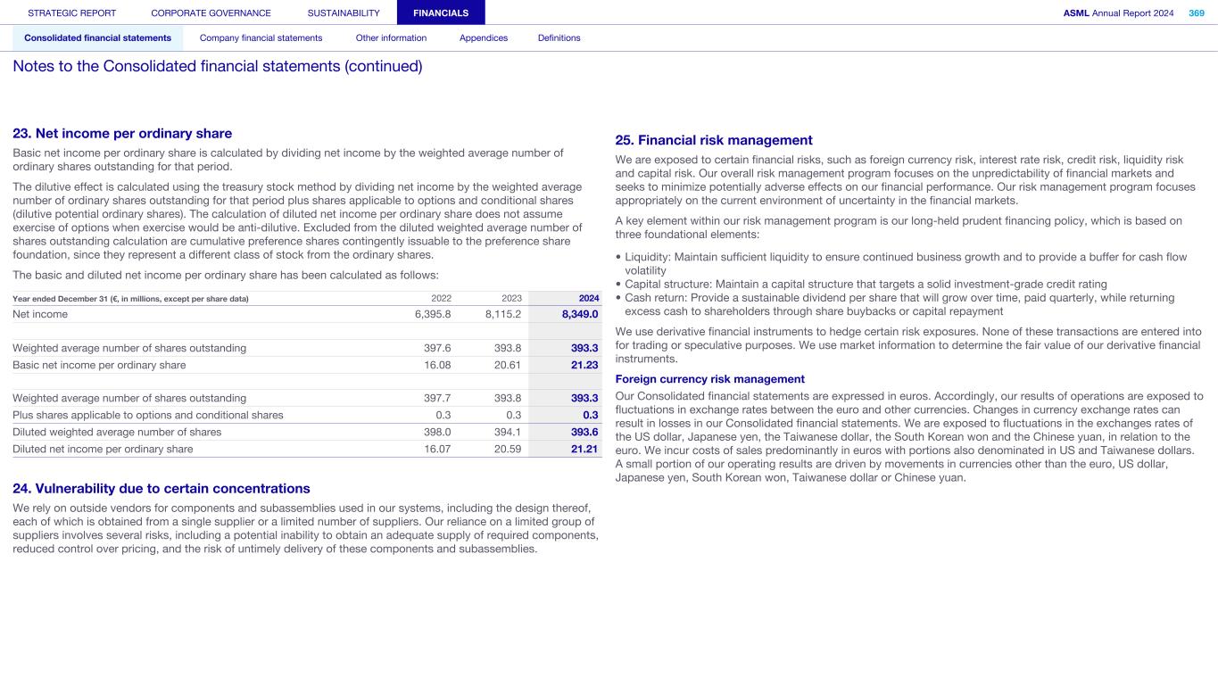 23. Net income per ordinary share Basic net income per ordinary share is calculated by dividing net income by the weighted average number of ordinary shares outstanding for that period. The dilutive effect is calculated using the treasury stock method by dividing net income by the weighted average number of ordinary shares outstanding for that period plus shares applicable to options and conditional shares (dilutive potential ordinary shares). The calculation of diluted net income per ordinary share does not assume exercise of options when exercise would be anti-dilutive. Excluded from the diluted weighted average number of shares outstanding calculation are cumulative preference shares contingently issuable to the preference share foundation, since they represent a different class of stock from the ordinary shares. The basic and diluted net income per ordinary share has been calculated as follows: Year ended December 31 (€, in millions, except per share data) 2022 2023 2024 Net income 6,395.8 8,115.2 8,349.0 Weighted average number of shares outstanding 397.6 393.8 393.3 Basic net income per ordinary share 16.08 20.61 21.23 Weighted average number of shares outstanding 397.7 393.8 393.3 Plus shares applicable to options and conditional shares 0.3 0.3 0.3 Diluted weighted average number of shares 398.0 394.1 393.6 Diluted net income per ordinary share 16.07 20.59 21.21 24. Vulnerability due to certain concentrations We rely on outside vendors for components and subassemblies used in our systems, including the design thereof, each of which is obtained from a single supplier or a limited number of suppliers. Our reliance on a limited group of suppliers involves several risks, including a potential inability to obtain an adequate supply of required components, reduced control over pricing, and the risk of untimely delivery of these components and subassemblies. 25. Financial risk management We are exposed to certain financial risks, such as foreign currency risk, interest rate risk, credit risk, liquidity risk and capital risk. Our overall risk management program focuses on the unpredictability of financial markets and seeks to minimize potentially adverse effects on our financial performance. Our risk management program focuses appropriately on the current environment of uncertainty in the financial markets. A key element within our risk management program is our long-held prudent financing policy, which is based on three foundational elements: • Liquidity: Maintain sufficient liquidity to ensure continued business growth and to provide a buffer for cash flow volatility • Capital structure: Maintain a capital structure that targets a solid investment-grade credit rating • Cash return: Provide a sustainable dividend per share that will grow over time, paid quarterly, while returning excess cash to shareholders through share buybacks or capital repayment We use derivative financial instruments to hedge certain risk exposures. None of these transactions are entered into for trading or speculative purposes. We use market information to determine the fair value of our derivative financial instruments. Foreign currency risk management Our Consolidated financial statements are expressed in euros. Accordingly, our results of operations are exposed to fluctuations in exchange rates between the euro and other currencies. Changes in currency exchange rates can result in losses in our Consolidated financial statements. We are exposed to fluctuations in the exchanges rates of the US dollar, Japanese yen, the Taiwanese dollar, the South Korean won and the Chinese yuan, in relation to the euro. We incur costs of sales predominantly in euros with portions also denominated in US and Taiwanese dollars. A small portion of our operating results are driven by movements in currencies other than the euro, US dollar, Japanese yen, South Korean won, Taiwanese dollar or Chinese yuan. STRATEGIC REPORT CORPORATE GOVERNANCE SUSTAINABILITY FINANCIALS ASML Annual Report 2024 369 Consolidated financial statements Company financial statements Other information Appendices Definitions Notes to the Consolidated financial statements (continued)