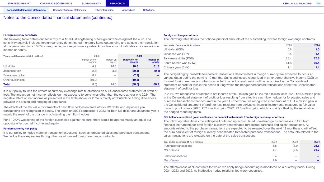 Foreign currency sensitivity The following table details our sensitivity to a 10.0% strengthening of foreign currencies against the euro. The sensitivity analysis includes foreign currency denominated monetary items outstanding and adjusts their translation at the period end for a 10.0% strengthening in foreign currency rates. A positive amount indicates an increase in net income or equity. Year ended December 31 (€, in millions) 2023 2024 Impact on net income Impact on equity Impact on net income Impact on equity US dollar 4.2 78.3 10.3 81.3 Japanese yen (2.6) (3.8) (30.4) (0.4) Taiwanese dollar 0.4 — (7.9) — Other currencies (10.0) — (10.5) — Total (8.0) 74.5 (38.5) 80.9 It is our policy to limit the effects of currency exchange rate fluctuations on our Consolidated statement of profit or loss. The impact on net income reflects our net exposure to currencies other than the euro at year end 2024. The negative effect on net income as presented in the table above for 2024 is mainly attributable to timing differences between the arising and hedging of exposures. The effects of the fair value movements of cash flow hedges entered into for US dollar and Japanese yen transactions are recognized in equity. The effect on 2024 compared to 2023 for both US dollar and Japanese yen is mainly the result of the change in outstanding cash flow hedges. For a 10.0% weakening of the foreign currencies against the euro, there would be approximately an equal but opposite effect on net income and equity. Foreign currency risk policy It is our policy to hedge material transaction exposures, such as forecasted sales and purchase transactions. We hedge these exposures through the use of forward foreign exchange contracts. Foreign exchange contracts The following table details the notional principal amounts of the outstanding forward foreign exchange contracts. Year ended December 31 (in billions) 2023 2024 US dollar (USD) 0.8 1.0 Japanese yen (JPY) 8.5 1.1 Taiwanese dollar (TWD) 26.4 27.6 South Korean won (KRW) 61.8 66.4 Chinese yuan (CNY) 1.1 1.1 The hedged highly probable forecasted transactions denominated in foreign currency are expected to occur at various dates during the coming 12 months. Gains and losses recognized in other comprehensive income (OCI) on forward foreign exchange contracts included in a hedge relationship will be recognized in the Consolidated statement of profit or loss in the period during which the hedged forecasted transactions affect the Consolidated statement of profit or loss. In 2024, we recognized a transfer to net income of €8.9 million gain (2023: €0.6 million loss; 2022: €66.5 million gain) in the Consolidated statement of profit or loss resulting from effective cash flow hedges for forecasted sales and purchase transactions that occurred in the year. Furthermore, we recognized a net amount of €31.4 million gain in the Consolidated statement of profit or loss resulting from derivative financial instruments measured at fair value through profit or loss (2023: €52.4 million gain; 2022: €3.6 million gain), which is mainly offset by the revaluation of the hedged monetary items. OCI balance unrealized gains and losses on financial instruments from foreign exchange contracts The following table details the anticipated outstanding accumulated unrealized gains and losses in OCI from financial instruments for both foreign currency denominated forecasted purchase and sales transactions. All amounts related to the purchase transactions are expected to be released over the next 12 months and will offset the euro equivalent of foreign currency denominated forecasted purchase transactions. The amounts related to the sales transactions are released on the date of the sales transactions. Year ended December 31 (€, in millions) 2022 2023 2024 Purchase transactions 5.5 (8.9) 25.6 Net of taxes 4.7 (7.6) 21.7 Sales transactions 3.4 — — Net of taxes 2.9 — — The effectiveness of all contracts for which we apply hedge accounting is monitored on a quarterly basis. During 2024, 2023 and 2022, no ineffective hedge relationships were recognized. STRATEGIC REPORT CORPORATE GOVERNANCE SUSTAINABILITY FINANCIALS ASML Annual Report 2024 370 Consolidated financial statements Company financial statements Other information Appendices Definitions Notes to the Consolidated financial statements (continued)
