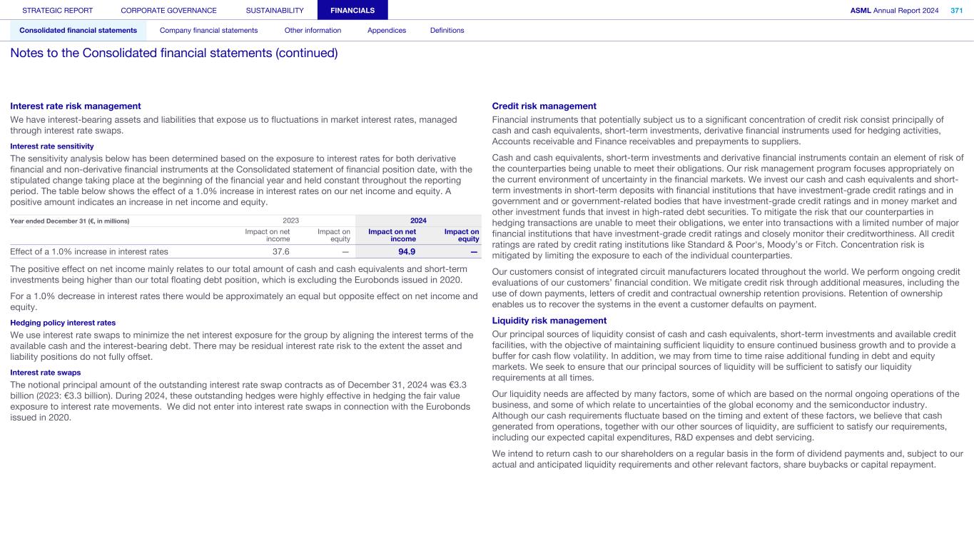 Interest rate risk management We have interest-bearing assets and liabilities that expose us to fluctuations in market interest rates, managed through interest rate swaps. Interest rate sensitivity The sensitivity analysis below has been determined based on the exposure to interest rates for both derivative financial and non-derivative financial instruments at the Consolidated statement of financial position date, with the stipulated change taking place at the beginning of the financial year and held constant throughout the reporting period. The table below shows the effect of a 1.0% increase in interest rates on our net income and equity. A positive amount indicates an increase in net income and equity. Year ended December 31 (€, in millions) 2023 2024 Impact on net income Impact on equity Impact on net income Impact on equity Effect of a 1.0% increase in interest rates 37.6 — 94.9 — The positive effect on net income mainly relates to our total amount of cash and cash equivalents and short-term investments being higher than our total floating debt position, which is excluding the Eurobonds issued in 2020. For a 1.0% decrease in interest rates there would be approximately an equal but opposite effect on net income and equity. Hedging policy interest rates We use interest rate swaps to minimize the net interest exposure for the group by aligning the interest terms of the available cash and the interest-bearing debt. There may be residual interest rate risk to the extent the asset and liability positions do not fully offset. Interest rate swaps The notional principal amount of the outstanding interest rate swap contracts as of December 31, 2024 was €3.3 billion (2023: €3.3 billion). During 2024, these outstanding hedges were highly effective in hedging the fair value exposure to interest rate movements. We did not enter into interest rate swaps in connection with the Eurobonds issued in 2020. Credit risk management Financial instruments that potentially subject us to a significant concentration of credit risk consist principally of cash and cash equivalents, short-term investments, derivative financial instruments used for hedging activities, Accounts receivable and Finance receivables and prepayments to suppliers. Cash and cash equivalents, short-term investments and derivative financial instruments contain an element of risk of the counterparties being unable to meet their obligations. Our risk management program focuses appropriately on the current environment of uncertainty in the financial markets. We invest our cash and cash equivalents and short- term investments in short-term deposits with financial institutions that have investment-grade credit ratings and in government and or government-related bodies that have investment-grade credit ratings and in money market and other investment funds that invest in high-rated debt securities. To mitigate the risk that our counterparties in hedging transactions are unable to meet their obligations, we enter into transactions with a limited number of major financial institutions that have investment-grade credit ratings and closely monitor their creditworthiness. All credit ratings are rated by credit rating institutions like Standard & Poor's, Moody’s or Fitch. Concentration risk is mitigated by limiting the exposure to each of the individual counterparties. Our customers consist of integrated circuit manufacturers located throughout the world. We perform ongoing credit evaluations of our customers’ financial condition. We mitigate credit risk through additional measures, including the use of down payments, letters of credit and contractual ownership retention provisions. Retention of ownership enables us to recover the systems in the event a customer defaults on payment. Liquidity risk management Our principal sources of liquidity consist of cash and cash equivalents, short-term investments and available credit facilities, with the objective of maintaining sufficient liquidity to ensure continued business growth and to provide a buffer for cash flow volatility. In addition, we may from time to time raise additional funding in debt and equity markets. We seek to ensure that our principal sources of liquidity will be sufficient to satisfy our liquidity requirements at all times. Our liquidity needs are affected by many factors, some of which are based on the normal ongoing operations of the business, and some of which relate to uncertainties of the global economy and the semiconductor industry. Although our cash requirements fluctuate based on the timing and extent of these factors, we believe that cash generated from operations, together with our other sources of liquidity, are sufficient to satisfy our requirements, including our expected capital expenditures, R&D expenses and debt servicing. We intend to return cash to our shareholders on a regular basis in the form of dividend payments and, subject to our actual and anticipated liquidity requirements and other relevant factors, share buybacks or capital repayment. STRATEGIC REPORT CORPORATE GOVERNANCE SUSTAINABILITY FINANCIALS ASML Annual Report 2024 371 Consolidated financial statements Company financial statements Other information Appendices Definitions Notes to the Consolidated financial statements (continued)
