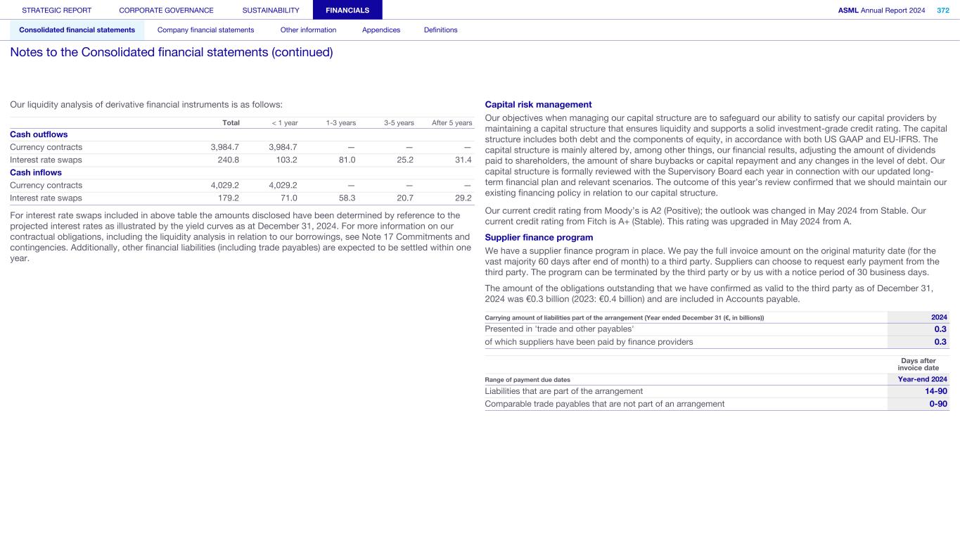 Our liquidity analysis of derivative financial instruments is as follows: Total < 1 year 1-3 years 3-5 years After 5 years Cash outflows Currency contracts 3,984.7 3,984.7 — — — Interest rate swaps 240.8 103.2 81.0 25.2 31.4 Cash inflows Currency contracts 4,029.2 4,029.2 — — — Interest rate swaps 179.2 71.0 58.3 20.7 29.2 For interest rate swaps included in above table the amounts disclosed have been determined by reference to the projected interest rates as illustrated by the yield curves as at December 31, 2024. For more information on our contractual obligations, including the liquidity analysis in relation to our borrowings, see Note 17 Commitments and contingencies. Additionally, other financial liabilities (including trade payables) are expected to be settled within one year. Capital risk management Our objectives when managing our capital structure are to safeguard our ability to satisfy our capital providers by maintaining a capital structure that ensures liquidity and supports a solid investment-grade credit rating. The capital structure includes both debt and the components of equity, in accordance with both US GAAP and EU-IFRS. The capital structure is mainly altered by, among other things, our financial results, adjusting the amount of dividends paid to shareholders, the amount of share buybacks or capital repayment and any changes in the level of debt. Our capital structure is formally reviewed with the Supervisory Board each year in connection with our updated long- term financial plan and relevant scenarios. The outcome of this year’s review confirmed that we should maintain our existing financing policy in relation to our capital structure. Our current credit rating from Moody’s is A2 (Positive); the outlook was changed in May 2024 from Stable. Our current credit rating from Fitch is A+ (Stable). This rating was upgraded in May 2024 from A. Supplier finance program We have a supplier finance program in place. We pay the full invoice amount on the original maturity date (for the vast majority 60 days after end of month) to a third party. Suppliers can choose to request early payment from the third party. The program can be terminated by the third party or by us with a notice period of 30 business days. The amount of the obligations outstanding that we have confirmed as valid to the third party as of December 31, 2024 was €0.3 billion (2023: €0.4 billion) and are included in Accounts payable. Carrying amount of liabilities part of the arrangement (Year ended December 31 (€, in billions)) 2024 Presented in 'trade and other payables' 0.3 of which suppliers have been paid by finance providers 0.3 Days after invoice date Range of payment due dates Year-end 2024 Liabilities that are part of the arrangement 14-90 Comparable trade payables that are not part of an arrangement 0-90 STRATEGIC REPORT CORPORATE GOVERNANCE SUSTAINABILITY FINANCIALS ASML Annual Report 2024 372 Consolidated financial statements Company financial statements Other information Appendices Definitions Notes to the Consolidated financial statements (continued)