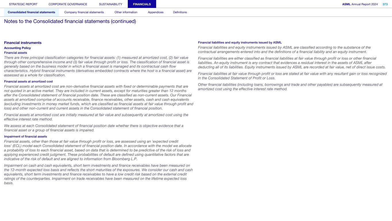 Financial instruments Accounting Policy Financial assets There are three principal classification categories for financial assets: (1) measured at amortized cost, (2) fair value through other comprehensive income and (3) fair value through profit or loss. The classification of financial asset is generally based on the business model in which a financial asset is managed and its contractual cash flow characteristics. Hybrid financial instruments (derivatives embedded contracts where the host is a financial asset) are assessed as a whole for classification. Financial assets at amortized cost Financial assets at amortized cost are non-derivative financial assets with fixed or determinable payments that are not quoted in an active market. They are included in current assets, except for maturities greater than 12 months after the Consolidated statement of financial position date. These are classified as non-current assets. Our Financial assets at amortized comprise of accounts receivable, finance receivables, other assets, cash and cash equivalents (excluding investments in money market funds, which are classified as financial assets at fair value through profit and loss) and other non-current and current assets in the Consolidated statement of financial position. Financial assets at amortized cost are initially measured at fair value and subsequently at amortized cost using the effective interest rate method. We assess at each Consolidated statement of financial position date whether there is objective evidence that a financial asset or a group of financial assets is impaired. Impairment of financial assets Financial assets, other than those at fair value through profit or loss, are assessed using an 'expected credit loss' (ECL) model each Consolidated statement of financial position date. In accordance with the model we allocate a probability of loss to each financial asset, based on data that is determined to be predictive of the risk of loss and applying experienced credit judgment. These probabilities of default are defined using quantitative factors that are indicative of the risk of default and are aligned to information from Bloomberg L.P. Impairment on cash and cash equivalents, short term investments and finance receivables have been measured on the 12-month expected loss basis and reflects the short maturities of the exposures. We consider our cash and cash equivalents, short term investments and finance receivables to have a low credit risk based on the external credit ratings of the counterparties. Impairment on trade receivables have been measured on the lifetime expected loss basis. Financial liabilities and equity instruments issued by ASML Financial liabilities and equity instruments issued by ASML are classified according to the substance of the contractual arrangements entered into and the definitions of a financial liability and an equity instrument. Financial liabilities are either classified as financial liabilities at fair value through profit or loss or other financial liabilities. An equity instrument is any contract that evidences a residual interest in the assets of ASML after deducting all of its liabilities. Equity instruments issued by ASML are recorded at fair value, net of direct issue costs. Financial liabilities at fair value through profit or loss are stated at fair value with any resultant gain or loss recognized in the Consolidated Statement of Profit or Loss. Other financial liabilities (including loans, borrowings and trade and other payables) are subsequently measured at amortized cost using the effective interest rate method. STRATEGIC REPORT CORPORATE GOVERNANCE SUSTAINABILITY FINANCIALS ASML Annual Report 2024 373 Consolidated financial statements Company financial statements Other information Appendices Definitions Notes to the Consolidated financial statements (continued)