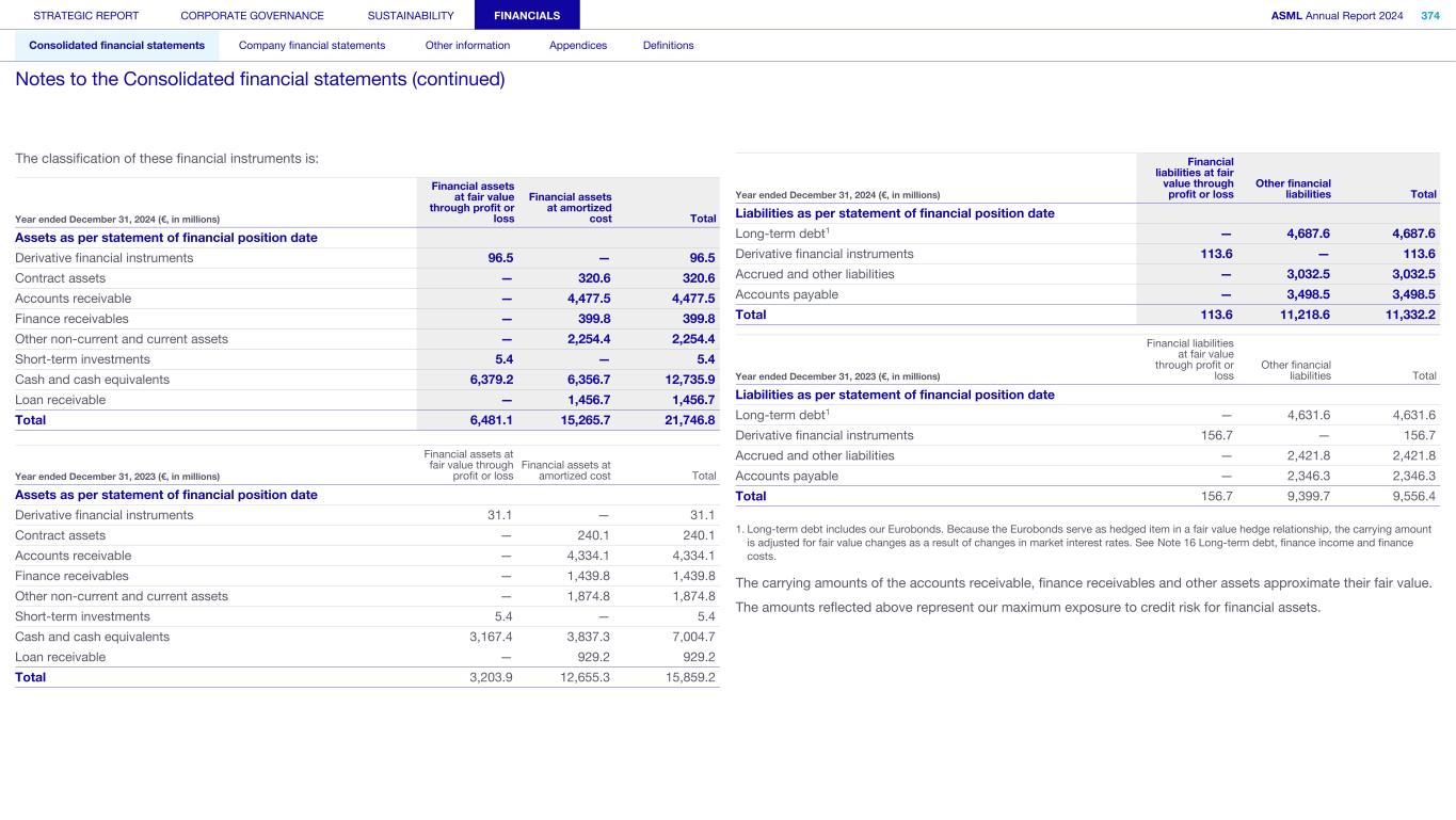 The classification of these financial instruments is: Year ended December 31, 2024 (€, in millions) Financial assets at fair value through profit or loss Financial assets at amortized cost Total Assets as per statement of financial position date Derivative financial instruments 96.5 — 96.5 Contract assets — 320.6 320.6 Accounts receivable — 4,477.5 4,477.5 Finance receivables — 399.8 399.8 Other non-current and current assets — 2,254.4 2,254.4 Short-term investments 5.4 — 5.4 Cash and cash equivalents 6,379.2 6,356.7 12,735.9 Loan receivable — 1,456.7 1,456.7 Total 6,481.1 15,265.7 21,746.8 Year ended December 31, 2023 (€, in millions) Financial assets at fair value through profit or loss Financial assets at amortized cost Total Assets as per statement of financial position date Derivative financial instruments 31.1 — 31.1 Contract assets — 240.1 240.1 Accounts receivable — 4,334.1 4,334.1 Finance receivables — 1,439.8 1,439.8 Other non-current and current assets — 1,874.8 1,874.8 Short-term investments 5.4 — 5.4 Cash and cash equivalents 3,167.4 3,837.3 7,004.7 Loan receivable — 929.2 929.2 Total 3,203.9 12,655.3 15,859.2 Year ended December 31, 2024 (€, in millions) Financial liabilities at fair value through profit or loss Other financial liabilities Total Liabilities as per statement of financial position date Long-term debt1 — 4,687.6 4,687.6 Derivative financial instruments 113.6 — 113.6 Accrued and other liabilities — 3,032.5 3,032.5 Accounts payable — 3,498.5 3,498.5 Total 113.6 11,218.6 11,332.2 Year ended December 31, 2023 (€, in millions) Financial liabilities at fair value through profit or loss Other financial liabilities Total Liabilities as per statement of financial position date Long-term debt1 — 4,631.6 4,631.6 Derivative financial instruments 156.7 — 156.7 Accrued and other liabilities — 2,421.8 2,421.8 Accounts payable — 2,346.3 2,346.3 Total 156.7 9,399.7 9,556.4 1. Long-term debt includes our Eurobonds. Because the Eurobonds serve as hedged item in a fair value hedge relationship, the carrying amount is adjusted for fair value changes as a result of changes in market interest rates. See Note 16 Long-term debt, finance income and finance costs. The carrying amounts of the accounts receivable, finance receivables and other assets approximate their fair value. The amounts reflected above represent our maximum exposure to credit risk for financial assets. STRATEGIC REPORT CORPORATE GOVERNANCE SUSTAINABILITY FINANCIALS ASML Annual Report 2024 374 Consolidated financial statements Company financial statements Other information Appendices Definitions Notes to the Consolidated financial statements (continued)