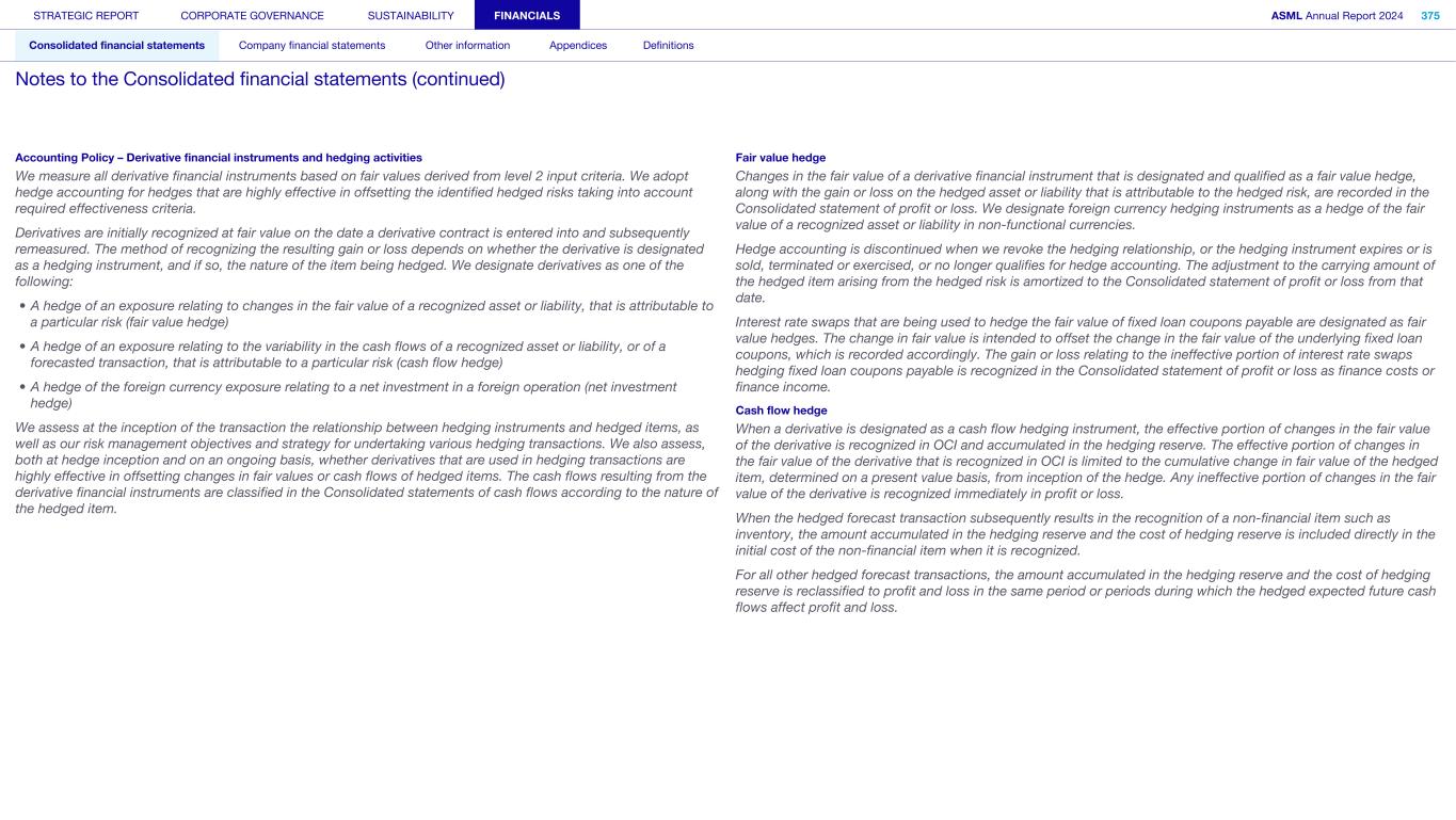 Accounting Policy – Derivative financial instruments and hedging activities We measure all derivative financial instruments based on fair values derived from level 2 input criteria. We adopt hedge accounting for hedges that are highly effective in offsetting the identified hedged risks taking into account required effectiveness criteria. Derivatives are initially recognized at fair value on the date a derivative contract is entered into and subsequently remeasured. The method of recognizing the resulting gain or loss depends on whether the derivative is designated as a hedging instrument, and if so, the nature of the item being hedged. We designate derivatives as one of the following: • A hedge of an exposure relating to changes in the fair value of a recognized asset or liability, that is attributable to a particular risk (fair value hedge) • A hedge of an exposure relating to the variability in the cash flows of a recognized asset or liability, or of a forecasted transaction, that is attributable to a particular risk (cash flow hedge) • A hedge of the foreign currency exposure relating to a net investment in a foreign operation (net investment hedge) We assess at the inception of the transaction the relationship between hedging instruments and hedged items, as well as our risk management objectives and strategy for undertaking various hedging transactions. We also assess, both at hedge inception and on an ongoing basis, whether derivatives that are used in hedging transactions are highly effective in offsetting changes in fair values or cash flows of hedged items. The cash flows resulting from the derivative financial instruments are classified in the Consolidated statements of cash flows according to the nature of the hedged item. Fair value hedge Changes in the fair value of a derivative financial instrument that is designated and qualified as a fair value hedge, along with the gain or loss on the hedged asset or liability that is attributable to the hedged risk, are recorded in the Consolidated statement of profit or loss. We designate foreign currency hedging instruments as a hedge of the fair value of a recognized asset or liability in non-functional currencies. Hedge accounting is discontinued when we revoke the hedging relationship, or the hedging instrument expires or is sold, terminated or exercised, or no longer qualifies for hedge accounting. The adjustment to the carrying amount of the hedged item arising from the hedged risk is amortized to the Consolidated statement of profit or loss from that date. Interest rate swaps that are being used to hedge the fair value of fixed loan coupons payable are designated as fair value hedges. The change in fair value is intended to offset the change in the fair value of the underlying fixed loan coupons, which is recorded accordingly. The gain or loss relating to the ineffective portion of interest rate swaps hedging fixed loan coupons payable is recognized in the Consolidated statement of profit or loss as finance costs or finance income. Cash flow hedge When a derivative is designated as a cash flow hedging instrument, the effective portion of changes in the fair value of the derivative is recognized in OCI and accumulated in the hedging reserve. The effective portion of changes in the fair value of the derivative that is recognized in OCI is limited to the cumulative change in fair value of the hedged item, determined on a present value basis, from inception of the hedge. Any ineffective portion of changes in the fair value of the derivative is recognized immediately in profit or loss. When the hedged forecast transaction subsequently results in the recognition of a non-financial item such as inventory, the amount accumulated in the hedging reserve and the cost of hedging reserve is included directly in the initial cost of the non-financial item when it is recognized. For all other hedged forecast transactions, the amount accumulated in the hedging reserve and the cost of hedging reserve is reclassified to profit and loss in the same period or periods during which the hedged expected future cash flows affect profit and loss. STRATEGIC REPORT CORPORATE GOVERNANCE SUSTAINABILITY FINANCIALS ASML Annual Report 2024 375 Consolidated financial statements Company financial statements Other information Appendices Definitions Notes to the Consolidated financial statements (continued)