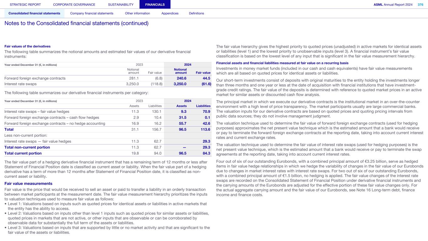 Fair values of the derivatives The following table summarizes the notional amounts and estimated fair values of our derivative financial instruments: Year ended December 31 (€, in millions) 2023 2024 Notional amount Fair value Notional amount Fair value Forward foreign exchange contracts 281.1 (6.8) 240.6 44.5 Interest rate swaps 3,250.0 (118.8) 3,250.0 (61.6) The following table summarizes our derivative financial instruments per category: Year ended December 31 (€, in millions) 2023 2024 Assets Liabilities Assets Liabilities Interest rate swaps – fair value hedges 11.3 130.1 9.3 70.9 Forward foreign exchange contracts – cash flow hedges 2.9 10.4 31.5 0.1 Forward foreign exchange contracts – no hedge accounting 16.9 16.2 55.7 42.6 Total 31.1 156.7 96.5 113.6 Less non-current portion: Interest rate swaps — fair value hedges 11.3 62.7 29.3 Total non-current portion 11.3 62.7 — 29.3 Total current portion 19.8 94.0 96.5 84.3 The fair value part of a hedging derivative financial instrument that has a remaining term of 12 months or less after Statement of Financial Position date is classified as current asset or liability. When the fair value part of a hedging derivative has a term of more than 12 months after Statement of Financial Position date, it is classified as non- current asset or liability. Fair value measurements Fair value is the price that would be received to sell an asset or paid to transfer a liability in an orderly transaction between market participants at the measurement date. The fair value measurement hierarchy prioritizes the inputs to valuation techniques used to measure fair value as follows: • Level 1: Valuations based on inputs such as quoted prices for identical assets or liabilities in active markets that the entity has the ability to access. • Level 2: Valuations based on inputs other than level 1 inputs such as quoted prices for similar assets or liabilities, quoted prices in markets that are not active, or other inputs that are observable or can be corroborated by observable data for substantially the full term of the assets or liabilities. • Level 3: Valuations based on inputs that are supported by little or no market activity and that are significant to the fair value of the assets or liabilities. The fair value hierarchy gives the highest priority to quoted prices (unadjusted) in active markets for identical assets or liabilities (level 1) and the lowest priority to unobservable inputs (level 3). A financial instrument’s fair value classification is based on the lowest level of any input that is significant in the fair value measurement hierarchy. Financial assets and financial liabilities measured at fair value on a recurring basis Investments in money market funds (included in our cash and cash equivalents) have fair value measurements which are all based on quoted prices for identical assets or liabilities. Our short-term investments consist of deposits with original maturities to the entity holding the investments longer than three months and one year or less at the date of acquisition with financial institutions that have investment- grade credit ratings. The fair value of the deposits is determined with reference to quoted market prices in an active market for similar assets or discounted cash flow analysis. The principal market in which we execute our derivative contracts is the institutional market in an over-the-counter environment with a high level of price transparency. The market participants usually are large commercial banks. The valuation inputs for our derivative contracts are based on quoted prices and quoting pricing intervals from public data sources; they do not involve management judgment. The valuation technique used to determine the fair value of forward foreign exchange contracts (used for hedging purposes) approximates the net present value technique which is the estimated amount that a bank would receive or pay to terminate the forward foreign exchange contracts at the reporting date, taking into account current interest rates and current exchange rates. The valuation technique used to determine the fair value of interest rate swaps (used for hedging purposes) is the net present value technique, which is the estimated amount that a bank would receive or pay to terminate the swap agreements at the reporting date, taking into account current interest rates. Four out of six of our outstanding Eurobonds, with a combined principal amount of €3.25 billion, serve as hedged items in fair value hedge relationships in which we hedge the variability of changes in the fair value of our Eurobonds due to changes in market interest rates with interest rate swaps. For two out of six of our outstanding Eurobonds, with a combined principal amount of €1.5 billion, no hedging is applied. The fair value changes of the interest rate swaps are recorded on the Consolidated Statement of Financial Position under derivative financial instruments and the carrying amounts of the Eurobonds are adjusted for the effective portion of these fair value changes only. For the actual aggregate carrying amount and the fair value of our Eurobonds, see Note 16 Long-term debt, finance income and finance costs. STRATEGIC REPORT CORPORATE GOVERNANCE SUSTAINABILITY FINANCIALS ASML Annual Report 2024 376 Consolidated financial statements Company financial statements Other information Appendices Definitions Notes to the Consolidated financial statements (continued)