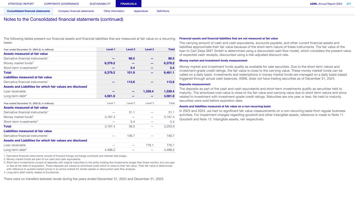 The following tables present our financial assets and financial liabilities that are measured at fair value on a recurring basis: Year ended December 31, 2024 (€, in millions) Level 1 Level 2 Level 3 Total Assets measured at fair value Derivative financial instruments1 — 96.5 — 96.5 Money market funds2 6,379.2 — — 6,379.2 Short-term investments3 — 5.4 — 5.4 Total 6,379.2 101.9 — 6,481.1 Liabilities measured at fair value Derivative financial instruments1 — 113.6 — 113.6 Assets and Liabilities for which fair values are disclosed Loan receivable — — 1,339.4 1,339.4 Long-term debt4 4,561.8 — — 4,561.8 Year ended December 31, 2023 (€, in millions) Level 1 Level 2 Level 3 Total Assets measured at fair value Derivative financial instruments1 — 31.1 — 31.1 Money market funds2 3,167.4 — — 3,167.4 Short-term investments3 — 5.4 — 5.4 Total 3,167.4 36.5 — 3,203.9 Liabilities measured at fair value Derivative financial instruments1 — 156.7 — 156.7 Assets and Liabilities for which fair values are disclosed Loan receivable — — 776.1 776.1 Long-term debt4 4,496.2 — — 4,496.2 1. Derivative financial instruments consist of forward foreign exchange contracts and interest rate swaps. 2. Money market funds are part of our cash and cash equivalents. 3. Short-term investments consist of deposits with original maturities to the entity holding the investments longer than three months, but one year or less at the date of acquisition. These deposits are valued at amortized costs which is close to their fair value. Their fair value is determined with reference to quoted market prices in an active market for similar assets or discounted cash flow analysis. 4. Long-term debt mainly relates to Eurobonds. There were no transfers between levels during the years ended December 31, 2024 and December 31, 2023. Financial assets and financial liabilities that are not measured at fair value The carrying amount of cash and cash equivalents, accounts payable, and other current financial assets and liabilities approximate their fair value because of the short-term nature of these instruments. The fair value of the loan to Carl Zeiss SMT GmbH is determined using a discounted cash flow model, which considers the present value of expected cash receipts, discounted using a risk-adjusted discount rate. Money market and investment funds measurement Money market and investment funds qualify as available for sale securities. Due to the short-term nature and investment-grade credit ratings, the fair value is close to the carrying value. These money market funds can be called on a daily basis. Investments and redemptions in money market funds are managed on a daily basis based triggered through actual cash balances. ASML does not have trading securities as of December 31, 2024. Deposits measurement The deposits as part of the cash and cash equivalents and short-term investments qualify as securities held to maturity. The amortized cost value is close to the fair value and carrying value due to short-term nature and since related to investment with investment-grade credit ratings. Maturities are one year or less. No held to maturity securities were sold before expiration date. Assets and liabilities measured at fair value on a non-recurring basis In 2023 and 2024, we had no significant fair value measurements on a non-recurring basis from regular business activities. For impairment charges regarding goodwill and other intangible assets, reference is made to Note 11. Goodwill and Note 12. Intangible assets, net respectively. STRATEGIC REPORT CORPORATE GOVERNANCE SUSTAINABILITY FINANCIALS ASML Annual Report 2024 377 Consolidated financial statements Company financial statements Other information Appendices Definitions Notes to the Consolidated financial statements (continued)