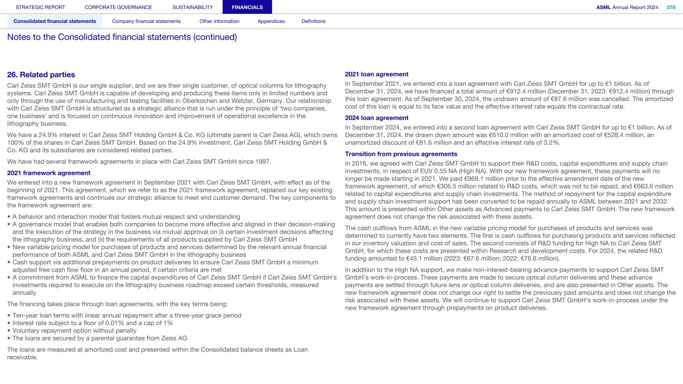 26. Related parties Carl Zeiss SMT GmbH is our single supplier, and we are their single customer, of optical columns for lithography systems. Carl Zeiss SMT GmbH is capable of developing and producing these items only in limited numbers and only through the use of manufacturing and testing facilities in Oberkochen and Wetzlar, Germany. Our relationship with Carl Zeiss SMT GmbH is structured as a strategic alliance that is run under the principle of ‘two companies, one business’ and is focused on continuous innovation and improvement of operational excellence in the lithography business. We have a 24.9% interest in Carl Zeiss SMT Holding GmbH & Co. KG (ultimate parent is Carl Zeiss AG), which owns 100% of the shares in Carl Zeiss SMT GmbH. Based on the 24.9% investment, Carl Zeiss SMT Holding GmbH & Co. KG and its subsidiaries are considered related parties. We have had several framework agreements in place with Carl Zeiss SMT GmbH since 1997. 2021 framework agreement We entered into a new framework agreement in September 2021 with Carl Zeiss SMT GmbH, with effect as of the beginning of 2021. This agreement, which we refer to as the 2021 framework agreement, replaced our key existing framework agreements and continues our strategic alliance to meet end customer demand. The key components to the framework agreement are: • A behavior and interaction model that fosters mutual respect and understanding • A governance model that enables both companies to become more effective and aligned in their decision-making and the execution of the strategy in the business via mutual approval on (i) certain investment decisions affecting the lithography business, and (ii) the requirements of all products supplied by Carl Zeiss SMT GmbH • New variable pricing model for purchases of products and services determined by the relevant annual financial performance of both ASML and Carl Zeiss SMT GmbH in the lithography business • Cash support via additional prepayments on product deliveries to ensure Carl Zeiss SMT GmbH a minimum adjusted free cash flow floor in an annual period, if certain criteria are met • A commitment from ASML to finance the capital expenditures of Carl Zeiss SMT GmbH if Carl Zeiss SMT GmbH's investments required to execute on the lithography business roadmap exceed certain thresholds, measured annually The financing takes place through loan agreements, with the key terms being: • Ten-year loan terms with linear annual repayment after a three-year grace period • Interest rate subject to a floor of 0.01% and a cap of 1% • Voluntary repayment option without penalty • The loans are secured by a parental guarantee from Zeiss AG The loans are measured at amortized cost and presented within the Consolidated balance sheets as Loan receivable. 2021 loan agreement In September 2021, we entered into a loan agreement with Carl Zeiss SMT GmbH for up to €1 billion. As of December 31, 2024, we have financed a total amount of €912.4 million (December 31, 2023: €912.4 million) through this loan agreement. As of September 30, 2024, the undrawn amount of €87.6 million was cancelled. The amortized cost of this loan is equal to its face value and the effective interest rate equals the contractual rate. 2024 loan agreement In September 2024, we entered into a second loan agreement with Carl Zeiss SMT GmbH for up to €1 billion. As of December 31, 2024, the drawn down amount was €610.0 million with an amortized cost of €528.4 million, an unamortized discount of €81.6 million and an effective interest rate of 3.2%. Transition from previous agreements In 2016, we agreed with Carl Zeiss SMT GmbH to support their R&D costs, capital expenditures and supply chain investments, in respect of EUV 0.55 NA (High NA). With our new framework agreement, these payments will no longer be made starting in 2021. We paid €969.1 million prior to the effective amendment date of the new framework agreement, of which €305.5 million related to R&D costs, which was not to be repaid, and €663.6 million related to capital expenditures and supply chain investments. The method of repayment for the capital expenditure and supply chain investment support has been converted to be repaid annually to ASML between 2021 and 2032. This amount is presented within Other assets as Advanced payments to Carl Zeiss SMT GmbH. The new framework agreement does not change the risk associated with these assets. The cash outflows from ASML in the new variable pricing model for purchases of products and services was determined to currently have two elements. The first is cash outflows for purchasing products and services reflected in our inventory valuation and cost of sales. The second consists of R&D funding for High NA to Carl Zeiss SMT GmbH, for which these costs are presented within Research and development costs. For 2024, the related R&D funding amounted to €45.1 million (2023: €67.6 million; 2022: €76.6 million). In addition to the High NA support, we make non-interest-bearing advance payments to support Carl Zeiss SMT GmbH’s work-in-process. These payments are made to secure optical column deliveries and these advance payments are settled through future lens or optical column deliveries, and are also presented in Other assets. The new framework agreement does not change our right to settle the previously paid amounts and does not change the risk associated with these assets. We will continue to support Carl Zeiss SMT GmbH’s work-in-process under the new framework agreement through prepayments on product deliveries. STRATEGIC REPORT CORPORATE GOVERNANCE SUSTAINABILITY FINANCIALS ASML Annual Report 2024 378 Consolidated financial statements Company financial statements Other information Appendices Definitions Notes to the Consolidated financial statements (continued)