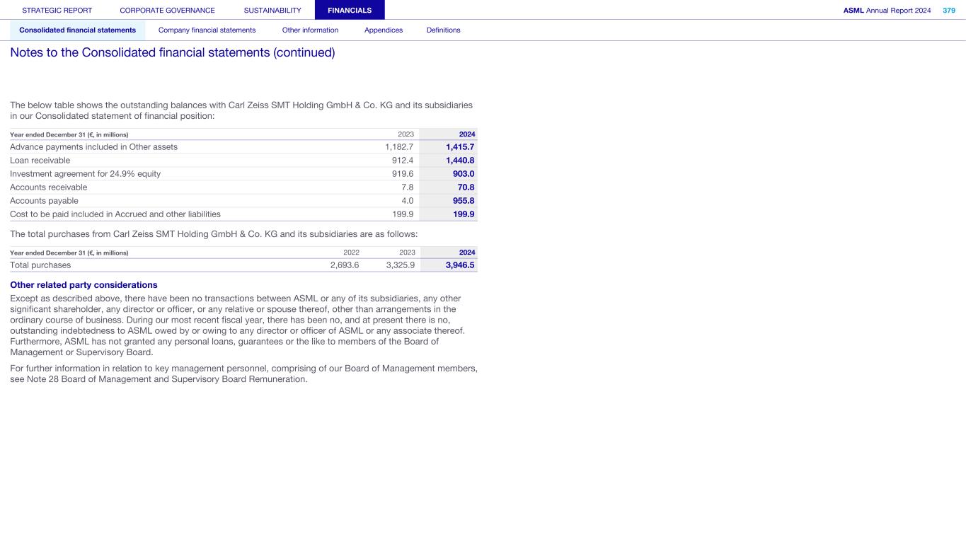 The below table shows the outstanding balances with Carl Zeiss SMT Holding GmbH & Co. KG and its subsidiaries in our Consolidated statement of financial position: Year ended December 31 (€, in millions) 2023 2024 Advance payments included in Other assets 1,182.7 1,415.7 Loan receivable 912.4 1,440.8 Investment agreement for 24.9% equity 919.6 903.0 Accounts receivable 7.8 70.8 Accounts payable 4.0 955.8 Cost to be paid included in Accrued and other liabilities 199.9 199.9 The total purchases from Carl Zeiss SMT Holding GmbH & Co. KG and its subsidiaries are as follows: Year ended December 31 (€, in millions) 2022 2023 2024 Total purchases 2,693.6 3,325.9 3,946.5 Other related party considerations Except as described above, there have been no transactions between ASML or any of its subsidiaries, any other significant shareholder, any director or officer, or any relative or spouse thereof, other than arrangements in the ordinary course of business. During our most recent fiscal year, there has been no, and at present there is no, outstanding indebtedness to ASML owed by or owing to any director or officer of ASML or any associate thereof. Furthermore, ASML has not granted any personal loans, guarantees or the like to members of the Board of Management or Supervisory Board. For further information in relation to key management personnel, comprising of our Board of Management members, see Note 28 Board of Management and Supervisory Board Remuneration. STRATEGIC REPORT CORPORATE GOVERNANCE SUSTAINABILITY FINANCIALS ASML Annual Report 2024 379 Consolidated financial statements Company financial statements Other information Appendices Definitions Notes to the Consolidated financial statements (continued)