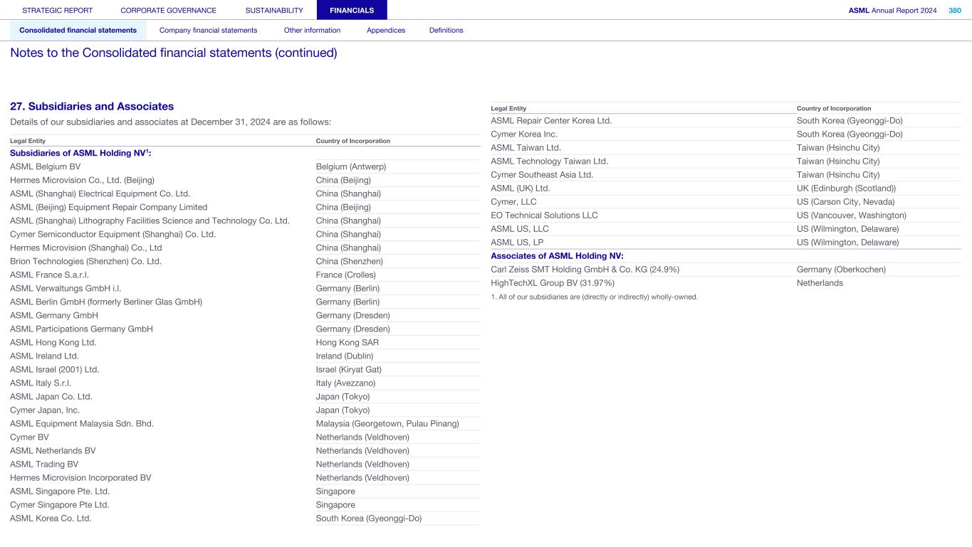 27. Subsidiaries and Associates Details of our subsidiaries and associates at December 31, 2024 are as follows: Subsidiaries of ASML Holding NV1: ASML Belgium BV Belgium (Antwerp) Hermes Microvision Co., Ltd. (Beijing) China (Beijing) ASML (Shanghai) Electrical Equipment Co. Ltd. China (Shanghai) ASML (Beijing) Equipment Repair Company Limited China (Beijing) ASML (Shanghai) Lithography Facilities Science and Technology Co. Ltd. China (Shanghai) Cymer Semiconductor Equipment (Shanghai) Co. Ltd. China (Shanghai) Hermes Microvision (Shanghai) Co., Ltd China (Shanghai) Brion Technologies (Shenzhen) Co. Ltd. China (Shenzhen) ASML France S.a.r.l. France (Crolles) ASML Verwaltungs GmbH i.l. Germany (Berlin) ASML Berlin GmbH (formerly Berliner Glas GmbH) Germany (Berlin) ASML Germany GmbH Germany (Dresden) ASML Participations Germany GmbH Germany (Dresden) ASML Hong Kong Ltd. Hong Kong SAR ASML Ireland Ltd. Ireland (Dublin) ASML Israel (2001) Ltd. Israel (Kiryat Gat) ASML Italy S.r.l. Italy (Avezzano) ASML Japan Co. Ltd. Japan (Tokyo) Cymer Japan, Inc. Japan (Tokyo) ASML Equipment Malaysia Sdn. Bhd. Malaysia (Georgetown, Pulau Pinang) Cymer BV Netherlands (Veldhoven) ASML Netherlands BV Netherlands (Veldhoven) ASML Trading BV Netherlands (Veldhoven) Hermes Microvision Incorporated BV Netherlands (Veldhoven) ASML Singapore Pte. Ltd. Singapore Cymer Singapore Pte Ltd. Singapore ASML Korea Co. Ltd. South Korea (Gyeonggi-Do) Legal Entity Country of Incorporation ASML Repair Center Korea Ltd. South Korea (Gyeonggi-Do) Cymer Korea Inc. South Korea (Gyeonggi-Do) ASML Taiwan Ltd. Taiwan (Hsinchu City) ASML Technology Taiwan Ltd. Taiwan (Hsinchu City) Cymer Southeast Asia Ltd. Taiwan (Hsinchu City) ASML (UK) Ltd. UK (Edinburgh (Scotland)) Cymer, LLC US (Carson City, Nevada) EO Technical Solutions LLC US (Vancouver, Washington) ASML US, LLC US (Wilmington, Delaware) ASML US, LP US (Wilmington, Delaware) Associates of ASML Holding NV: Carl Zeiss SMT Holding GmbH & Co. KG (24.9%) Germany (Oberkochen) HighTechXL Group BV (31.97%) Netherlands Legal Entity Country of Incorporation 1. All of our subsidiaries are (directly or indirectly) wholly-owned. STRATEGIC REPORT CORPORATE GOVERNANCE SUSTAINABILITY FINANCIALS ASML Annual Report 2024 380 Consolidated financial statements Company financial statements Other information Appendices Definitions Notes to the Consolidated financial statements (continued)