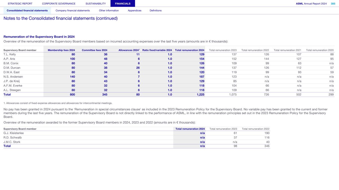 Remuneration of the Supervisory Board in 2024 Overview of the remuneration of the Supervisory Board members based on incurred accounting expenses over the last five years (amounts are in € thousands): Supervisory Board member Membership fees 2024 Committee fees 2024 Allowances 20241 Ratio fixed/variable 2024 Total remuneration 2024 Total remuneration 2023 Total remuneration 2022 Total remuneration 2021 Total remuneration 2020 T.L. Kelly 80 38 11 1.0 129 137 126 107 88 A.P. Aris 100 48 6 1.0 154 152 144 127 95 B.M. Conix 80 40 6 1.0 126 109 99 63 n/a D.M. Durcan 80 38 26 1.0 144 137 126 112 57 D.W.A. East 80 34 6 1.0 120 119 99 93 59 N.S. Andersen 140 40 7 1.0 187 123 n/a n/a n/a J.P. de Kreij 80 43 6 1.0 129 85 n/a n/a n/a A.F.M. Everke 80 32 6 1.0 118 104 66 n/a n/a A.L. Steegen 80 32 6 1.0 118 109 66 n/a n/a Total 800 345 80 1.0 1,225 1,075 726 502 299 1. Allowances consist of fixed-expense allowances and allowances for intercontinental meetings. No pay has been granted in 2024 pursuant to the 'Remuneration in special circumstances clause' as included in the 2023 Remuneration Policy for the Supervisory Board. No variable pay has been granted to the current and former members during the last five years. The remuneration of the Supervisory Board is not directly linked to the performance of ASML, in line with the remuneration principles set out in the 2023 Remuneration Policy for the Supervisory Board. Overview of the remuneration awarded to the former Supervisory Board members in 2024, 2023 and 2022 (amounts are in € thousands): Supervisory Board member Total remuneration 2024 Total remuneration 2023 Total remuneration 2022 G.J. Kleisterlee n/a 61 190 R.D. Schwalb n/a 37 116 J.M.C. Stork n/a n/a 40 Total n/a 98 346 STRATEGIC REPORT CORPORATE GOVERNANCE SUSTAINABILITY FINANCIALS ASML Annual Report 2024 385 Consolidated financial statements Company financial statements Other information Appendices Definitions Notes to the Consolidated financial statements (continued)