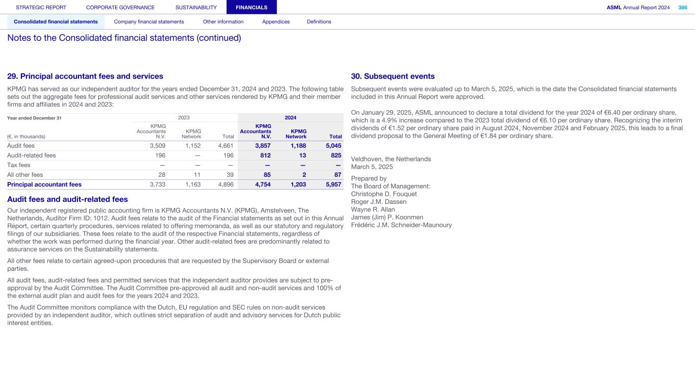 29. Principal accountant fees and services KPMG has served as our independent auditor for the years ended December 31, 2024 and 2023. The following table sets out the aggregate fees for professional audit services and other services rendered by KPMG and their member firms and affiliates in 2024 and 2023: Year ended December 31 2023 2024 (€, in thousands) KPMG Accountants N.V. KPMG Network Total KPMG Accountants N.V. KPMG Network Total Audit fees 3,509 1,152 4,661 3,857 1,188 5,045 Audit-related fees 196 — 196 812 13 825 Tax fees — — — — — — All other fees 28 11 39 85 2 87 Principal accountant fees 3,733 1,163 4,896 4,754 1,203 5,957 Audit fees and audit-related fees Our independent registered public accounting firm is KPMG Accountants N.V. (KPMG), Amstelveen, The Netherlands, Auditor Firm ID: 1012. Audit fees relate to the audit of the Financial statements as set out in this Annual Report, certain quarterly procedures, services related to offering memoranda, as well as our statutory and regulatory filings of our subsidiaries. These fees relate to the audit of the respective Financial statements, regardless of whether the work was performed during the financial year. Other audit-related fees are predominantly related to assurance services on the Sustainability statements. All other fees relate to certain agreed-upon procedures that are requested by the Supervisory Board or external parties. All audit fees, audit-related fees and permitted services that the independent auditor provides are subject to pre- approval by the Audit Committee. The Audit Committee pre-approved all audit and non-audit services and 100% of the external audit plan and audit fees for the years 2024 and 2023. The Audit Committee monitors compliance with the Dutch, EU regulation and SEC rules on non-audit services provided by an independent auditor, which outlines strict separation of audit and advisory services for Dutch public interest entities. 30. Subsequent events Subsequent events were evaluated up to March 5, 2025, which is the date the Consolidated financial statements included in this Annual Report were approved. On January 29, 2025, ASML announced to declare a total dividend for the year 2024 of €6.40 per ordinary share, which is a 4.9% increase compared to the 2023 total dividend of €6.10 per ordinary share. Recognizing the interim dividends of €1.52 per ordinary share paid in August 2024, November 2024 and February 2025, this leads to a final dividend proposal to the General Meeting of €1.84 per ordinary share. Veldhoven, the Netherlands March 5, 2025 Prepared by The Board of Management: Christophe D. Fouquet Roger J.M. Dassen Wayne R. Allan James (Jim) P. Koonmen Frédéric J.M. Schneider-Maunoury STRATEGIC REPORT CORPORATE GOVERNANCE SUSTAINABILITY FINANCIALS ASML Annual Report 2024 386 Consolidated financial statements Company financial statements Other information Appendices Definitions Notes to the Consolidated financial statements (continued)