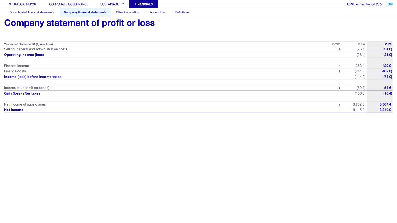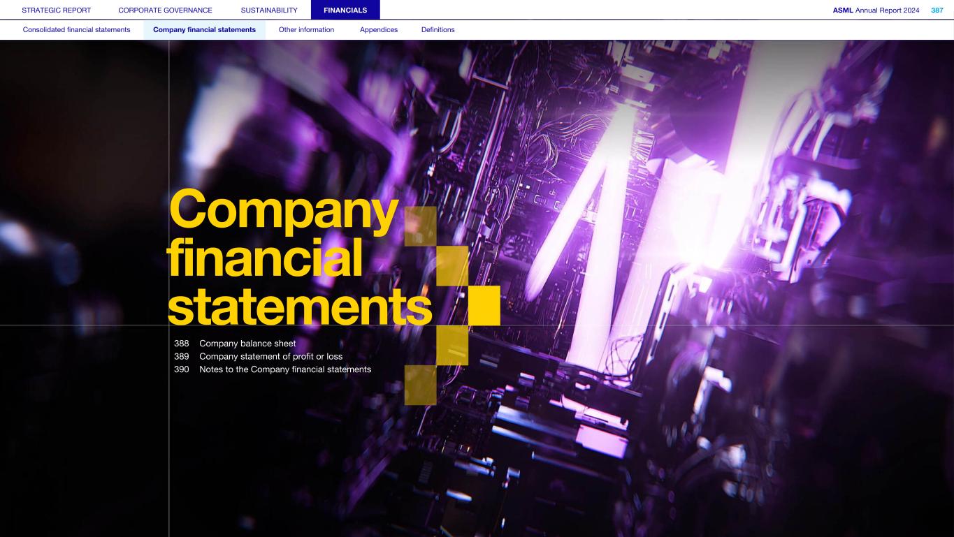 STRATEGIC REPORT CORPORATE GOVERNANCE SUSTAINABILITY FINANCIALS ASML Annual Report 2024 387 Consolidated financial statements Company financial statements Other information Appendices Definitions Company financial statements 388 Company balance sheet 389 Company statement of profit or loss 390 Notes to the Company financial statements