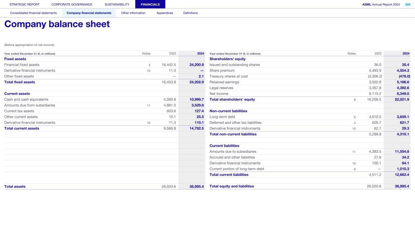 (Before appropriation of net income) Fixed assets Financial fixed assets 5 16,442.5 24,200.8 Derivative financial instruments 10 11.3 — Other fixed assets — 2.1 Total fixed assets 16,453.8 24,202.9 Current assets Cash and cash equivalents 4,060.8 10,999.7 Amounts due from subsidiaries 11 4,881.0 3,529.8 Current tax assets 603.6 127.4 Other current assets 10.1 25.5 Derivative financial instruments 10 11.3 110.1 Total current assets 9,566.8 14,792.5 Total assets 26,020.6 38,995.4 Year ended December 31 (€, in millions) Notes 2023 2024 Shareholders' equity Issued and outstanding shares 36.0 35.4 Share premium 4,493.9 4,554.3 Treasury shares at cost (3,306.2) (476.0) Retained earnings 3,502.8 5,166.6 Legal reserves 3,367.8 4,392.6 Net income 8,115.2 8,349.0 Total shareholders' equity 9 16,209.5 22,021.9 Non-current liabilities Long-term debt 6 4,610.5 3,659.1 Deferred and other tax liabilities 4 626.7 621.7 Derivative financial instruments 10 62.7 29.3 Total non-current liabilities 5,299.9 4,310.1 Current liabilities Amounts due to subsidiaries 11 4,383.5 11,554.8 Accrued and other liabilities 27.6 34.2 Derivative financial instruments 10 100.1 64.1 Current portion of long-term debt 6 — 1,010.3 Total current liabilities 4,511.2 12,663.4 Total equity and liabilities 26,020.6 38,995.4 Year ended December 31 (€, in millions) Notes 2023 2024 STRATEGIC REPORT CORPORATE GOVERNANCE SUSTAINABILITY FINANCIALS ASML Annual Report 2024 388 Consolidated financial statements Company financial statements Other information Appendices Definitions Company balance sheet