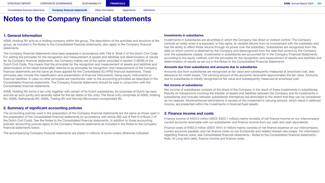 1. General Information ASML Holding NV acts as a holding company within the group. The description of the activities and structure of the group, as included in the Notes to the Consolidated financial statements, also apply to the Company financial statements. The Company financial statements have been prepared in accordance with Title 9, Book 2 of the Dutch Civil Code. For setting the principles for the recognition and measurement of assets and liabilities and determination of results for its Company financial statements, the Company makes use of the option provided in section 2:362(8) of the Dutch Civil Code. This means that the principles for the recognition and measurement of assets and liabilities and determination of the result (hereinafter referred to as principles for recognition and measurement) of the Company financial statements are the same as those applied for the Consolidated EU-IFRS financial statements. These principles also include the classification and presentation of financial instruments, being equity instruments or financial liabilities. In case no other principles are mentioned, refer to the accounting principles as described in the Consolidated financial statements. The Company financial statements should be read in conjunction with the Consolidated financial statements. ASML Holding NV forms a tax unity together with certain of its Dutch subsidiaries, for purposes of Dutch tax laws and are as such jointly and severally liable for the tax debts of the unity: The fiscal unity comprises of ASML Holding NV, ASML Netherlands BV, ASML Trading BV and Hermes Microvision Incorporated BV. 2. Summary of significant accounting policies The accounting policies used in the preparation of the Company financial statements are the same as those used in the preparation of the Consolidated financial statements (in accordance with article 362 sub 8 Part 9 of Book 2 of the Dutch Civil Code). See the Notes to the Consolidated financial statements. In addition to those accounting policies, accounting policies apply to the Company financial statements as included in the Notes to the Company financial statements below. The accompanying Company financial statements are stated in millions of euros unless otherwise indicated. Investments in subsidiaries Investments in subsidiaries are all entities in which the Company has direct or indirect control. The Company controls an entity when it is exposed, or has rights, to variable returns from its involvement with the subsidiary and has the ability to affect those returns through its power over the subsidiary. Subsidiaries are recognized from the date on which control is obtained by the Company and derecognized from the date that control by the Company over the subsidiaries ceases. Investments in subsidiaries are accounted for in the Company Financial Statements according to the equity method, with the principles for the recognition and measurement of assets and liabilities and determination of results as set out in the Notes to the Consolidated Financial Statements. Amounts due from subsidiaries and amounts due to subsidiaries Amounts due from subsidiaries are recognized at fair value and subsequently measured at amortized cost, less allowance for credit losses. The carrying amount of the accounts receivable approximates the fair value. Amounts due to subsidiaries is initially recognized at fair value and subsequently measured at amortized cost. Net income of subsidiaries Net income of subsidiaries consists of the share of the Company in the result of these investments in subsidiaries. Results on transactions involving the transfer of assets and liabilities between the Company and its investments in subsidiaries and mutually between subsidiaries themselves are eliminated to the extent that they can be considered as not realized. Aforementioned eliminations in excess of the investment's carrying amount, which result in deferred income, are presented within the investments in financial fixed assets. 3. Finance income and costs Finance income of €420.0 million (2023: €353.1 million) mainly consists of net finance income on our intercompany current accounts receivable with our subsidiaries, and finance income from our cash and cash equivalents. Finance costs of €462.0 million (2023: €441.0 million) mainly consists of net finance expense on our intercompany current accounts payable, and net finance costs on our Eurobonds and related interest rate swaps. For information regarding finance costs, see Consolidated financial statements - Notes to the Consolidated financial statements - Note 16 Long-term debt, finance income and finance costs. STRATEGIC REPORT CORPORATE GOVERNANCE SUSTAINABILITY FINANCIALS ASML Annual Report 2024 390 Consolidated financial statements Company financial statements Other information Appendices Definitions Notes to the Company financial statements