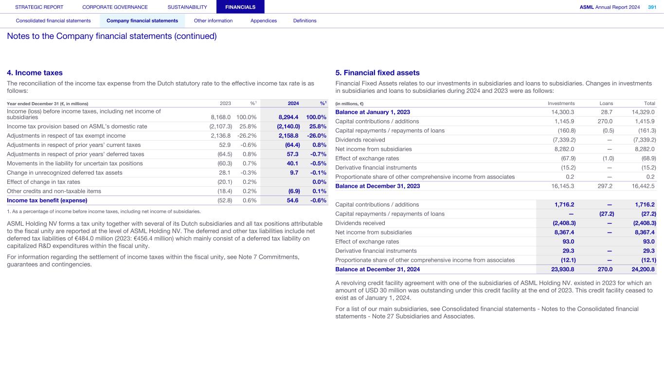 4. Income taxes The reconciliation of the income tax expense from the Dutch statutory rate to the effective income tax rate is as follows: Year ended December 31 (€, in millions) 2023 %1 2024 %1 Income (loss) before income taxes, including net income of subsidiaries 8,168.0 100.0% 8,294.4 100.0% Income tax provision based on ASML’s domestic rate (2,107.3) 25.8% (2,140.0) 25.8% Adjustments in respect of tax exempt income 2,136.8 -26.2% 2,158.8 -26.0% Adjustments in respect of prior years’ current taxes 52.9 -0.6% (64.4) 0.8% Adjustments in respect of prior years’ deferred taxes (64.5) 0.8% 57.3 -0.7% Movements in the liability for uncertain tax positions (60.3) 0.7% 40.1 -0.5% Change in unrecognized deferred tax assets 28.1 -0.3% 9.7 -0.1% Effect of change in tax rates (20.1) 0.2% 0.0% Other credits and non-taxable items (18.4) 0.2% (6.9) 0.1% Income tax benefit (expense) (52.8) 0.6% 54.6 -0.6% 1. As a percentage of income before income taxes, including net income of subsidiaries. ASML Holding NV forms a tax unity together with several of its Dutch subsidiaries and all tax positions attributable to the fiscal unity are reported at the level of ASML Holding NV. The deferred and other tax liabilities include net deferred tax liabilities of €484.0 million (2023: €456.4 million) which mainly consist of a deferred tax liability on capitalized R&D expenditures within the fiscal unity. For information regarding the settlement of income taxes within the fiscal unity, see Note 7 Commitments, guarantees and contingencies. 5. Financial fixed assets Financial Fixed Assets relates to our investments in subsidiaries and loans to subsidiaries. Changes in investments in subsidiaries and loans to subsidiaries during 2024 and 2023 were as follows: (in millions, €) Investments Loans Total Balance at January 1, 2023 14,300.3 28.7 14,329.0 Capital contributions / additions 1,145.9 270.0 1,415.9 Capital repayments / repayments of loans (160.8) (0.5) (161.3) Dividends received (7,339.2) — (7,339.2) Net income from subsidiaries 8,282.0 — 8,282.0 Effect of exchange rates (67.9) (1.0) (68.9) Derivative financial instruments (15.2) — (15.2) Proportionate share of other comprehensive income from associates 0.2 — 0.2 Balance at December 31, 2023 16,145.3 297.2 16,442.5 Capital contributions / additions 1,716.2 — 1,716.2 Capital repayments / repayments of loans — (27.2) (27.2) Dividends received (2,408.3) — (2,408.3) Net income from subsidiaries 8,367.4 — 8,367.4 Effect of exchange rates 93.0 93.0 Derivative financial instruments 29.3 — 29.3 Proportionate share of other comprehensive income from associates (12.1) — (12.1) Balance at December 31, 2024 23,930.8 270.0 24,200.8 A revolving credit facility agreement with one of the subsidiaries of ASML Holding NV. existed in 2023 for which an amount of USD 30 million was outstanding under this credit facility at the end of 2023. This credit facility ceased to exist as of January 1, 2024. For a list of our main subsidiaries, see Consolidated financial statements - Notes to the Consolidated financial statements - Note 27 Subsidiaries and Associates. STRATEGIC REPORT CORPORATE GOVERNANCE SUSTAINABILITY FINANCIALS ASML Annual Report 2024 391 Consolidated financial statements Company financial statements Other information Appendices Definitions Notes to the Company financial statements (continued)