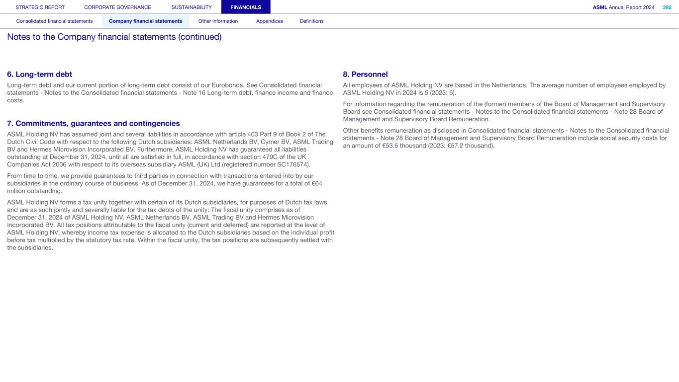 6. Long-term debt Long-term debt and our current portion of long-term debt consist of our Eurobonds. See Consolidated financial statements - Notes to the Consolidated financial statements - Note 16 Long-term debt, finance income and finance costs. 7. Commitments, guarantees and contingencies ASML Holding NV has assumed joint and several liabilities in accordance with article 403 Part 9 of Book 2 of The Dutch Civil Code with respect to the following Dutch subsidiaries: ASML Netherlands BV, Cymer BV, ASML Trading BV and Hermes Microvision Incorporated BV. Furthermore, ASML Holding NV has guaranteed all liabilities outstanding at December 31, 2024, until all are satisfied in full, in accordance with section 479C of the UK Companies Act 2006 with respect to its overseas subsidiary ASML (UK) Ltd.(registered number SC176574). From time to time, we provide guarantees to third parties in connection with transactions entered into by our subsidiaries in the ordinary course of business. As of December 31, 2024, we have guarantees for a total of €64 million outstanding. ASML Holding NV forms a tax unity together with certain of its Dutch subsidiaries, for purposes of Dutch tax laws and are as such jointly and severally liable for the tax debts of the unity: The fiscal unity comprises as of December 31, 2024 of ASML Holding NV, ASML Netherlands BV, ASML Trading BV and Hermes Microvision Incorporated BV. All tax positions attributable to the fiscal unity (current and deferred) are reported at the level of ASML Holding NV, whereby income tax expense is allocated to the Dutch subsidiaries based on the individual profit before tax multiplied by the statutory tax rate. Within the fiscal unity, the tax positions are subsequently settled with the subsidiaries. 8. Personnel All employees of ASML Holding NV are based in the Netherlands. The average number of employees employed by ASML Holding NV in 2024 is 5 (2023: 6). For information regarding the remuneration of the (former) members of the Board of Management and Supervisory Board see Consolidated financial statements - Notes to the Consolidated financial statements - Note 28 Board of Management and Supervisory Board Remuneration. Other benefits remuneration as disclosed in Consolidated financial statements - Notes to the Consolidated financial statements - Note 28 Board of Management and Supervisory Board Remuneration include social security costs for an amount of €53.6 thousand (2023: €57.2 thousand). STRATEGIC REPORT CORPORATE GOVERNANCE SUSTAINABILITY FINANCIALS ASML Annual Report 2024 392 Consolidated financial statements Company financial statements Other information Appendices Definitions Notes to the Company financial statements (continued)