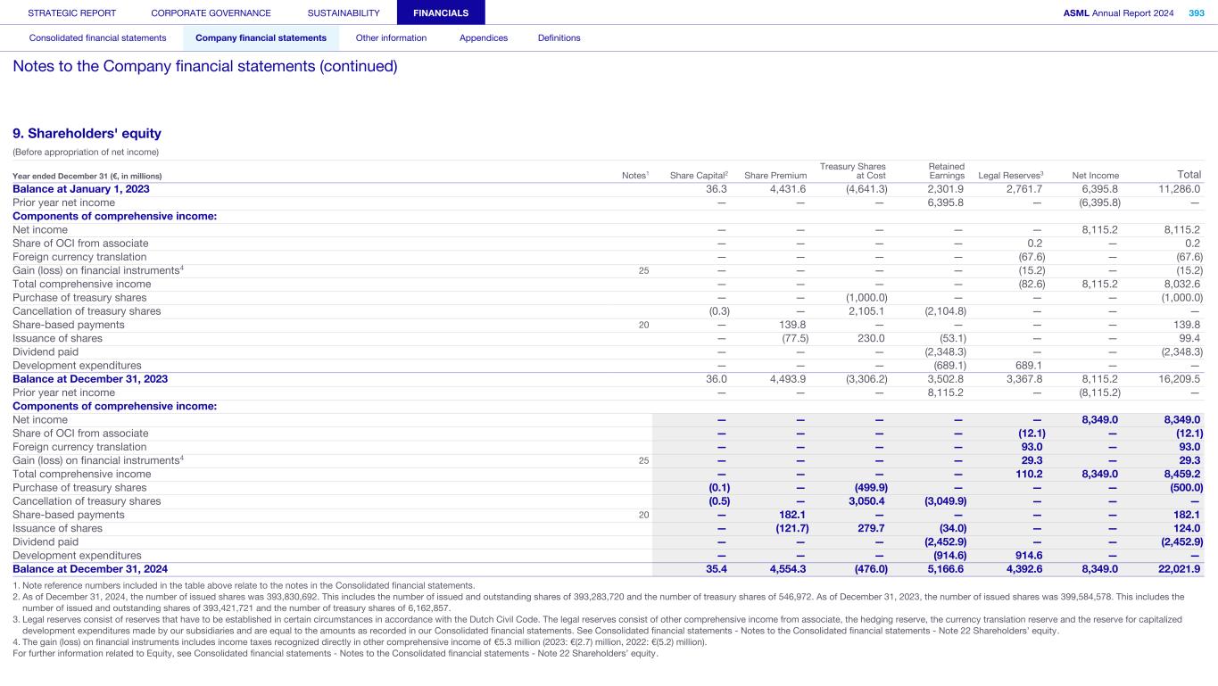 9. Shareholders' equity (Before appropriation of net income) Year ended December 31 (€, in millions) Notes1 Share Capital2 Share Premium Treasury Shares at Cost Retained Earnings Legal Reserves3 Net Income Total Balance at January 1, 2023 36.3 4,431.6 (4,641.3) 2,301.9 2,761.7 6,395.8 11,286.0 Prior year net income — — — 6,395.8 — (6,395.8) — Components of comprehensive income: Net income — — — — — 8,115.2 8,115.2 Share of OCI from associate — — — — 0.2 — 0.2 Foreign currency translation — — — — (67.6) — (67.6) Gain (loss) on financial instruments4 25 — — — — (15.2) — (15.2) Total comprehensive income — — — — (82.6) 8,115.2 8,032.6 Purchase of treasury shares — — (1,000.0) — — — (1,000.0) Cancellation of treasury shares (0.3) — 2,105.1 (2,104.8) — — — Share-based payments 20 — 139.8 — — — — 139.8 Issuance of shares — (77.5) 230.0 (53.1) — — 99.4 Dividend paid — — — (2,348.3) — — (2,348.3) Development expenditures — — — (689.1) 689.1 — — Balance at December 31, 2023 36.0 4,493.9 (3,306.2) 3,502.8 3,367.8 8,115.2 16,209.5 Prior year net income — — — 8,115.2 — (8,115.2) — Components of comprehensive income: Net income — — — — — 8,349.0 8,349.0 Share of OCI from associate — — — — (12.1) — (12.1) Foreign currency translation — — — — 93.0 — 93.0 Gain (loss) on financial instruments4 25 — — — — 29.3 — 29.3 Total comprehensive income — — — — 110.2 8,349.0 8,459.2 Purchase of treasury shares (0.1) — (499.9) — — — (500.0) Cancellation of treasury shares (0.5) — 3,050.4 (3,049.9) — — — Share-based payments 20 — 182.1 — — — — 182.1 Issuance of shares — (121.7) 279.7 (34.0) — — 124.0 Dividend paid — — — (2,452.9) — — (2,452.9) Development expenditures — — — (914.6) 914.6 — — Balance at December 31, 2024 35.4 4,554.3 (476.0) 5,166.6 4,392.6 8,349.0 22,021.9 1. Note reference numbers included in the table above relate to the notes in the Consolidated financial statements. 2. As of December 31, 2024, the number of issued shares was 393,830,692. This includes the number of issued and outstanding shares of 393,283,720 and the number of treasury shares of 546,972. As of December 31, 2023, the number of issued shares was 399,584,578. This includes the number of issued and outstanding shares of 393,421,721 and the number of treasury shares of 6,162,857. 3. Legal reserves consist of reserves that have to be established in certain circumstances in accordance with the Dutch Civil Code. The legal reserves consist of other comprehensive income from associate, the hedging reserve, the currency translation reserve and the reserve for capitalized development expenditures made by our subsidiaries and are equal to the amounts as recorded in our Consolidated financial statements. See Consolidated financial statements - Notes to the Consolidated financial statements - Note 22 Shareholders’ equity. 4. The gain (loss) on financial instruments includes income taxes recognized directly in other comprehensive income of €5.3 million (2023: €(2.7) million, 2022: €(5.2) million). For further information related to Equity, see Consolidated financial statements - Notes to the Consolidated financial statements - Note 22 Shareholders’ equity. STRATEGIC REPORT CORPORATE GOVERNANCE SUSTAINABILITY FINANCIALS ASML Annual Report 2024 393 Consolidated financial statements Company financial statements Other information Appendices Definitions Notes to the Company financial statements (continued)