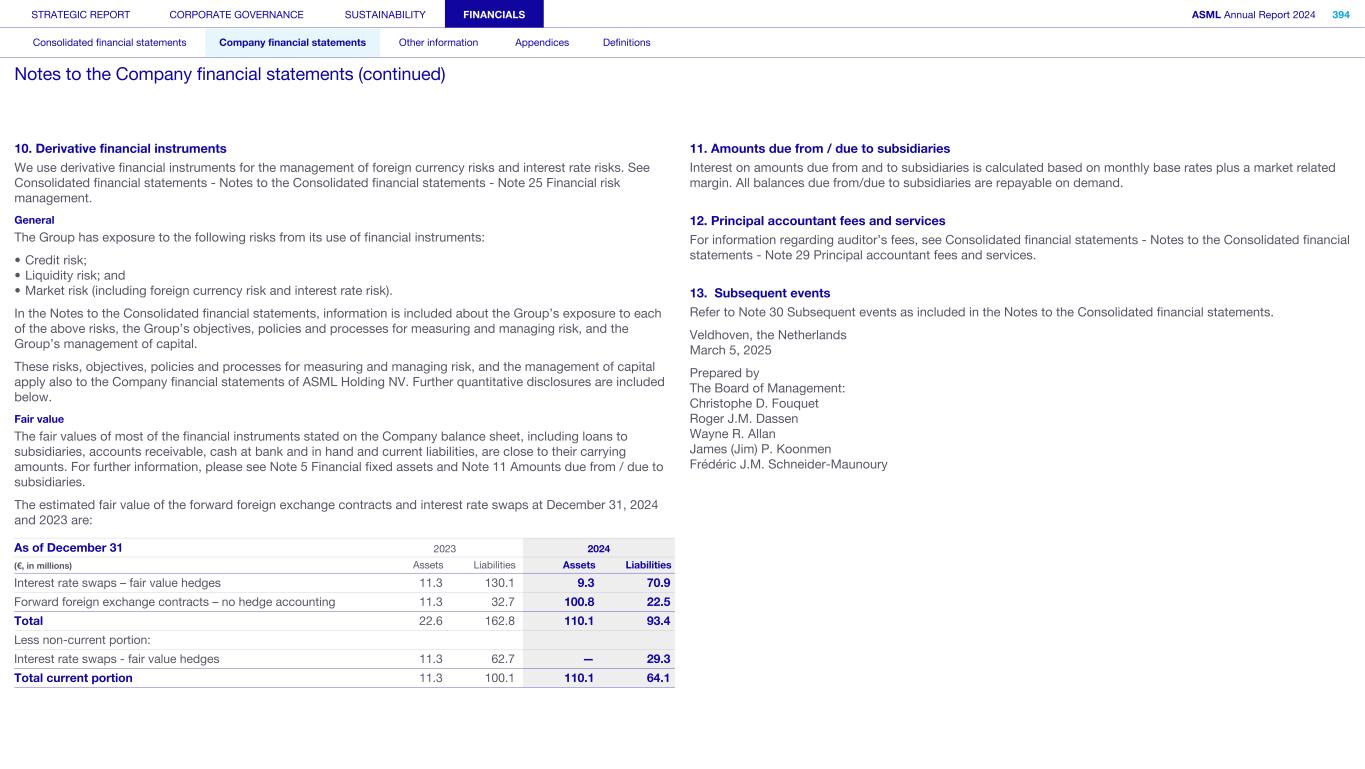 10. Derivative financial instruments We use derivative financial instruments for the management of foreign currency risks and interest rate risks. See Consolidated financial statements - Notes to the Consolidated financial statements - Note 25 Financial risk management. General The Group has exposure to the following risks from its use of financial instruments: • Credit risk; • Liquidity risk; and • Market risk (including foreign currency risk and interest rate risk). In the Notes to the Consolidated financial statements, information is included about the Group’s exposure to each of the above risks, the Group’s objectives, policies and processes for measuring and managing risk, and the Group’s management of capital. These risks, objectives, policies and processes for measuring and managing risk, and the management of capital apply also to the Company financial statements of ASML Holding NV. Further quantitative disclosures are included below. Fair value The fair values of most of the financial instruments stated on the Company balance sheet, including loans to subsidiaries, accounts receivable, cash at bank and in hand and current liabilities, are close to their carrying amounts. For further information, please see Note 5 Financial fixed assets and Note 11 Amounts due from / due to subsidiaries. The estimated fair value of the forward foreign exchange contracts and interest rate swaps at December 31, 2024 and 2023 are: As of December 31 2023 2024 (€, in millions) Assets Liabilities Assets Liabilities Interest rate swaps – fair value hedges 11.3 130.1 9.3 70.9 Forward foreign exchange contracts – no hedge accounting 11.3 32.7 100.8 22.5 Total 22.6 162.8 110.1 93.4 Less non-current portion: Interest rate swaps - fair value hedges 11.3 62.7 — 29.3 Total current portion 11.3 100.1 110.1 64.1 11. Amounts due from / due to subsidiaries Interest on amounts due from and to subsidiaries is calculated based on monthly base rates plus a market related margin. All balances due from/due to subsidiaries are repayable on demand. 12. Principal accountant fees and services For information regarding auditor’s fees, see Consolidated financial statements - Notes to the Consolidated financial statements - Note 29 Principal accountant fees and services. 13. Subsequent events Refer to Note 30 Subsequent events as included in the Notes to the Consolidated financial statements. Veldhoven, the Netherlands March 5, 2025 Prepared by The Board of Management: Christophe D. Fouquet Roger J.M. Dassen Wayne R. Allan James (Jim) P. Koonmen Frédéric J.M. Schneider-Maunoury STRATEGIC REPORT CORPORATE GOVERNANCE SUSTAINABILITY FINANCIALS ASML Annual Report 2024 394 Consolidated financial statements Company financial statements Other information Appendices Definitions Notes to the Company financial statements (continued)