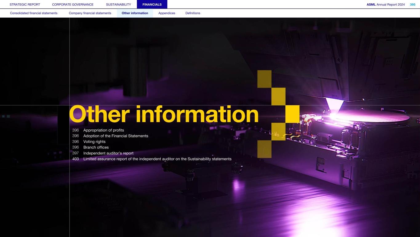 STRATEGIC REPORT CORPORATE GOVERNANCE SUSTAINABILITY FINANCIALS ASML Annual Report 2024 395 Consolidated financial statements Company financial statements Other information Appendices Definitions Other information 396 Appropriation of profits 396 Adoption of the Financial Statements 396 Voting rights 396 Branch offices 397 Independent auditor’s report 403 Limited assurance report of the independent auditor on the Sustainability statements