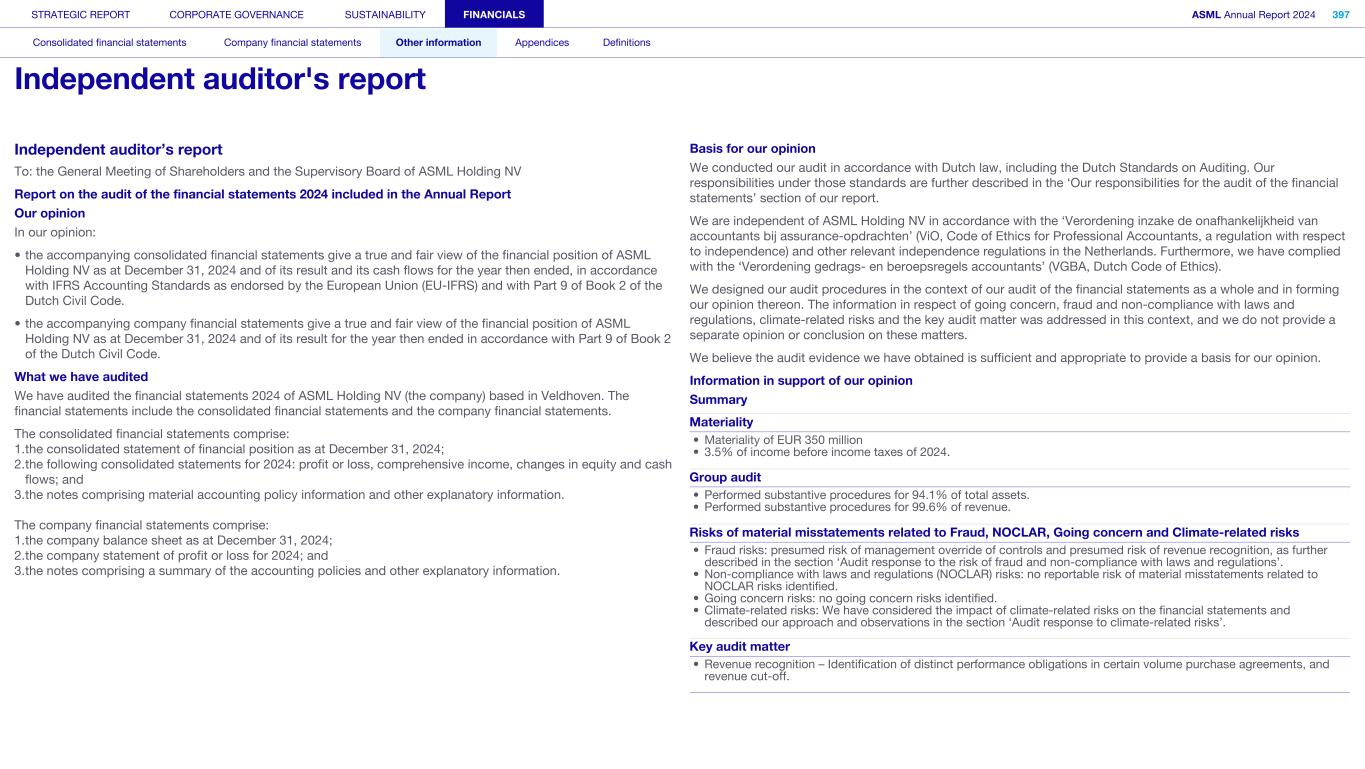 Independent auditor’s report To: the General Meeting of Shareholders and the Supervisory Board of ASML Holding NV Report on the audit of the financial statements 2024 included in the Annual Report Our opinion In our opinion: • the accompanying consolidated financial statements give a true and fair view of the financial position of ASML Holding NV as at December 31, 2024 and of its result and its cash flows for the year then ended, in accordance with IFRS Accounting Standards as endorsed by the European Union (EU-IFRS) and with Part 9 of Book 2 of the Dutch Civil Code. • the accompanying company financial statements give a true and fair view of the financial position of ASML Holding NV as at December 31, 2024 and of its result for the year then ended in accordance with Part 9 of Book 2 of the Dutch Civil Code. What we have audited We have audited the financial statements 2024 of ASML Holding NV (the company) based in Veldhoven. The financial statements include the consolidated financial statements and the company financial statements. The consolidated financial statements comprise: 1.the consolidated statement of financial position as at December 31, 2024; 2.the following consolidated statements for 2024: profit or loss, comprehensive income, changes in equity and cash flows; and 3.the notes comprising material accounting policy information and other explanatory information. The company financial statements comprise: 1.the company balance sheet as at December 31, 2024; 2.the company statement of profit or loss for 2024; and 3.the notes comprising a summary of the accounting policies and other explanatory information. Basis for our opinion We conducted our audit in accordance with Dutch law, including the Dutch Standards on Auditing. Our responsibilities under those standards are further described in the ‘Our responsibilities for the audit of the financial statements’ section of our report. We are independent of ASML Holding NV in accordance with the ‘Verordening inzake de onafhankelijkheid van accountants bij assurance-opdrachten’ (ViO, Code of Ethics for Professional Accountants, a regulation with respect to independence) and other relevant independence regulations in the Netherlands. Furthermore, we have complied with the ‘Verordening gedrags- en beroepsregels accountants’ (VGBA, Dutch Code of Ethics). We designed our audit procedures in the context of our audit of the financial statements as a whole and in forming our opinion thereon. The information in respect of going concern, fraud and non-compliance with laws and regulations, climate-related risks and the key audit matter was addressed in this context, and we do not provide a separate opinion or conclusion on these matters. We believe the audit evidence we have obtained is sufficient and appropriate to provide a basis for our opinion. Information in support of our opinion Summary Materiality • Materiality of EUR 350 million • 3.5% of income before income taxes of 2024. Group audit • Performed substantive procedures for 94.1% of total assets. • Performed substantive procedures for 99.6% of revenue. Risks of material misstatements related to Fraud, NOCLAR, Going concern and Climate-related risks • Fraud risks: presumed risk of management override of controls and presumed risk of revenue recognition, as further described in the section ‘Audit response to the risk of fraud and non-compliance with laws and regulations’. • Non-compliance with laws and regulations (NOCLAR) risks: no reportable risk of material misstatements related to NOCLAR risks identified. • Going concern risks: no going concern risks identified. • Climate-related risks: We have considered the impact of climate-related risks on the financial statements and described our approach and observations in the section ‘Audit response to climate-related risks’. Key audit matter • Revenue recognition – Identification of distinct performance obligations in certain volume purchase agreements, and revenue cut-off. STRATEGIC REPORT CORPORATE GOVERNANCE SUSTAINABILITY FINANCIALS ASML Annual Report 2024 397 Consolidated financial statements Company financial statements Other information Appendices Definitions Independent auditor's report